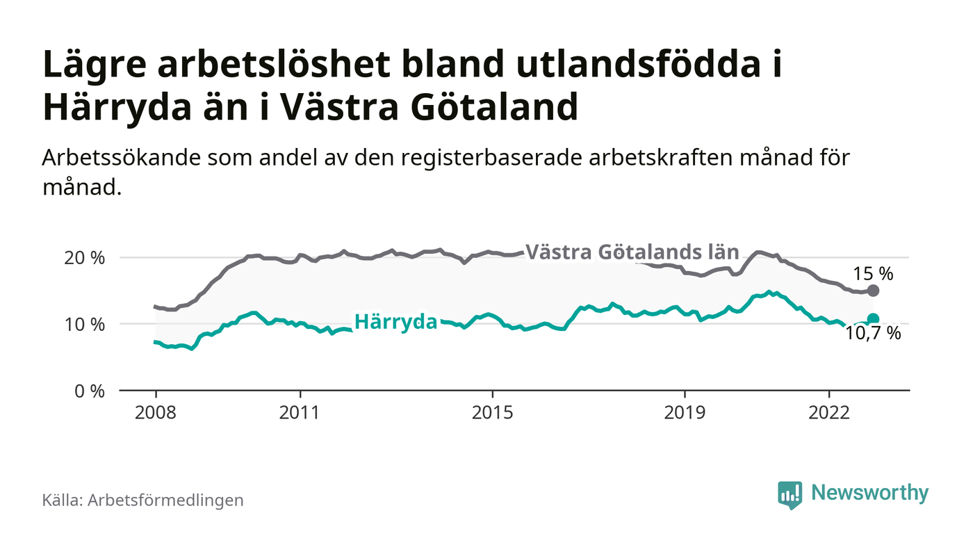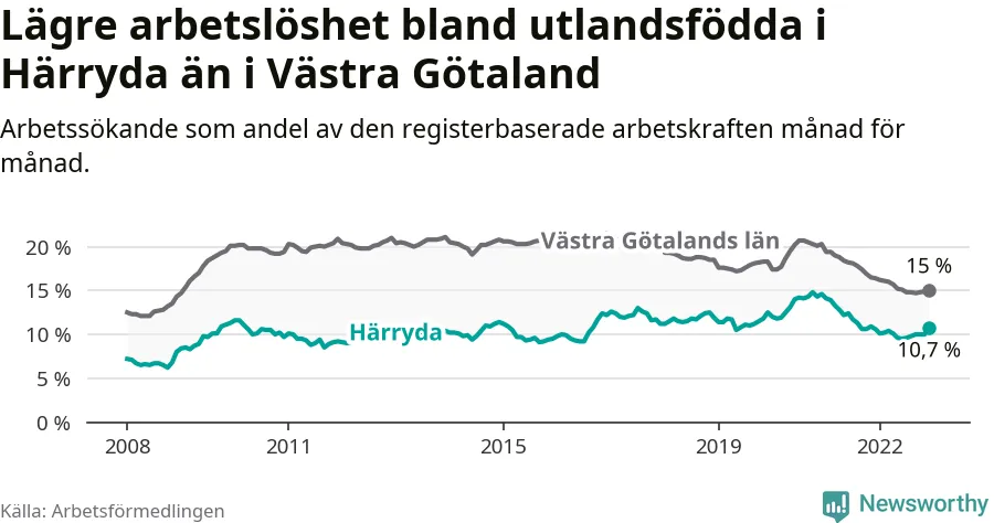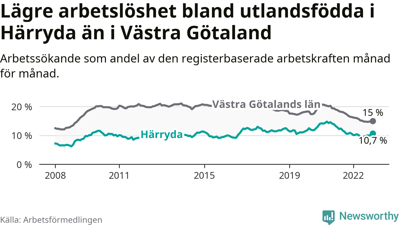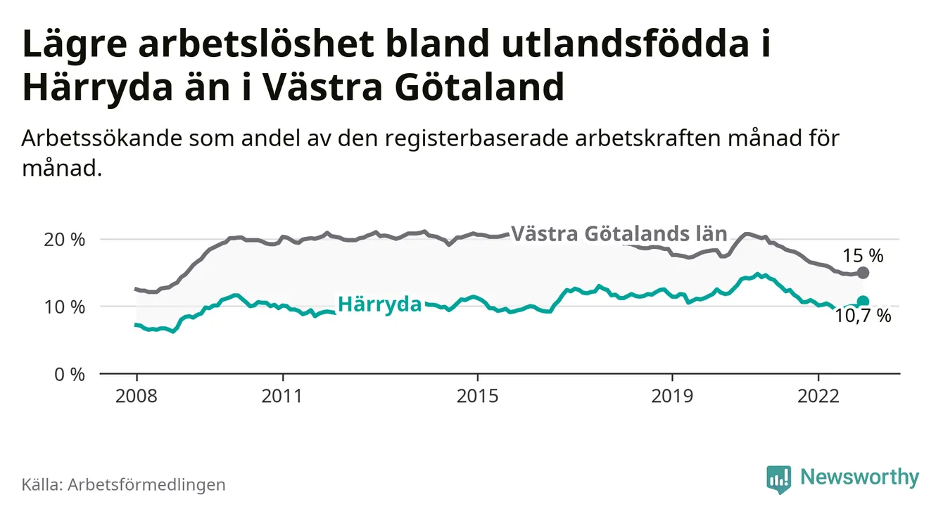 Medan arbetslösheten bland utlandsfödda alltså ökar i Härryda så minskar den i Västra Götaland. Jämfört med december förra året har andelen arbetslösa utlandsfödda i länet minskat med 1,4 procentenheter (till 15,0 procent). Trots den senaste uppgången har Härryda med andra ord fortfarande lägre arbetslöshet bland utlandsfödda än Västra Götaland.