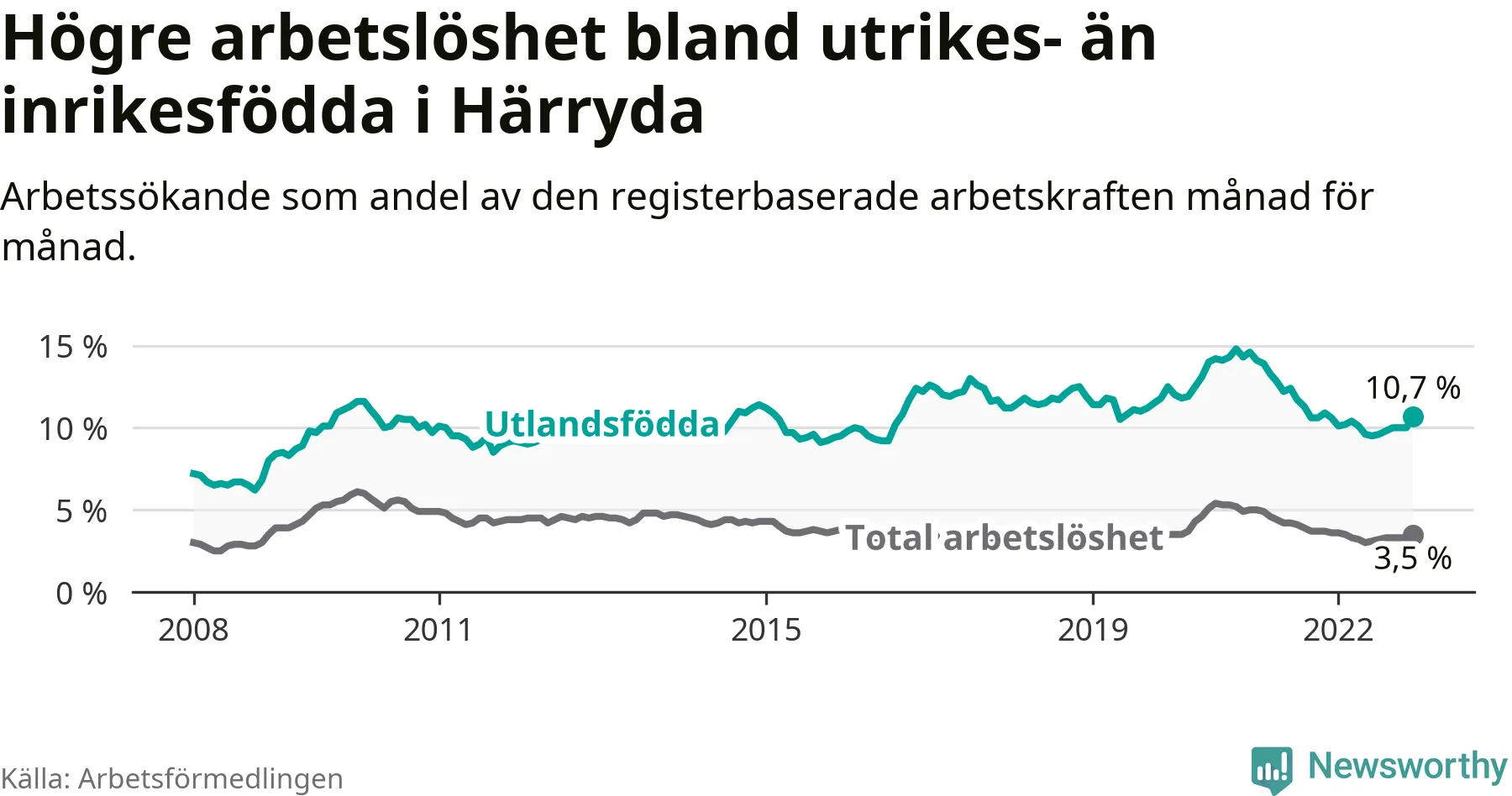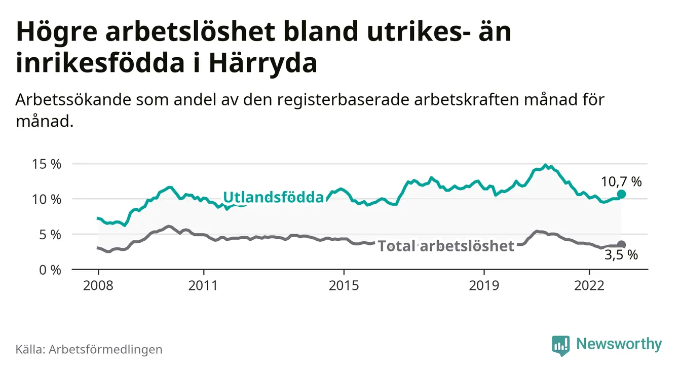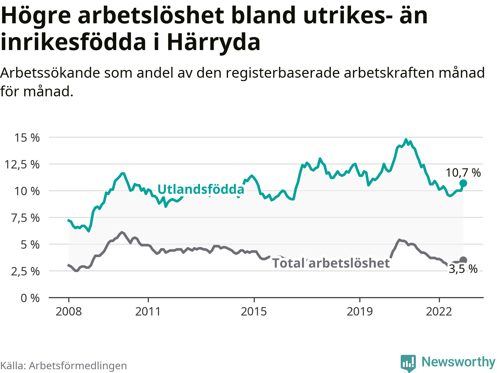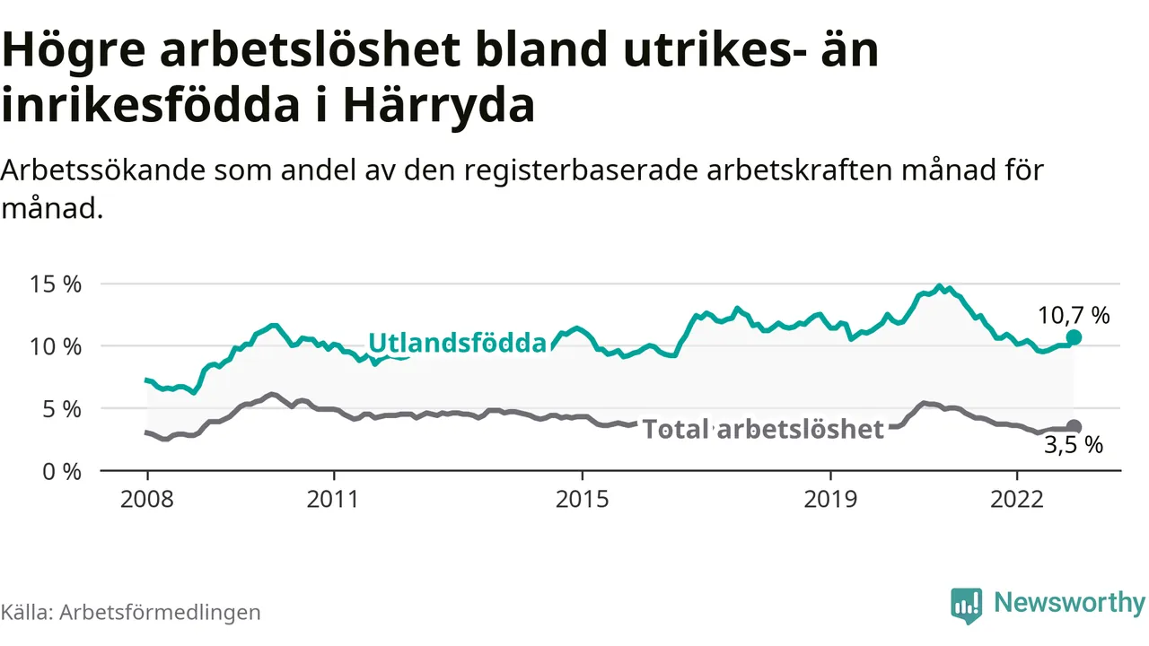 Medan arbetslösheten bland utlandsfödda alltså ökar i Härryda så minskar den i Västra Götaland. Jämfört med december förra året har andelen arbetslösa utlandsfödda i länet minskat med 1,4 procentenheter (till 15,0 procent). Trots den senaste uppgången har Härryda med andra ord fortfarande lägre arbetslöshet bland utlandsfödda än Västra Götaland.