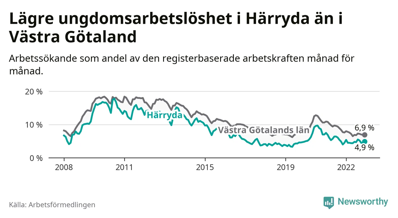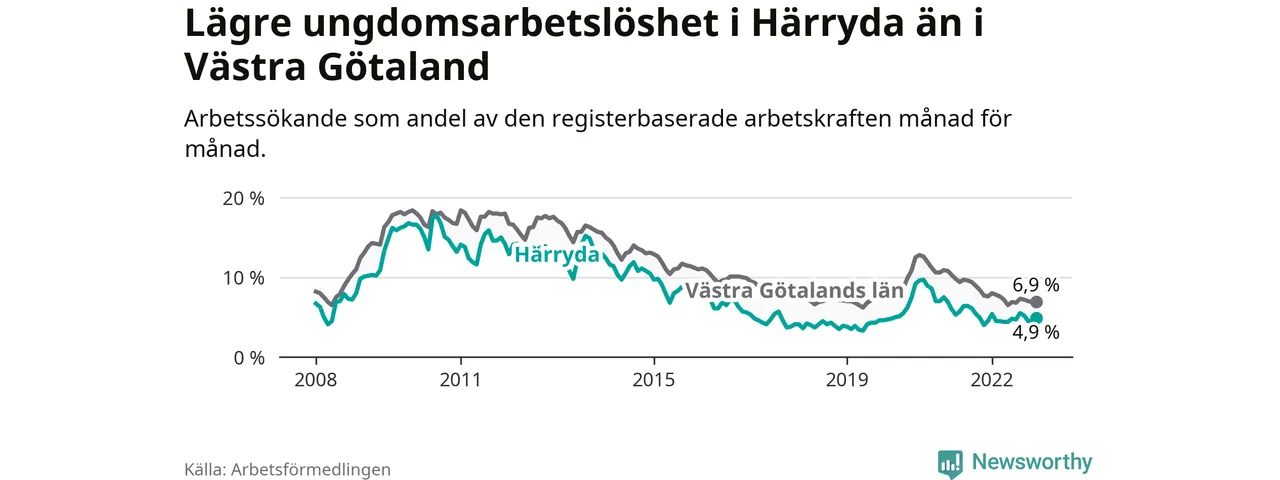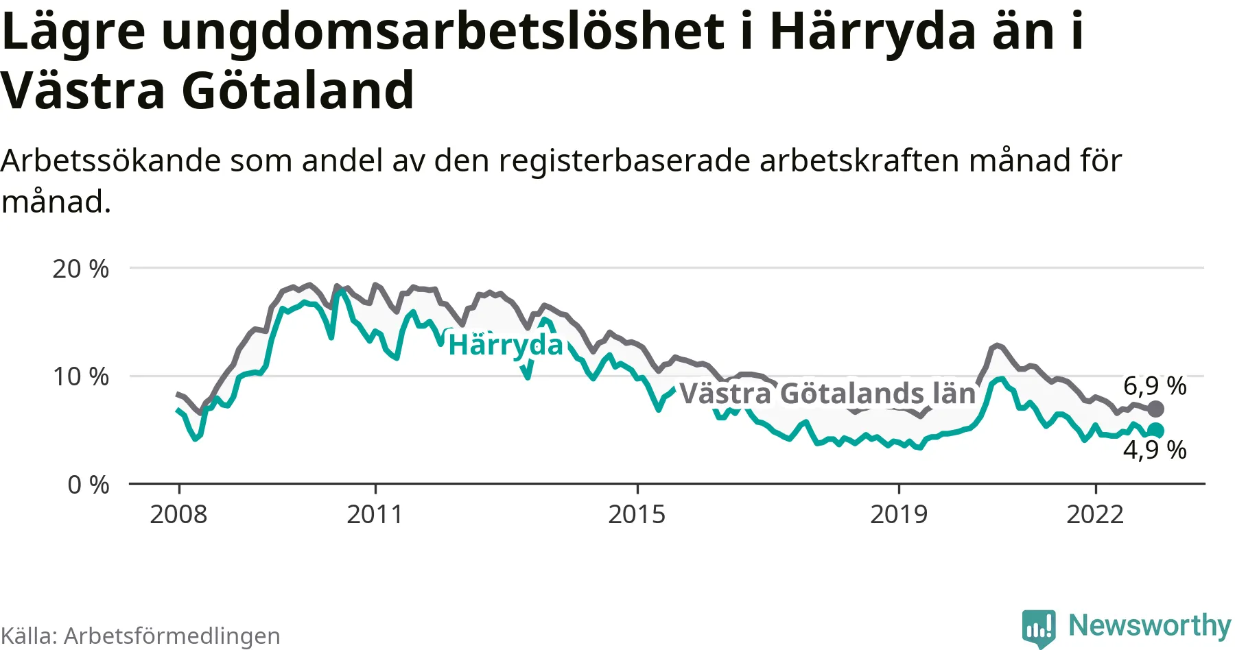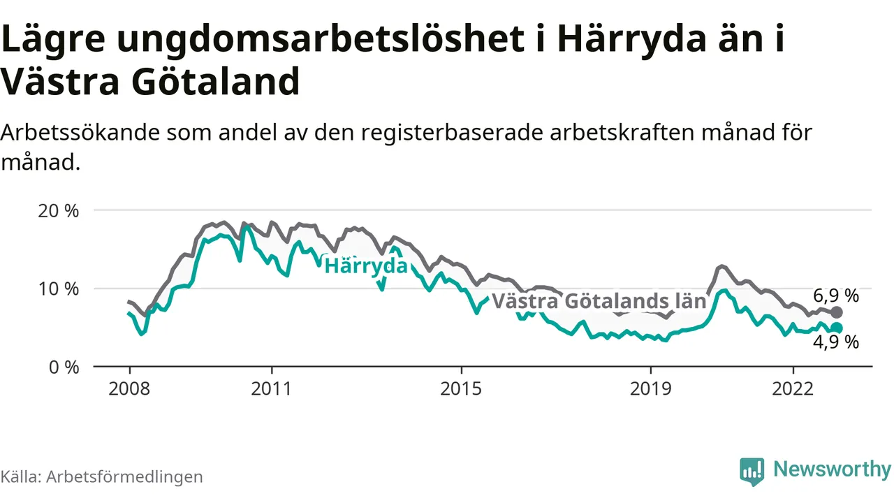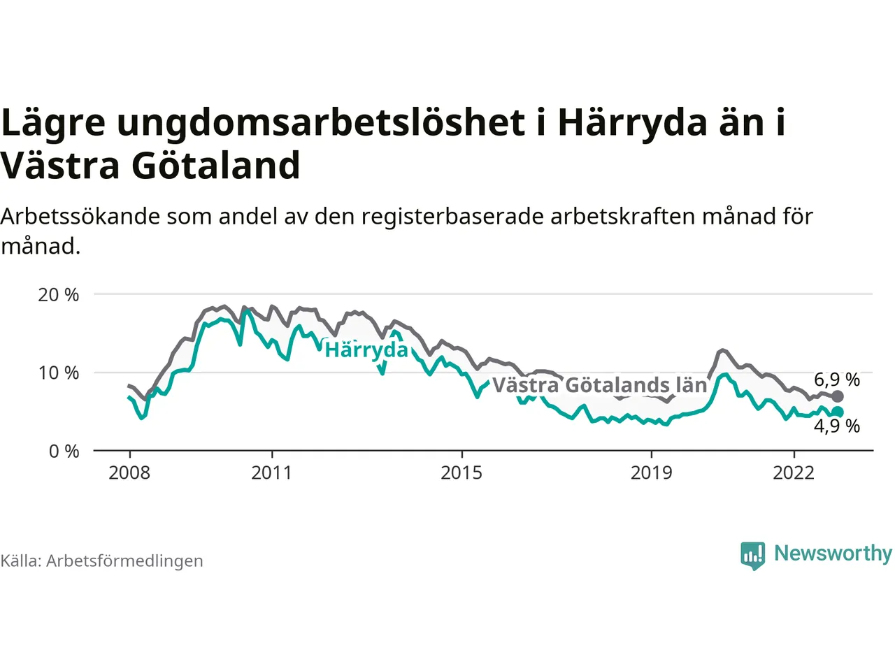 Precis som den totala arbetslösheten ligger ungdomsarbetslösheten i Härryda lägre än i Västra Götaland som helhet. Skillnaden mellan kommunen och länet är 2,0 procentenheter.