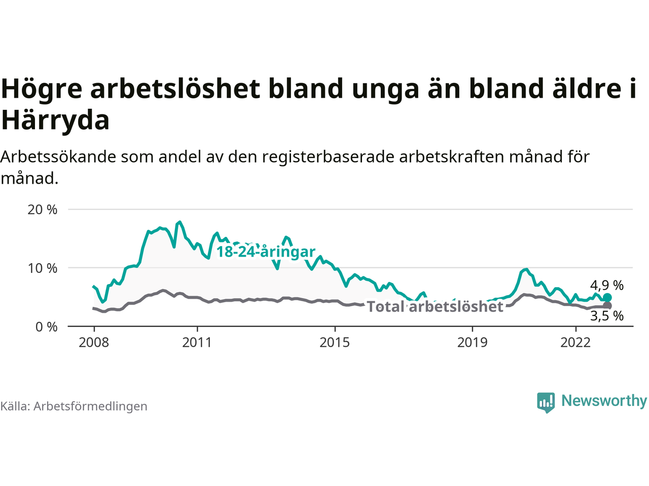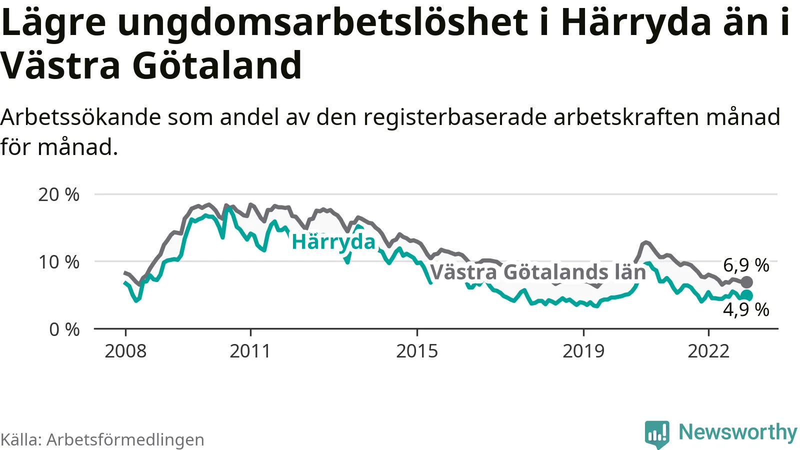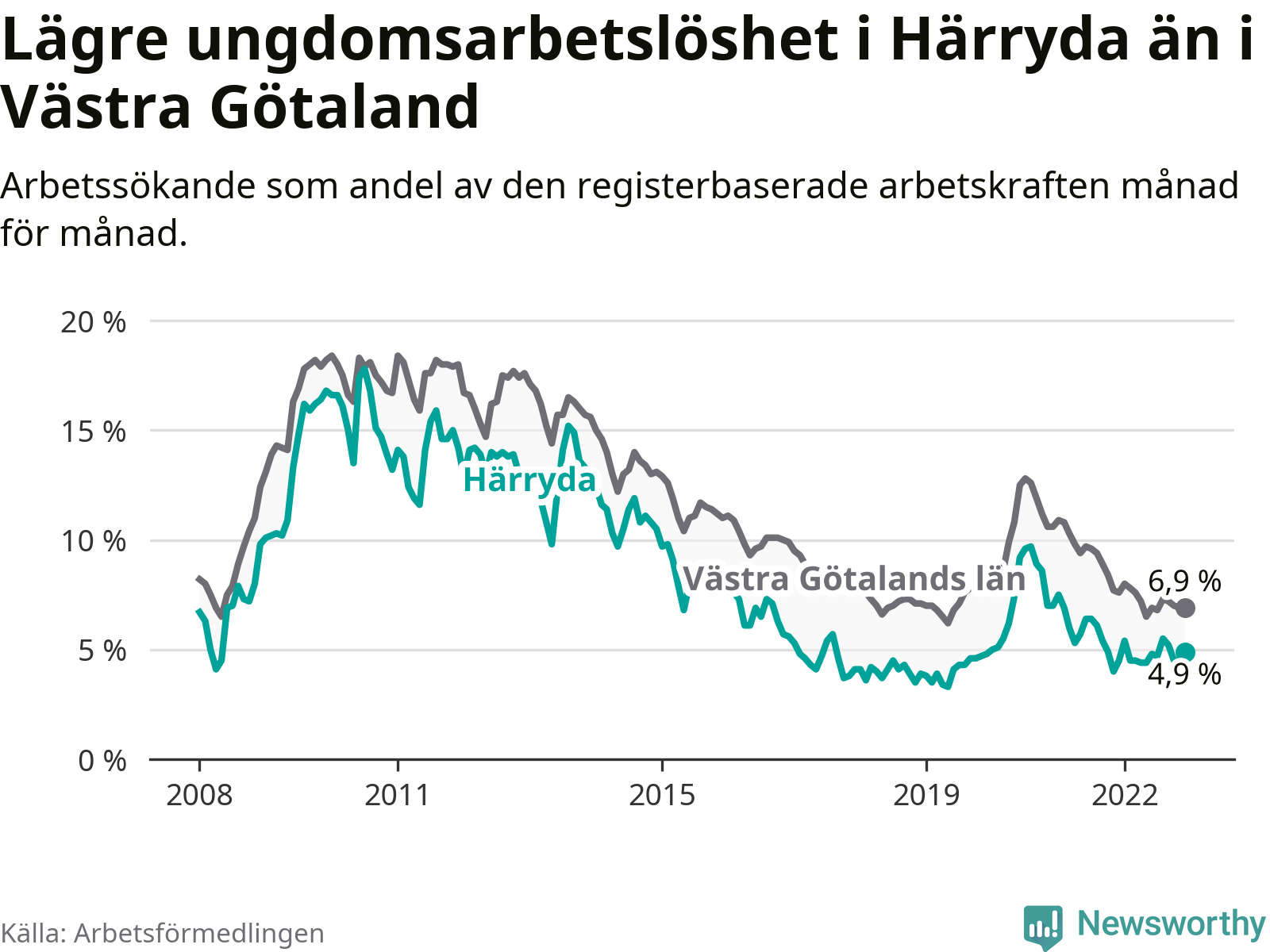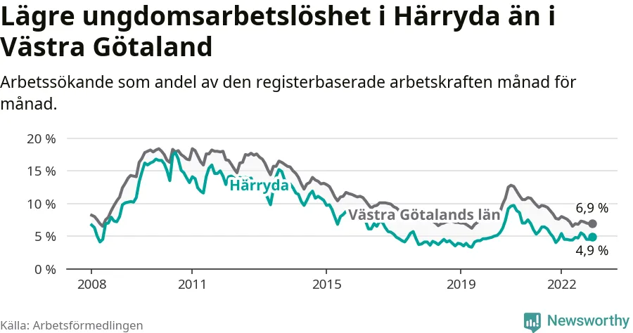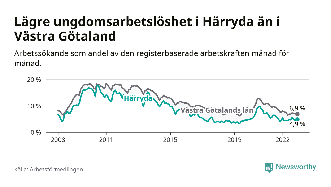 Precis som den totala arbetslösheten ligger ungdomsarbetslösheten i Härryda lägre än i Västra Götaland som helhet. Skillnaden mellan kommunen och länet är 2,0 procentenheter.