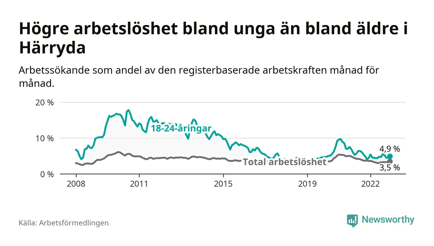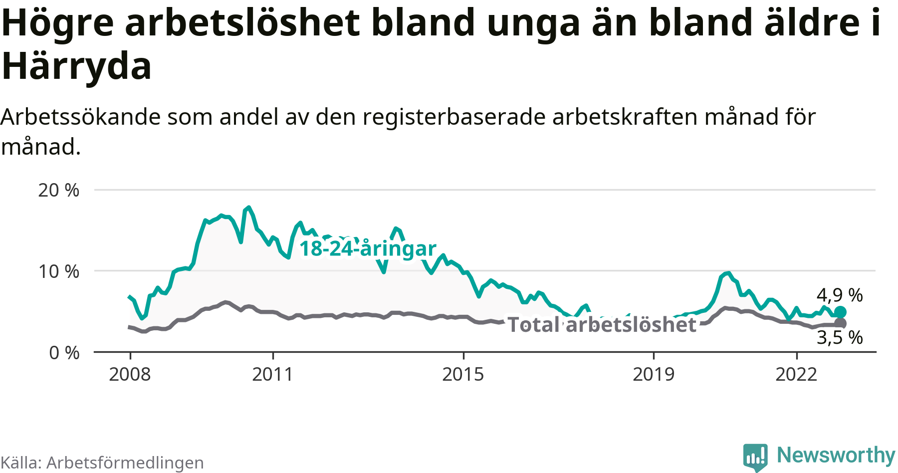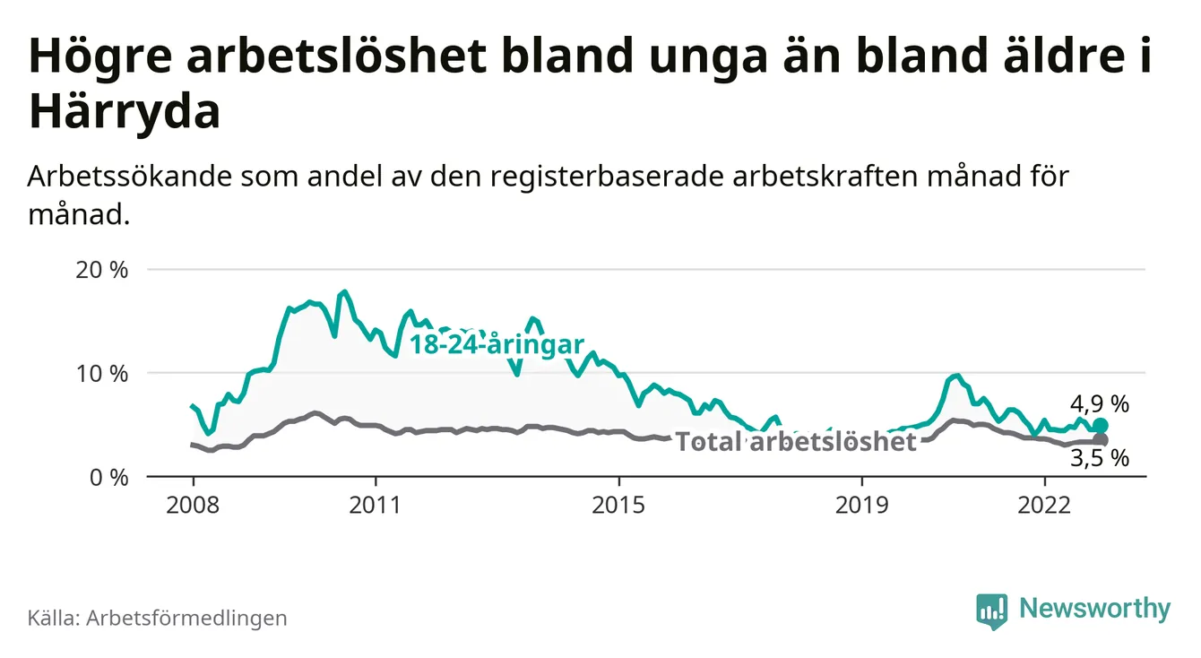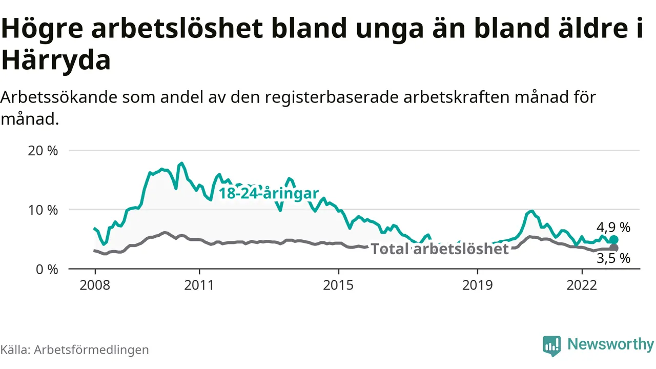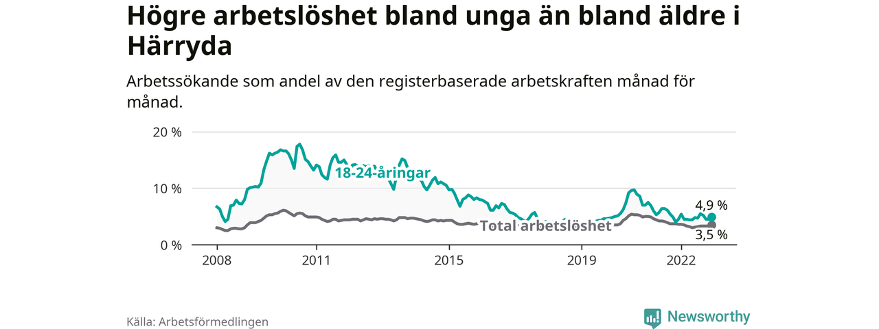 Precis som den totala arbetslösheten ligger ungdomsarbetslösheten i Härryda lägre än i Västra Götaland som helhet. Skillnaden mellan kommunen och länet är 2,0 procentenheter.