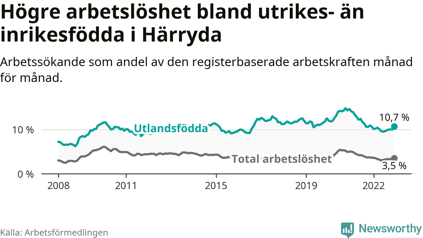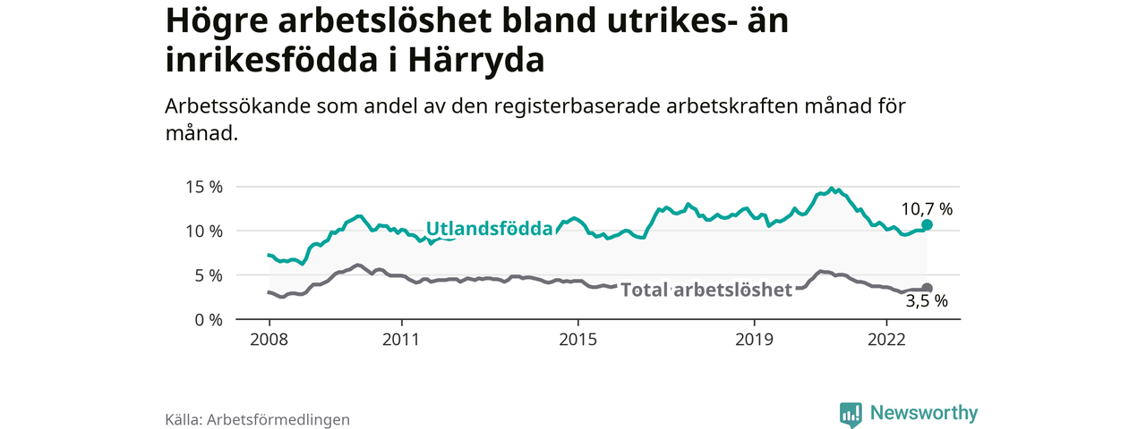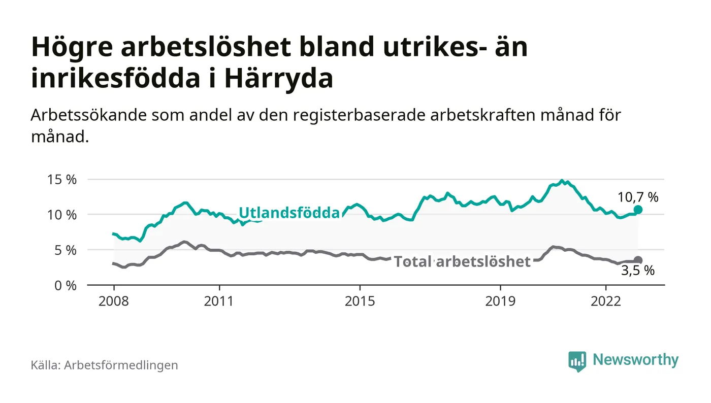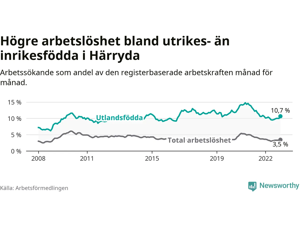 Arbetslösheten bland utlandsfödda var 10,7 procent i Härryda under december månad, motsvarande 297 av 2 776 personer. Det är 0,1 procentenheter fler än vid samma tidpunkt i fjol (+11 om man räknar personer). Den senaste månadens uppgång innebär ett trendbrott. Under de 19 föregående månaderna hade arbetslösheten bland utlandsfödda varit lägre än motsvarande tidpunkt året innan.