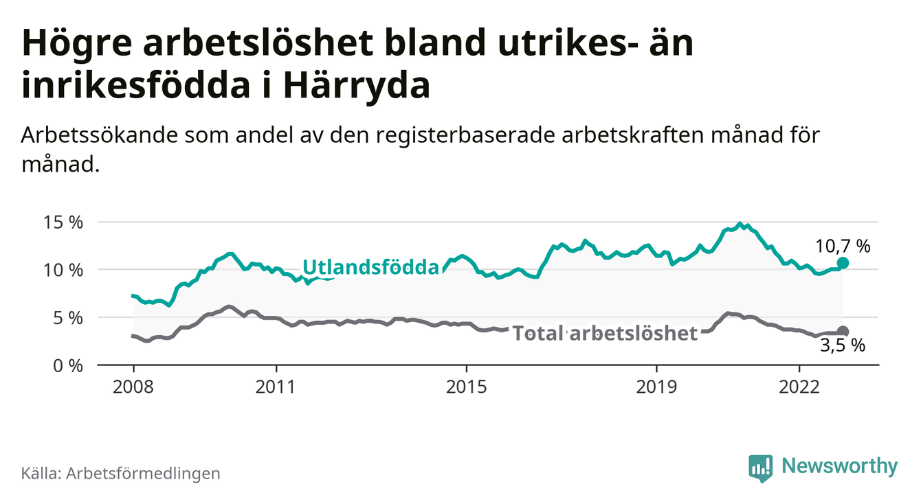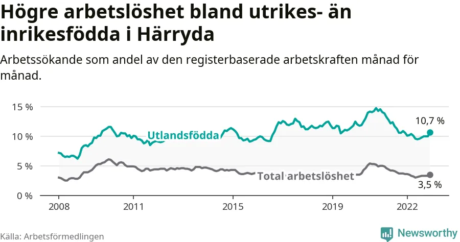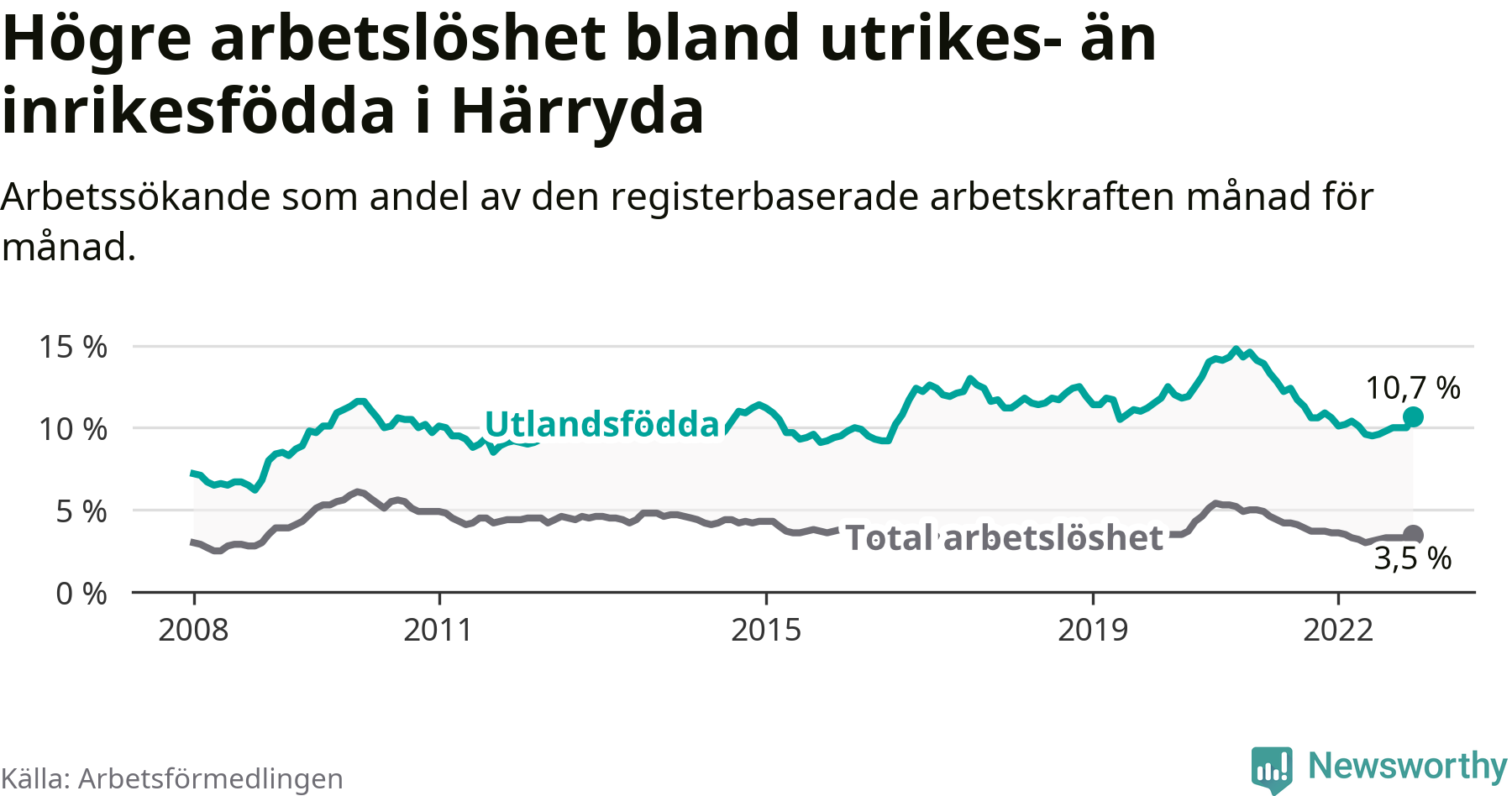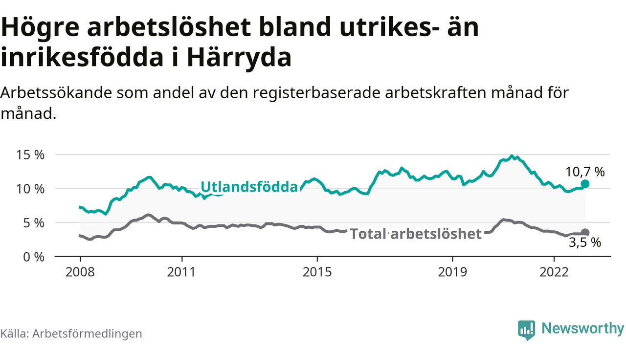 Arbetslösheten bland utlandsfödda var 10,7 procent i Härryda under december månad, motsvarande 297 av 2 776 personer. Det är 0,1 procentenheter fler än vid samma tidpunkt i fjol (+11 om man räknar personer). Den senaste månadens uppgång innebär ett trendbrott. Under de 19 föregående månaderna hade arbetslösheten bland utlandsfödda varit lägre än motsvarande tidpunkt året innan.