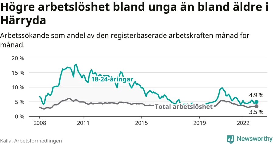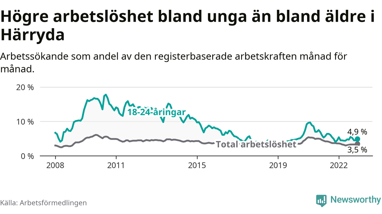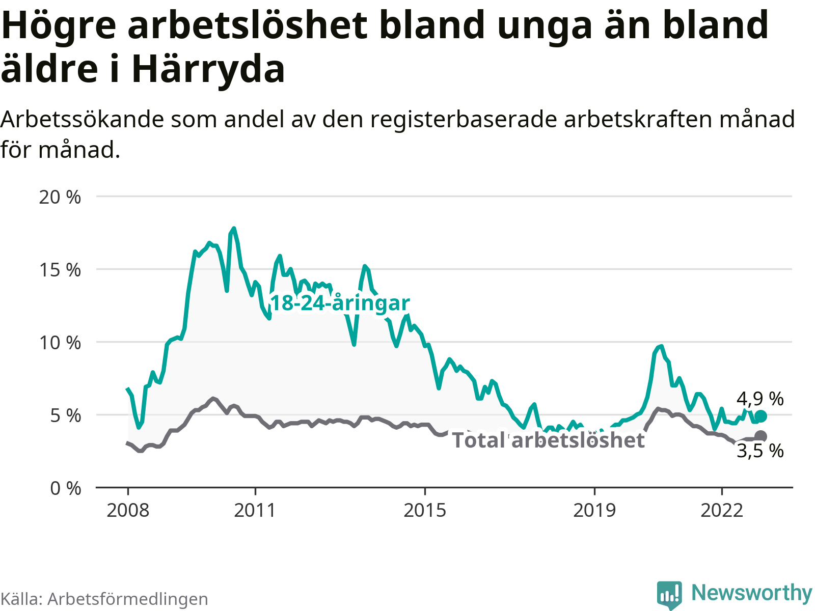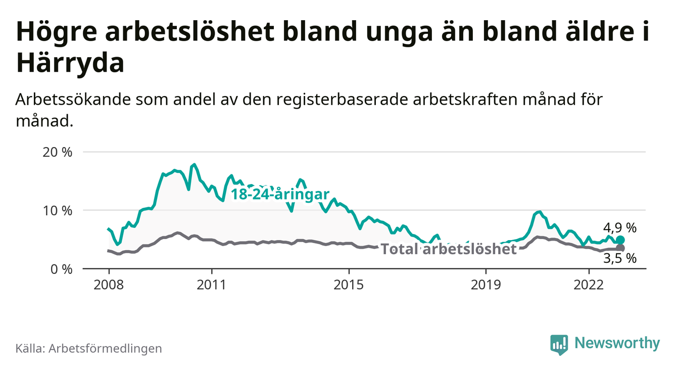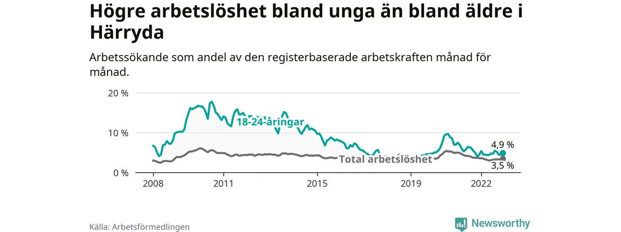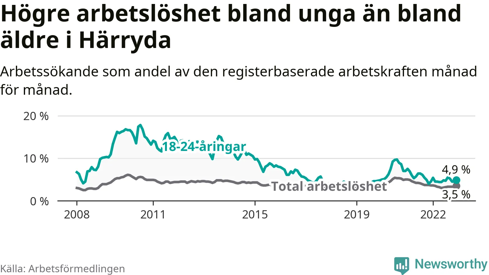 Till skillnad från den totala arbetslösheten stiger arbetslösheten bland unga (+0,4 procentenheter). I december var 4,9 procent av 18–24-åringarna inskrivna som arbetssökande (motsvarande 72 personer). Mäter vi antalet inskrivna ser vi en minskning med tre personer på ett års sikt.