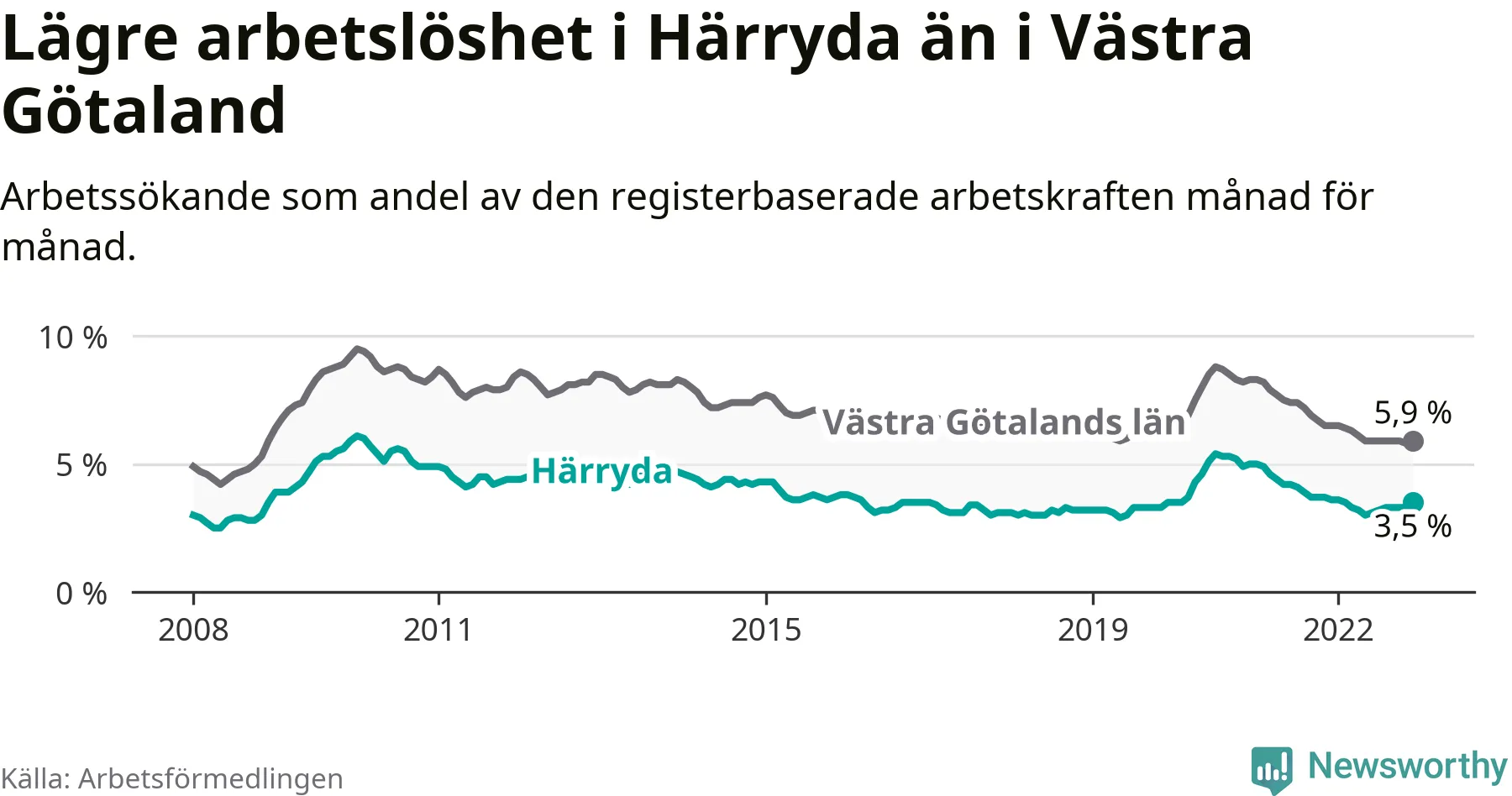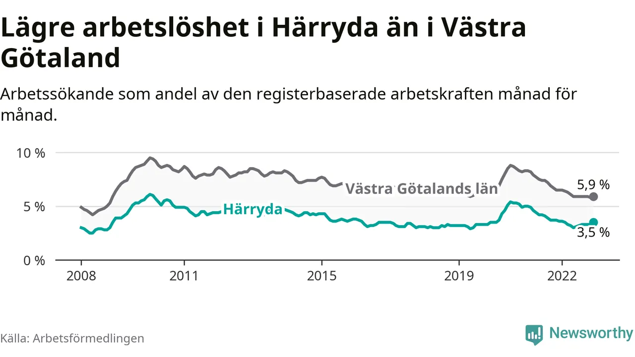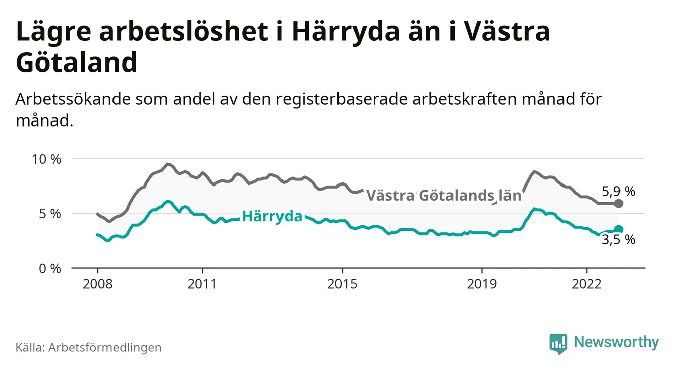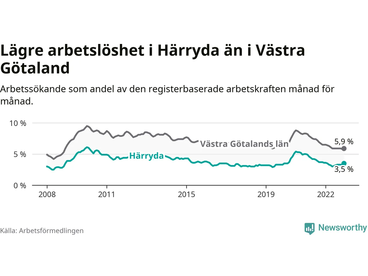Härryda hade redan tidigare lägre arbetslöshet än snittet i hela Västra Götalands län och nu växer klyftan (3,5 procent i kommunen, jämfört med 5,9 procent i hela länet). Tjörn och Öckerö har den lägsta arbetslösheten i länet (2,6 procent), medan Trollhättan har den högsta (9,1 procent). För att Härryda skulle komma ner i samma arbetslöshetsnivå som Tjörn och Öckerö skulle 172 personer behöva sysselsättas.