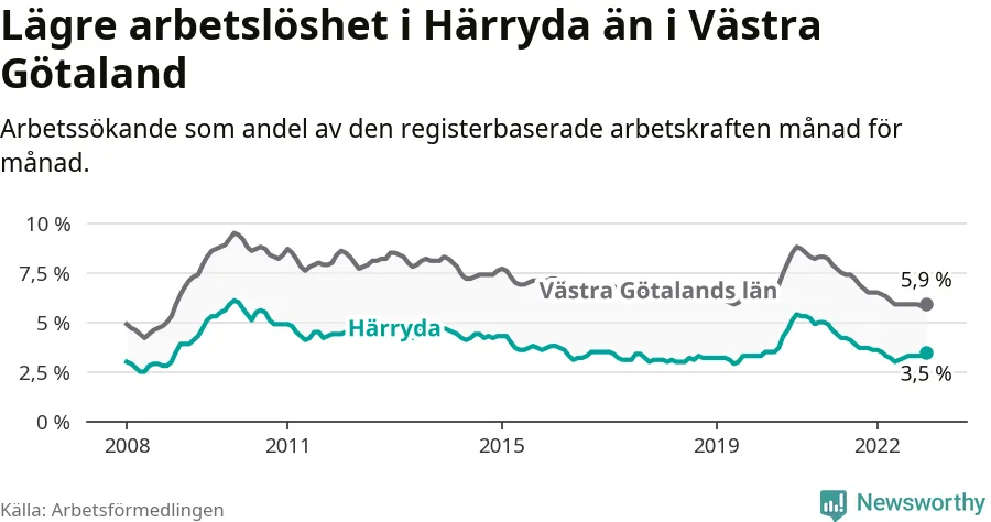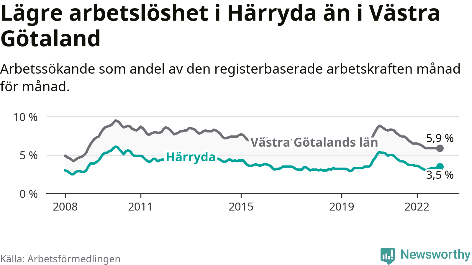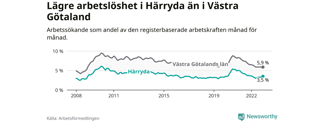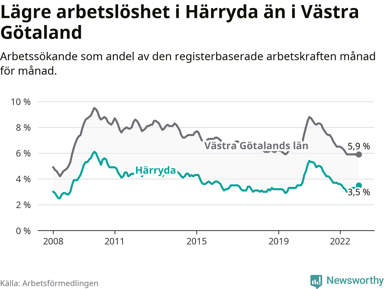 Härryda hade redan tidigare lägre arbetslöshet än snittet i hela Västra Götalands län och nu växer klyftan (3,5 procent i kommunen, jämfört med 5,9 procent i hela länet). Tjörn och Öckerö har den lägsta arbetslösheten i länet (2,6 procent), medan Trollhättan har den högsta (9,1 procent). För att Härryda skulle komma ner i samma arbetslöshetsnivå som Tjörn och Öckerö skulle 172 personer behöva sysselsättas.
