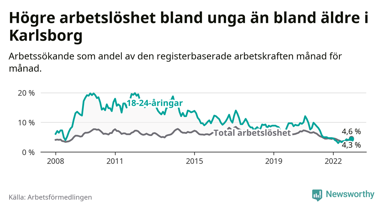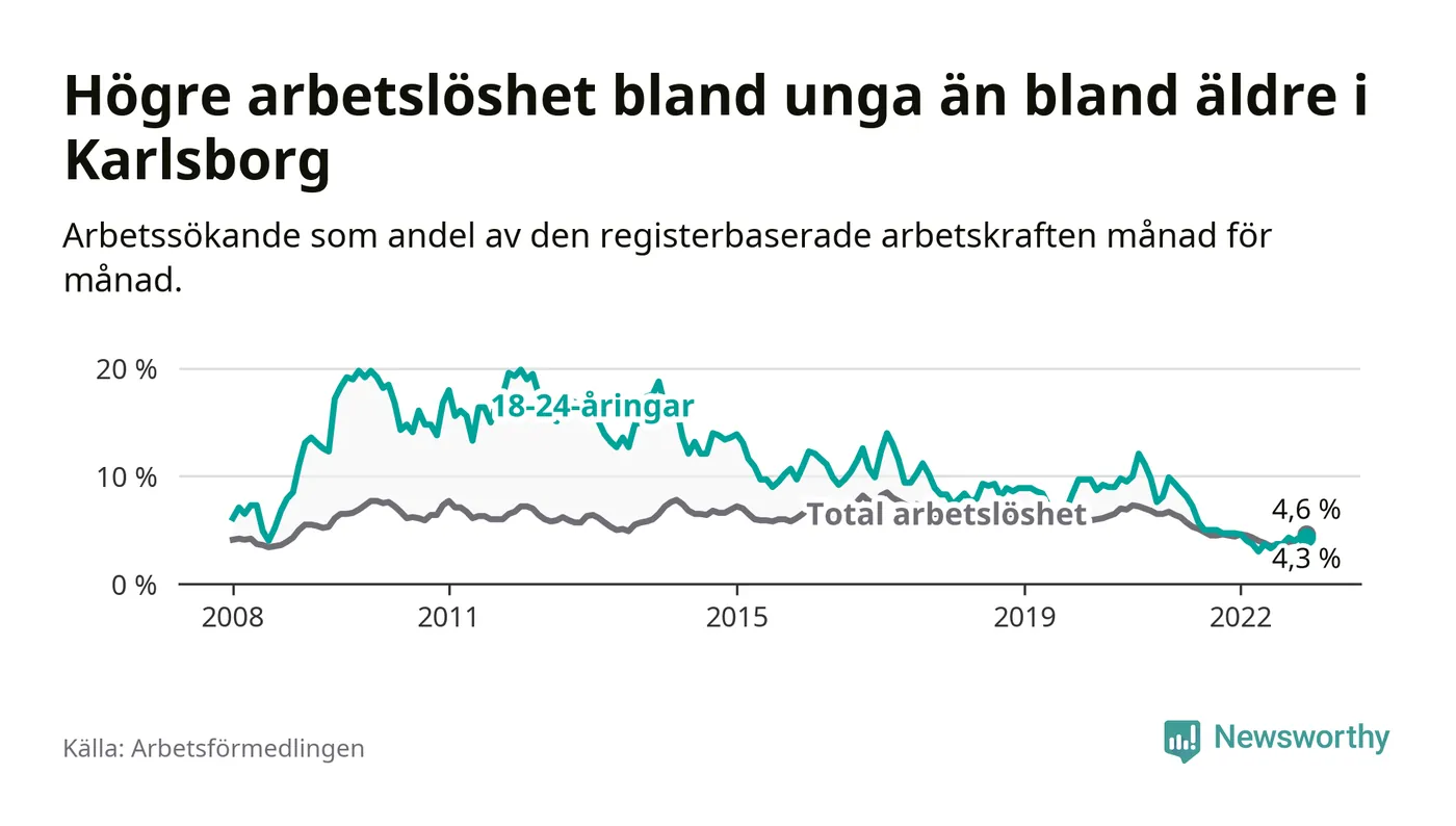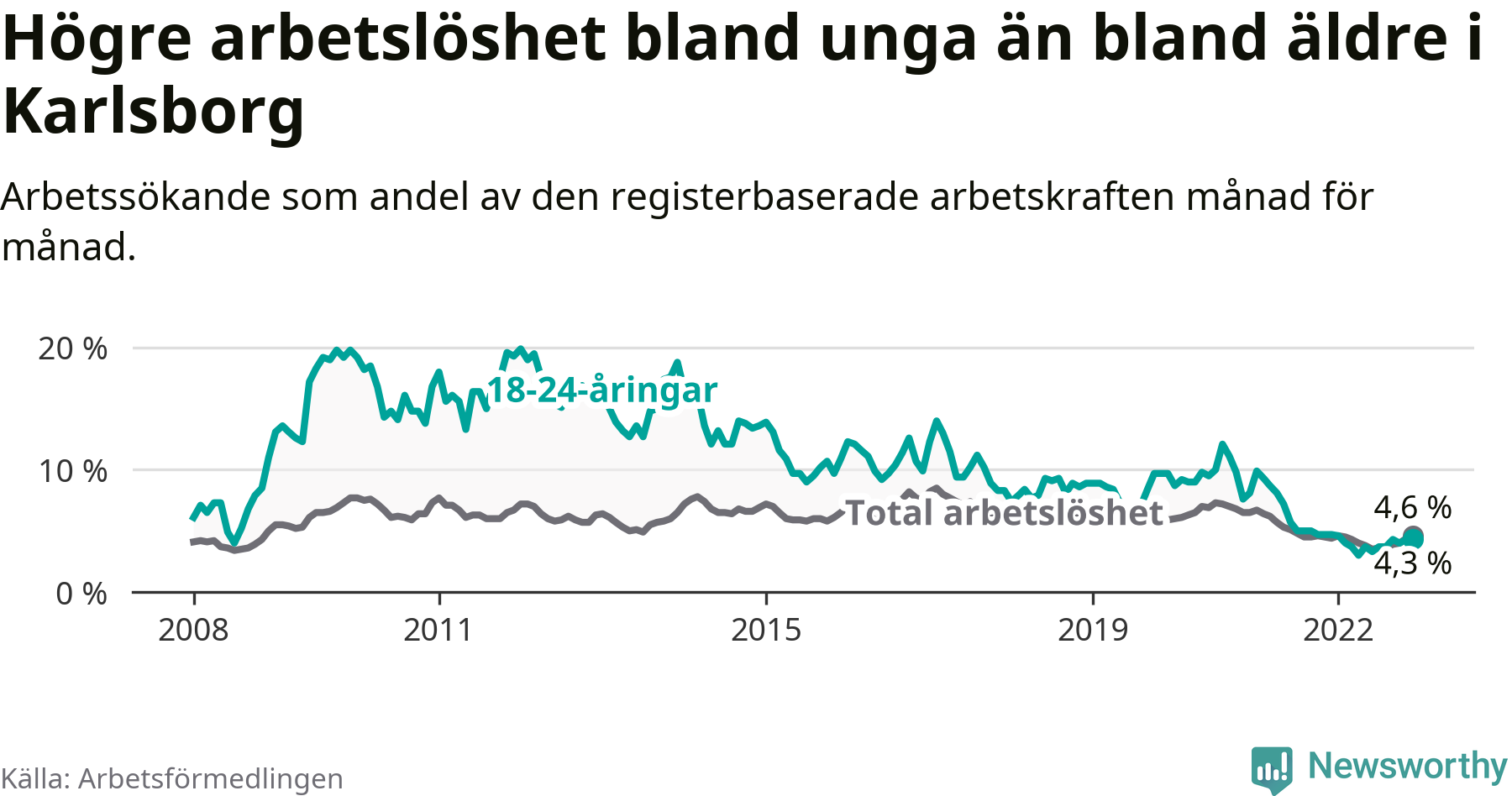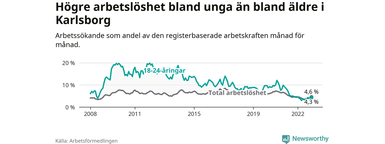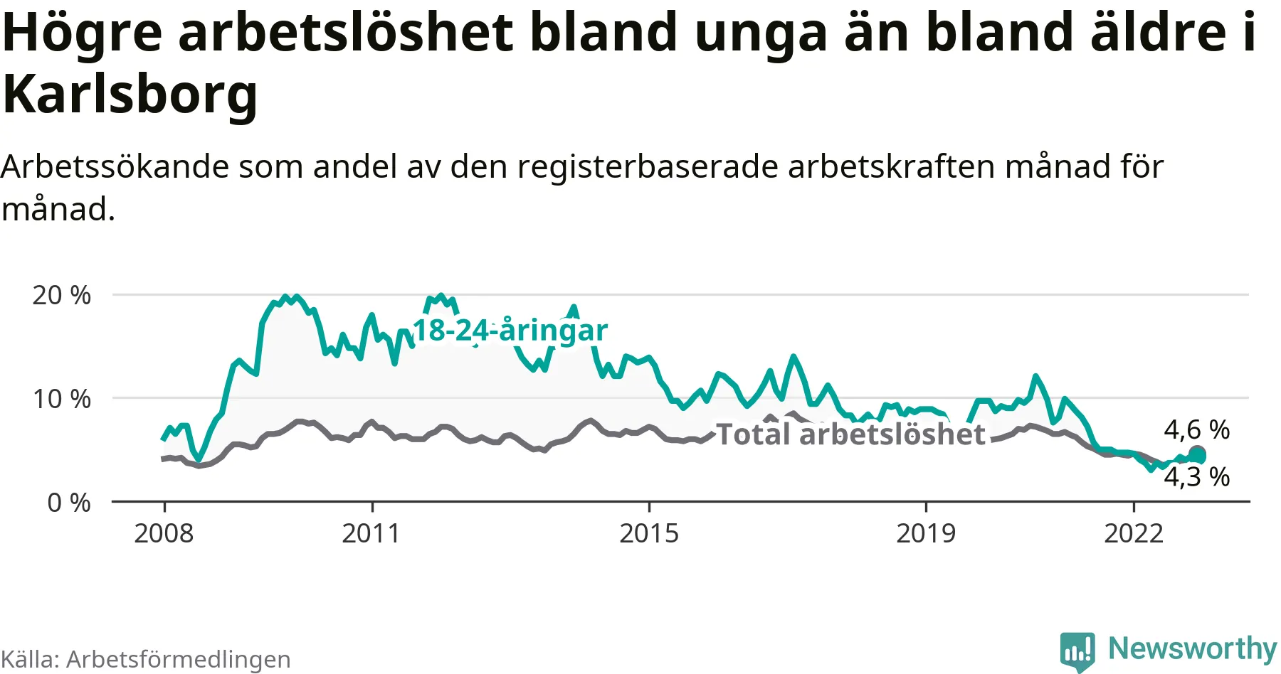 Till skillnad från den totala arbetslösheten sjunker arbetslösheten bland unga (−0,4 procentenheter). I december var 4,3 procent av 18–24-åringarna inskrivna som arbetssökande (motsvarande 13 personer). Mäter vi antalet inskrivna ser vi en minskning med ett personer på ett års sikt.