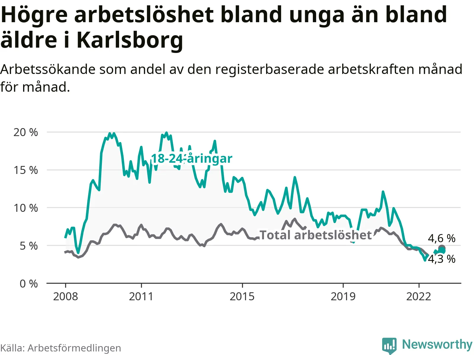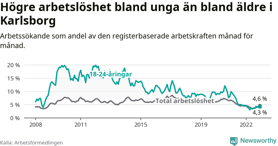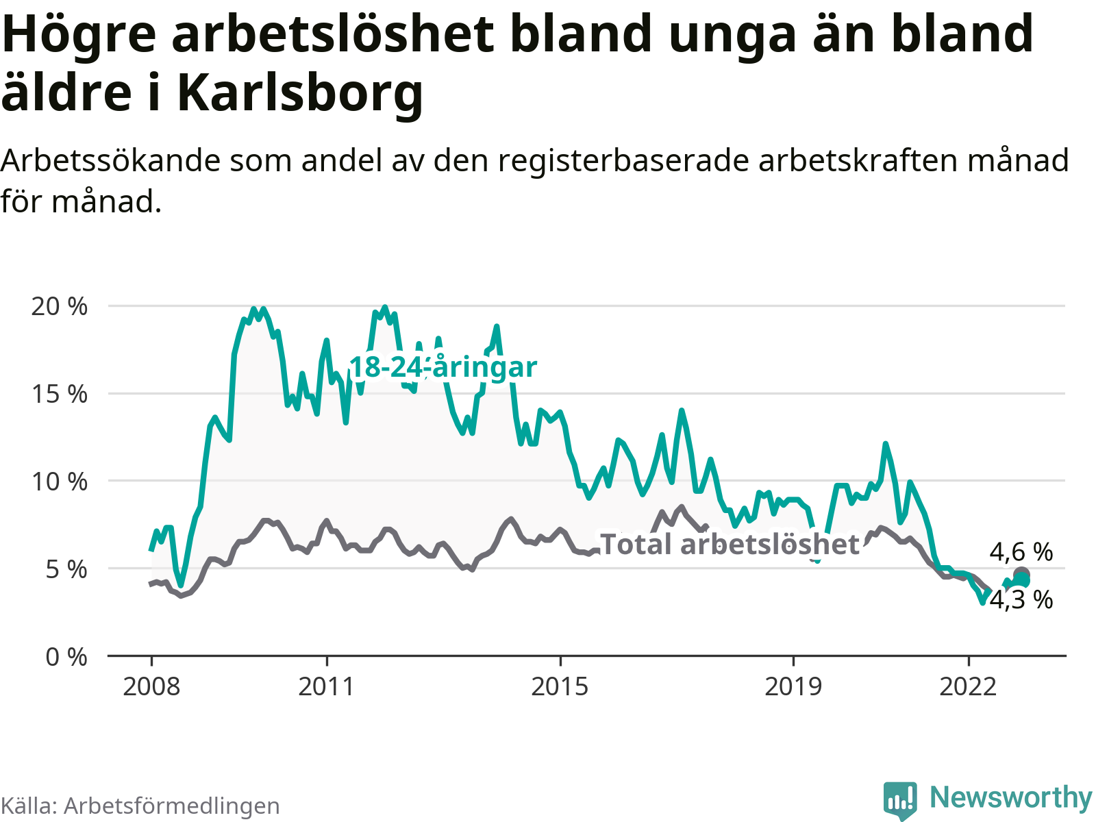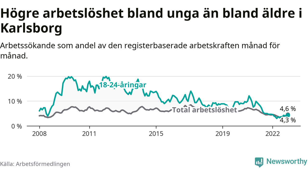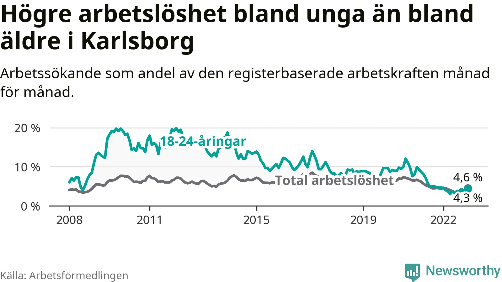 Till skillnad från den totala arbetslösheten sjunker arbetslösheten bland unga (−0,4 procentenheter). I december var 4,3 procent av 18–24-åringarna inskrivna som arbetssökande (motsvarande 13 personer). Mäter vi antalet inskrivna ser vi en minskning med ett personer på ett års sikt.