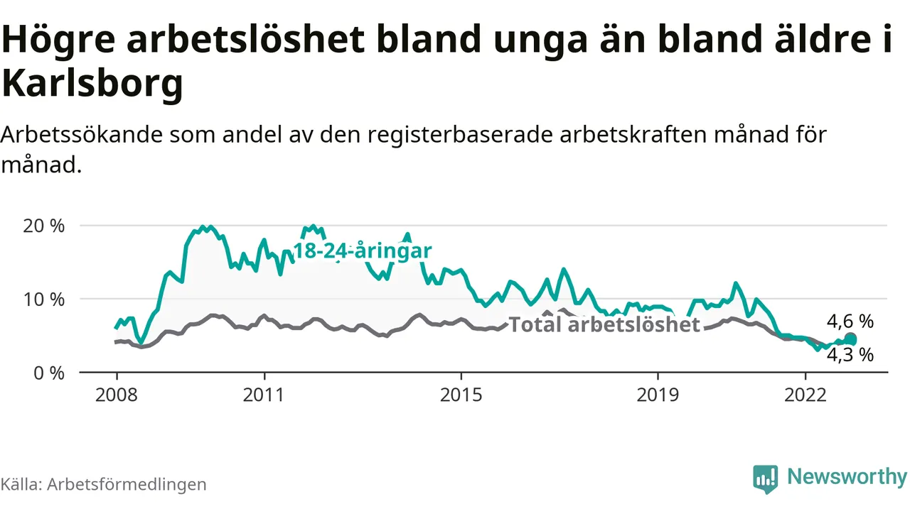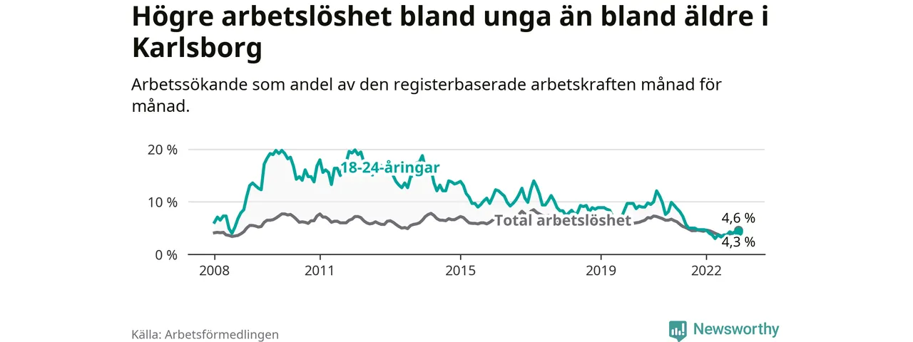 I och med den senaste månadens nedgång har de ungas arbetslöshet i Karlsborg sjunkit 22 månader i följd (ner från 9,3 procent i februari 2021 till 4,3 procent nu).