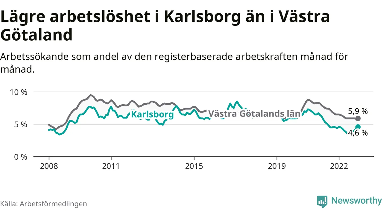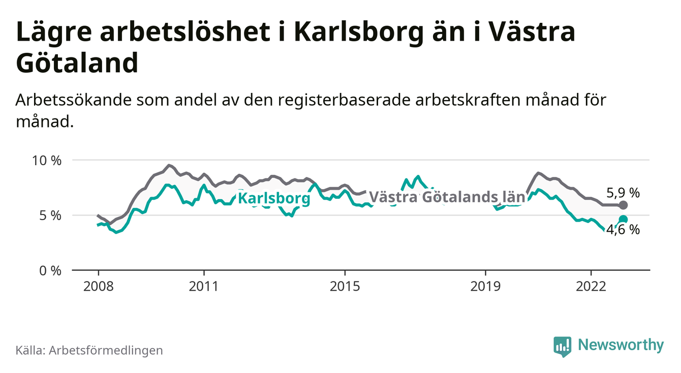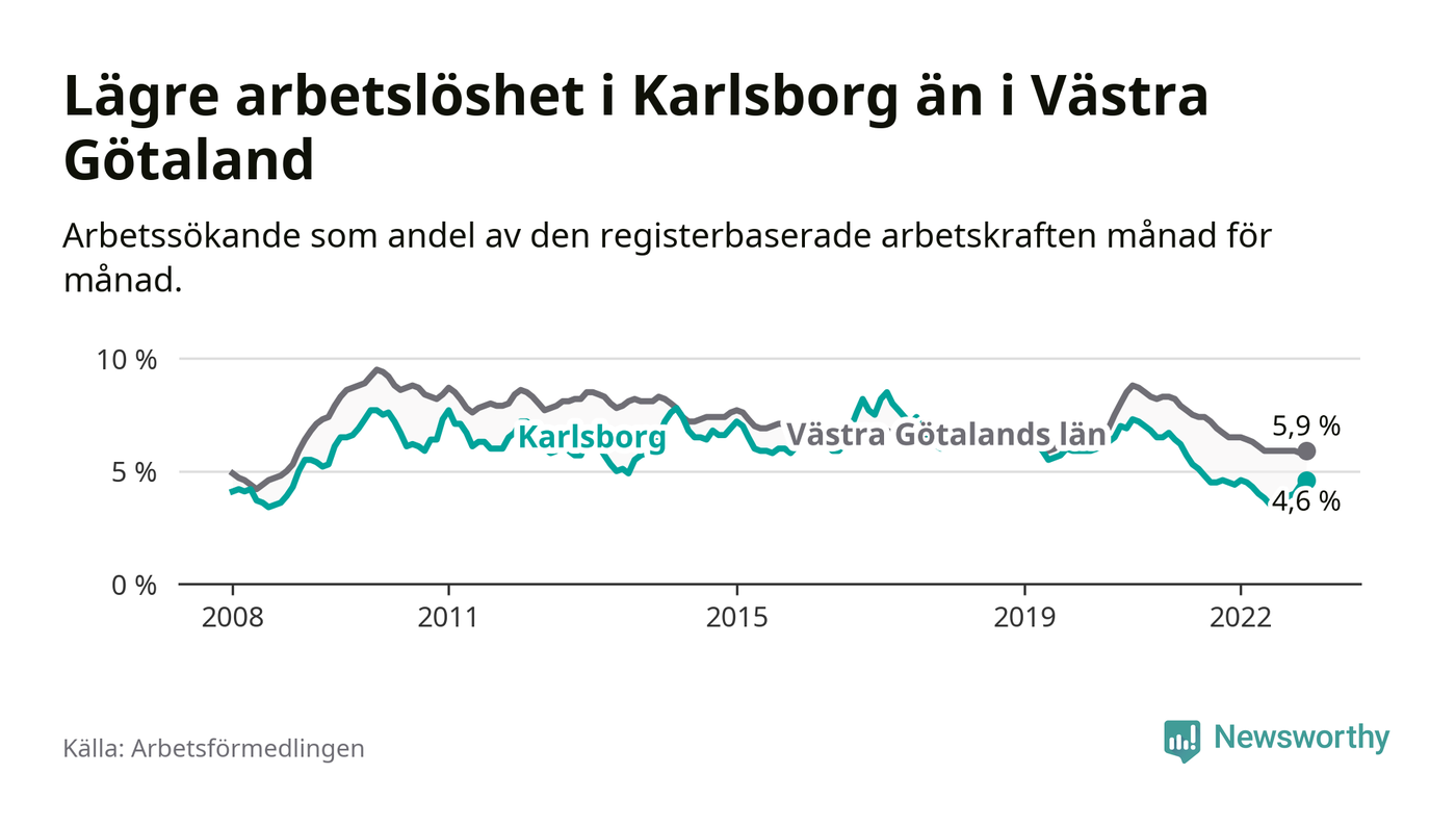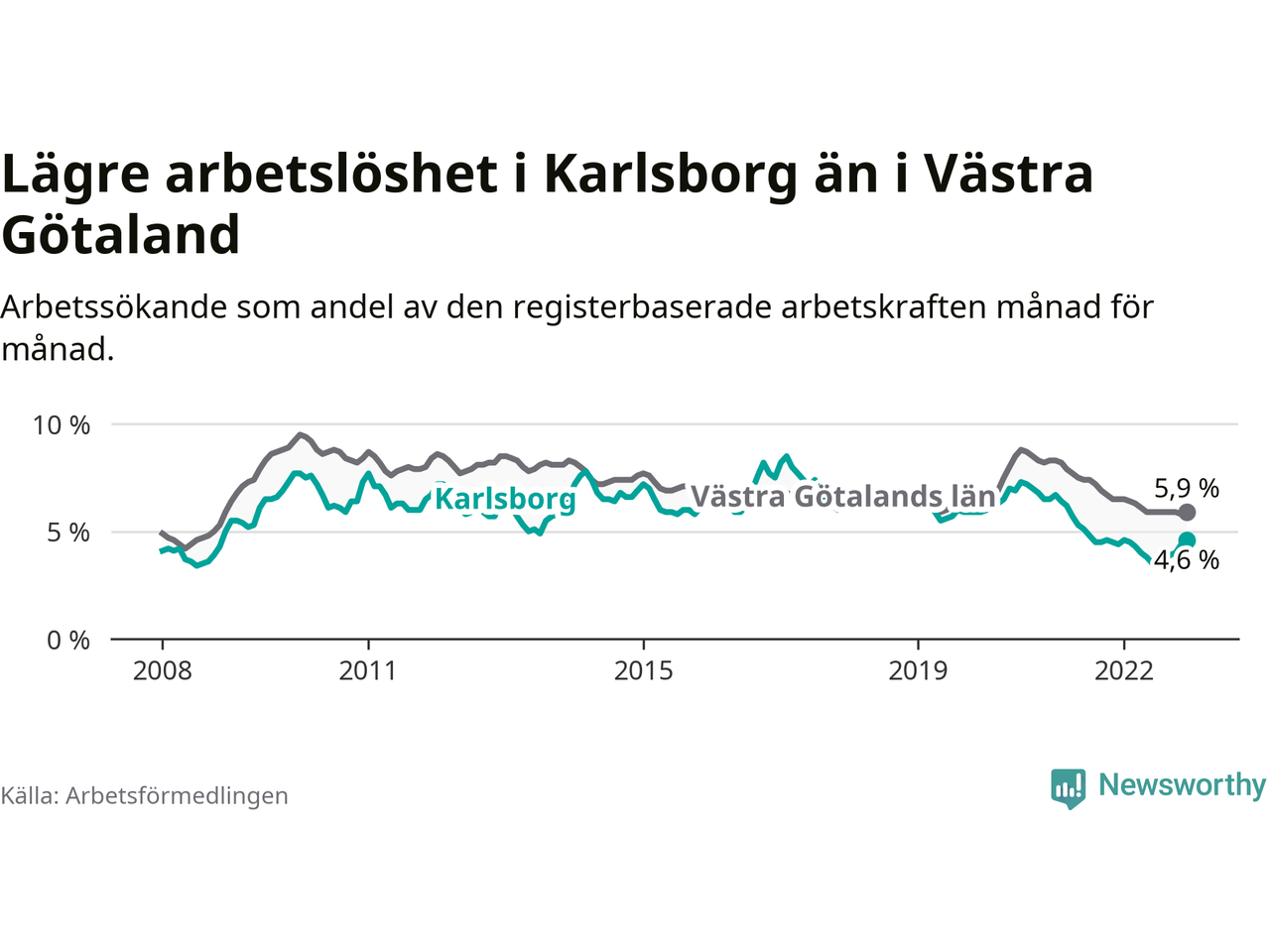 Även om arbetslösheten i Karlsborg alltså ökar, så ligger den fortfarande under snittet i hela Västra Götalands län (4,6 procent i kommunen, jämfört med 5,9 procent i hela länet). Tjörn och Öckerö har den lägsta arbetslösheten i länet (2,6 procent), medan Trollhättan har den högsta (9,1 procent). För att Karlsborg skulle komma ner i samma arbetslöshetsnivå som Tjörn och Öckerö skulle 61 personer behöva sysselsättas.