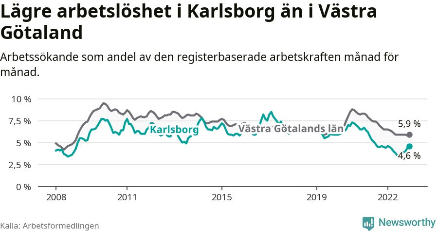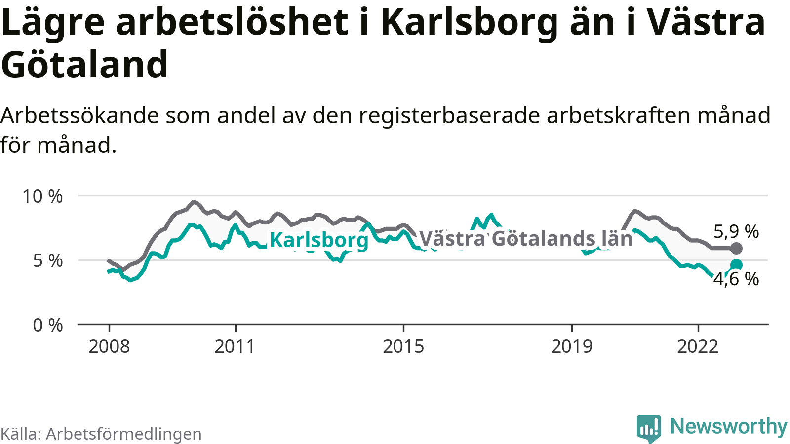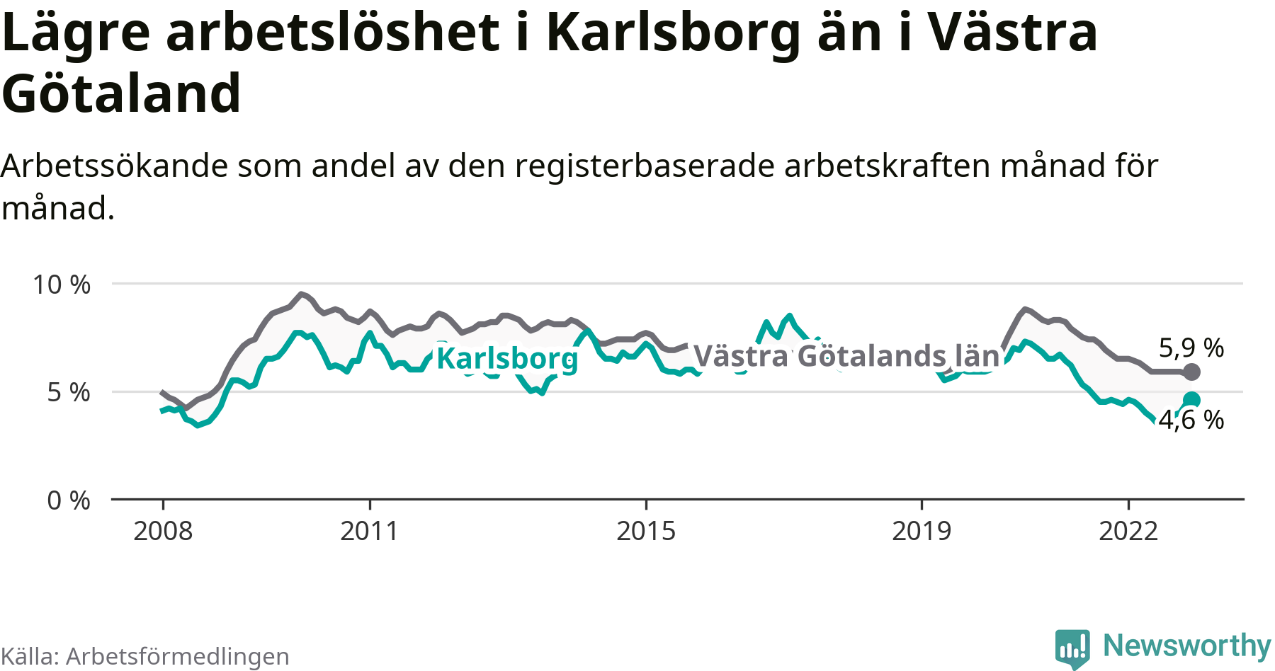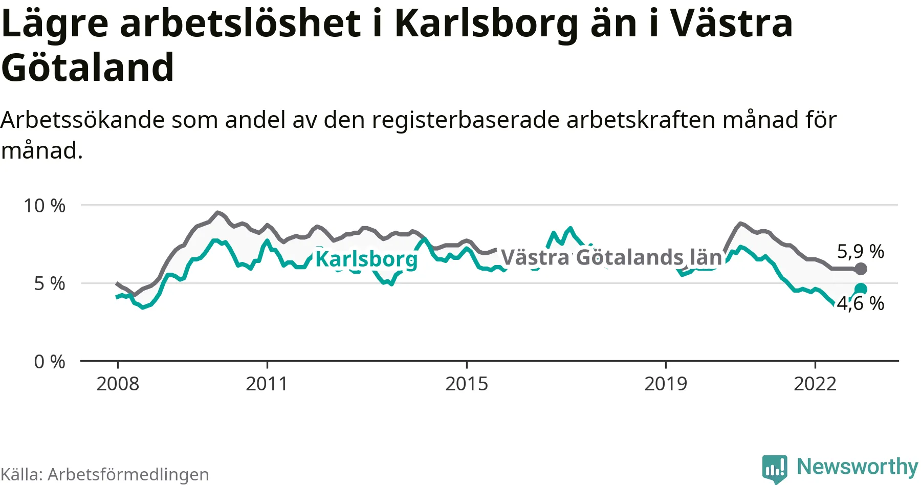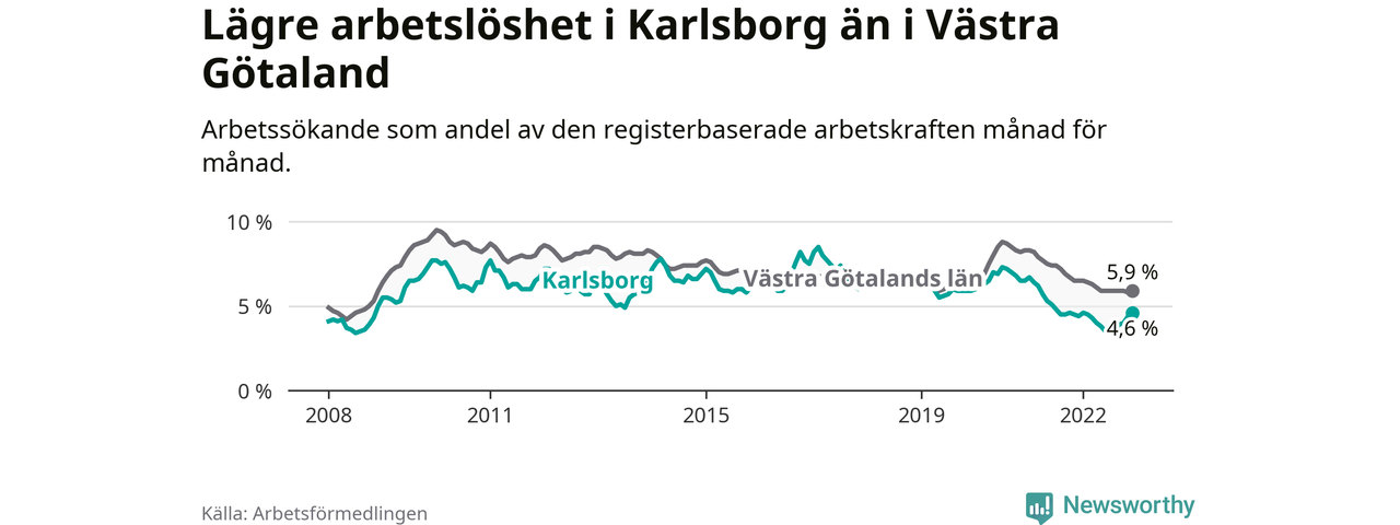 Även om arbetslösheten i Karlsborg alltså ökar, så ligger den fortfarande under snittet i hela Västra Götalands län (4,6 procent i kommunen, jämfört med 5,9 procent i hela länet). Tjörn och Öckerö har den lägsta arbetslösheten i länet (2,6 procent), medan Trollhättan har den högsta (9,1 procent). För att Karlsborg skulle komma ner i samma arbetslöshetsnivå som Tjörn och Öckerö skulle 61 personer behöva sysselsättas.