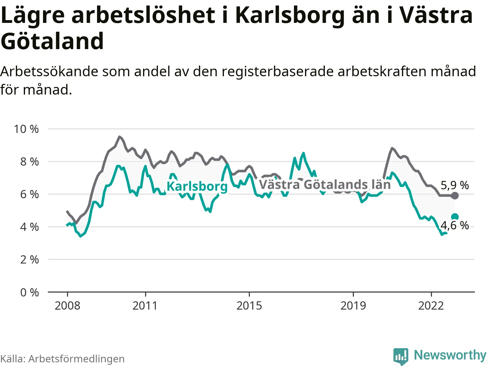 Karlsborg går därmed mot strömmen i förhållande till andra kommuner i Västra Götalands län. I de flesta andra kommuner i länet går arbetslösheten nedåt. Störst är minskningen i Strömstad och Åmål, där arbetslösheten sjunker med 1,6 procentenheter. I tabellen längre ner ser du utvecklingen i samtliga kommuner i länet.