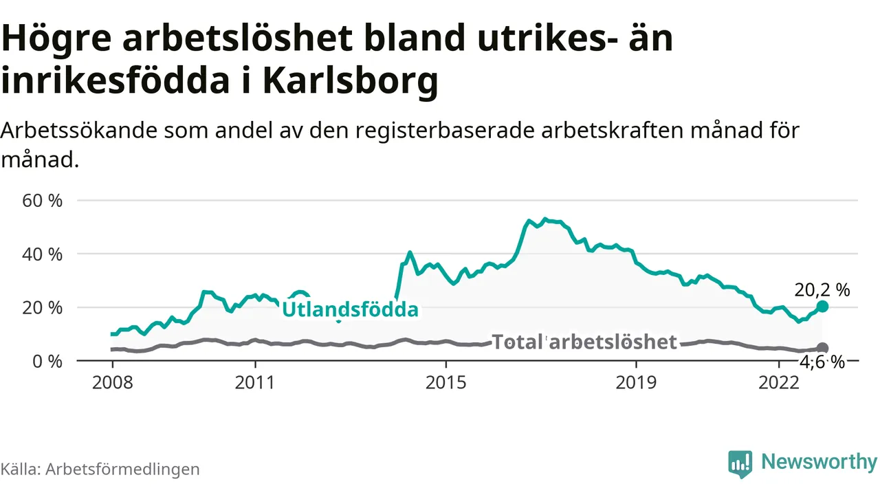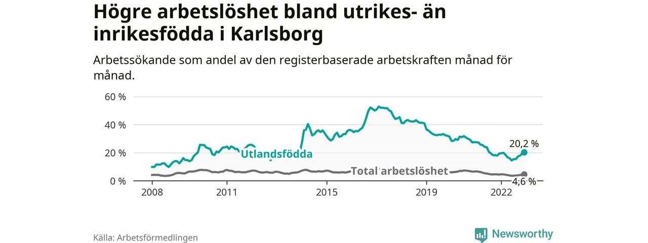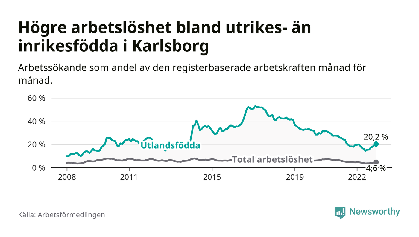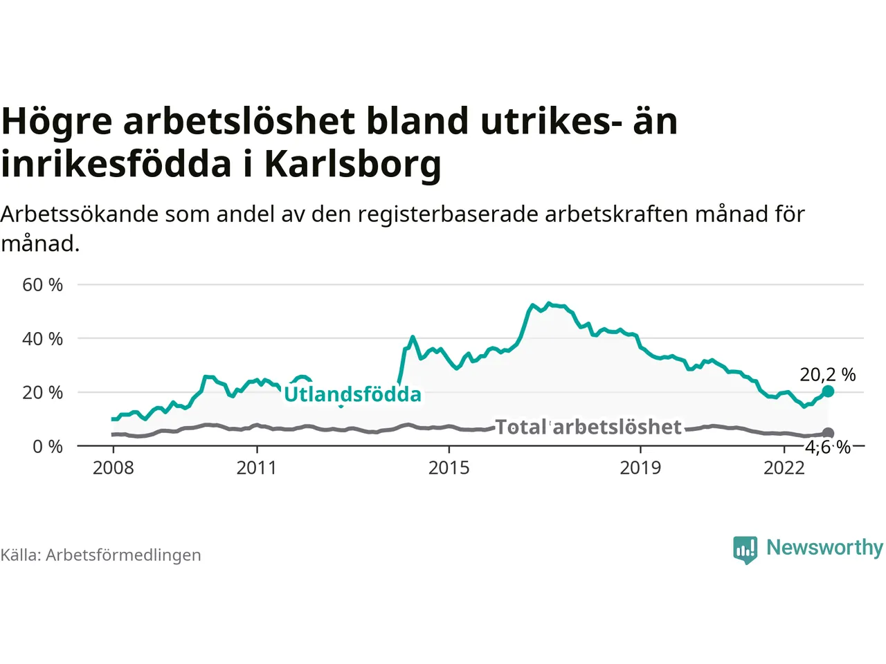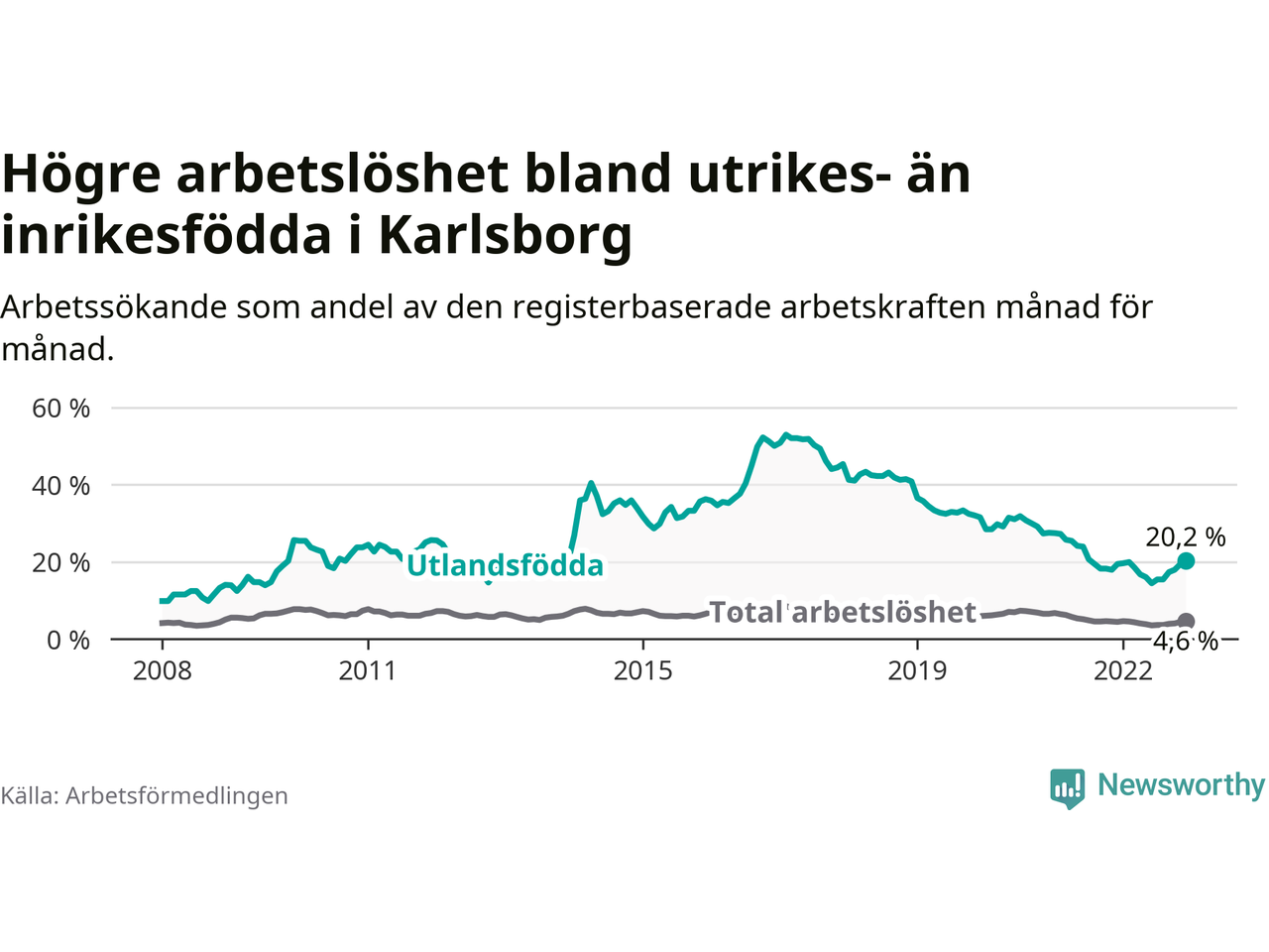 Arbetslösheten bland utlandsfödda var 20,2 procent i Karlsborg under december månad, motsvarande 57 av 282 personer. Det är 0,8 procentenheter fler än vid samma tidpunkt i fjol (+4 om man räknar personer).