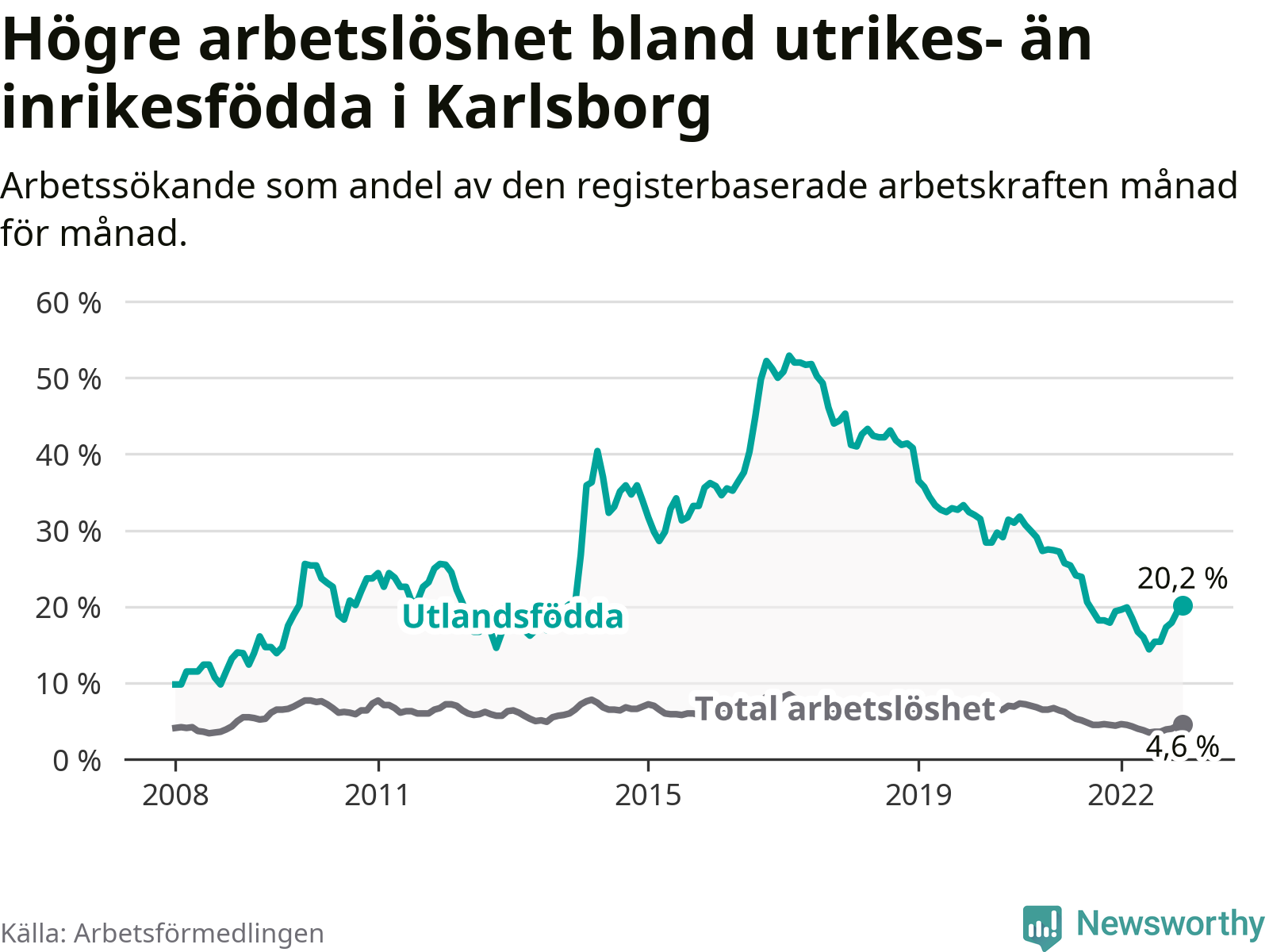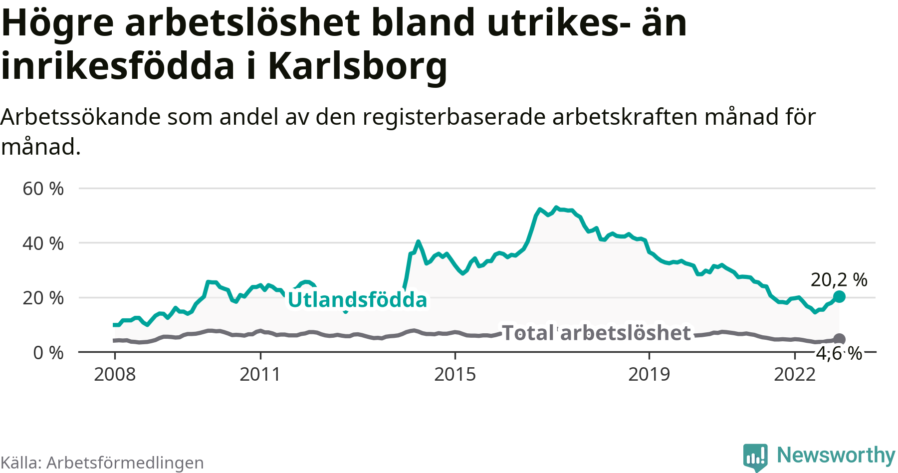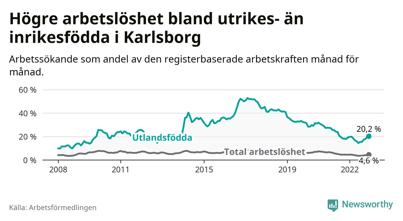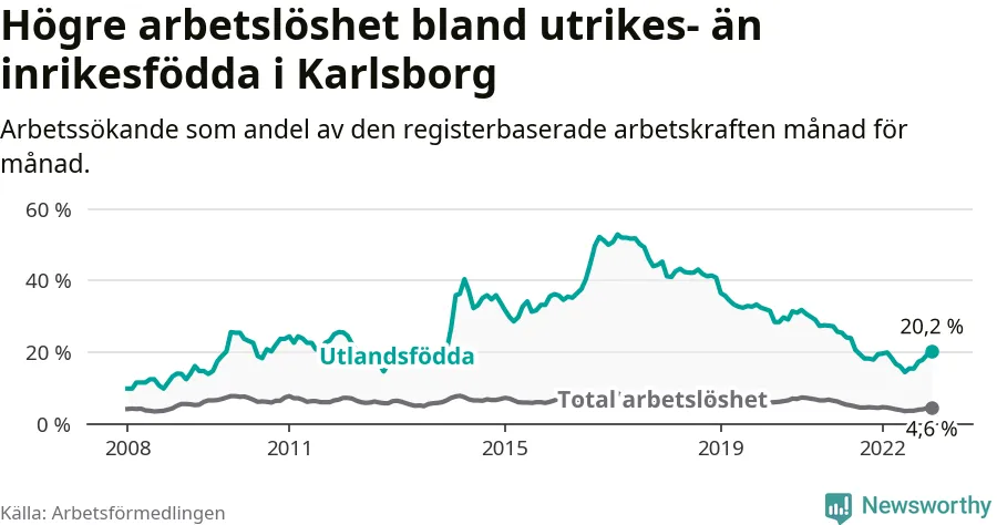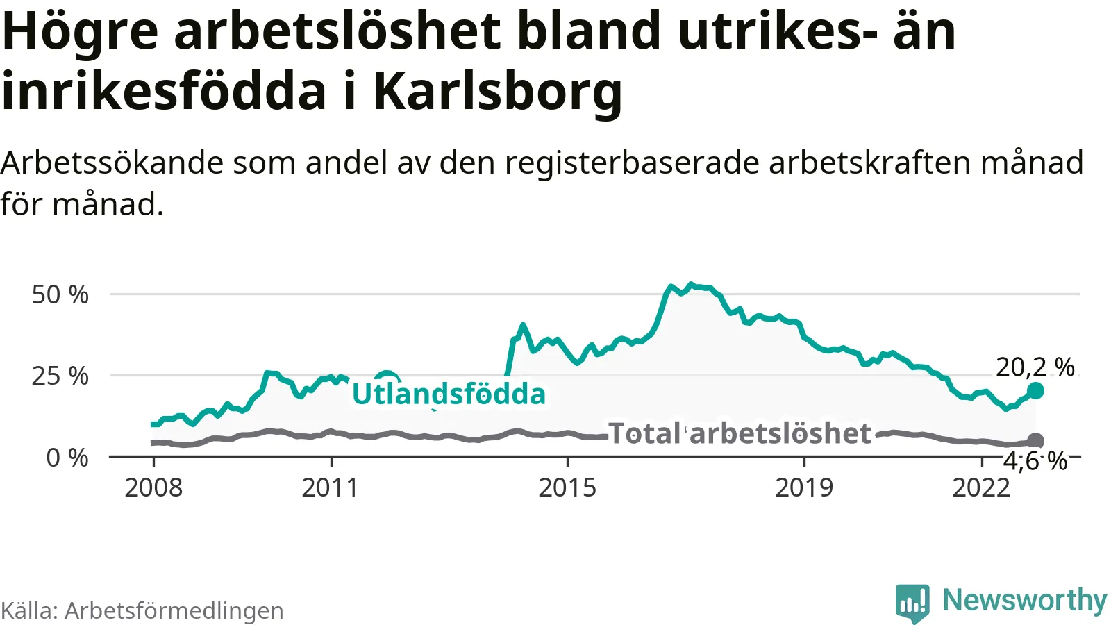 Arbetslösheten bland utlandsfödda var 20,2 procent i Karlsborg under december månad, motsvarande 57 av 282 personer. Det är 0,8 procentenheter fler än vid samma tidpunkt i fjol (+4 om man räknar personer).