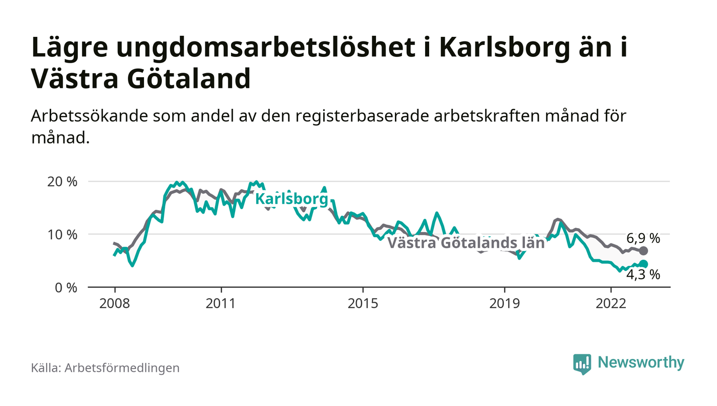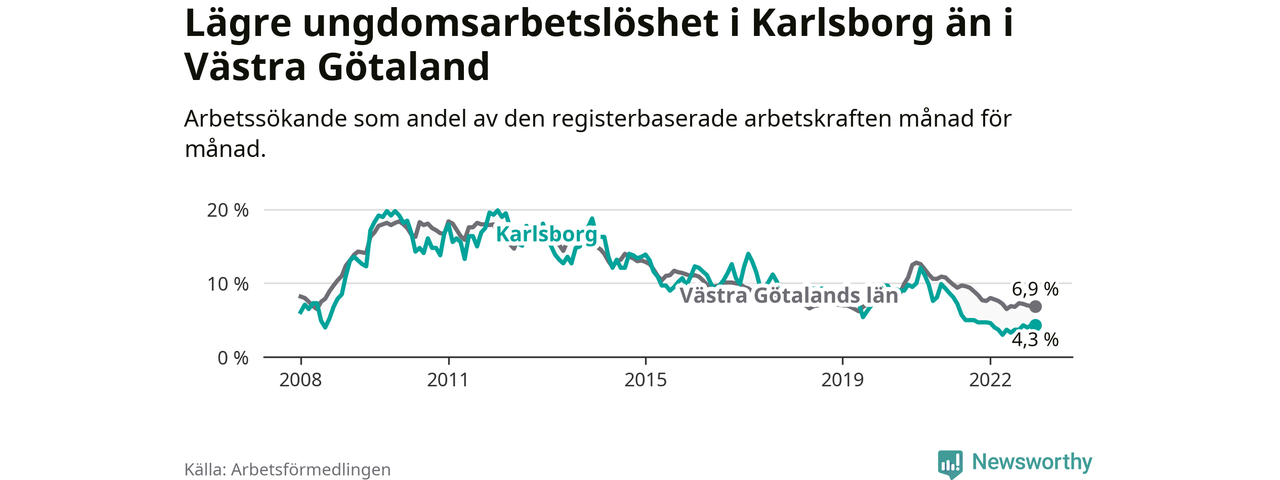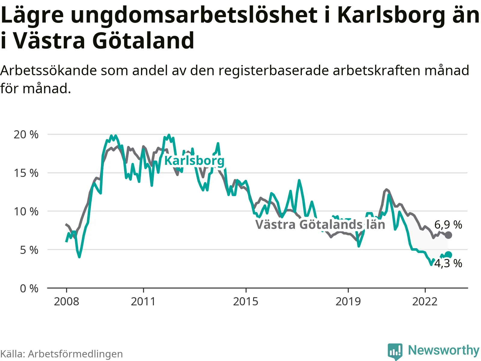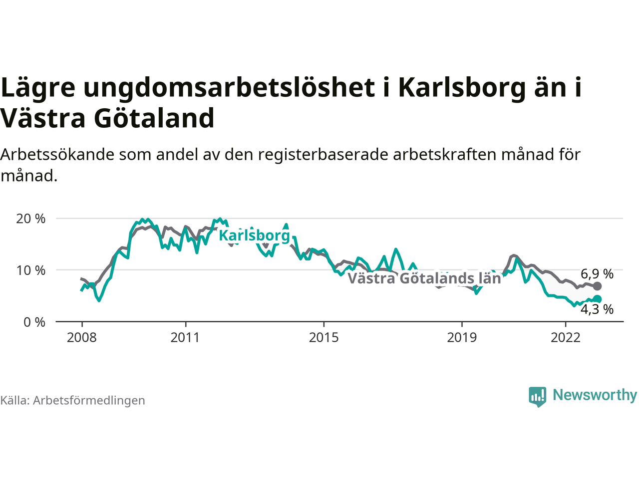 Precis som den totala arbetslösheten ligger ungdomsarbetslösheten i Karlsborg lägre än i Västra Götaland som helhet. Skillnaden mellan kommunen och länet är 2,6 procentenheter.