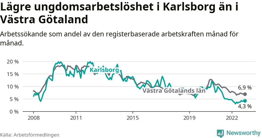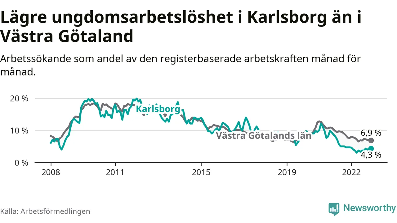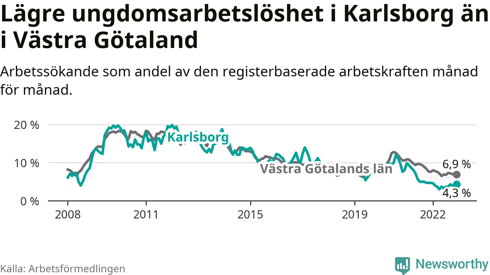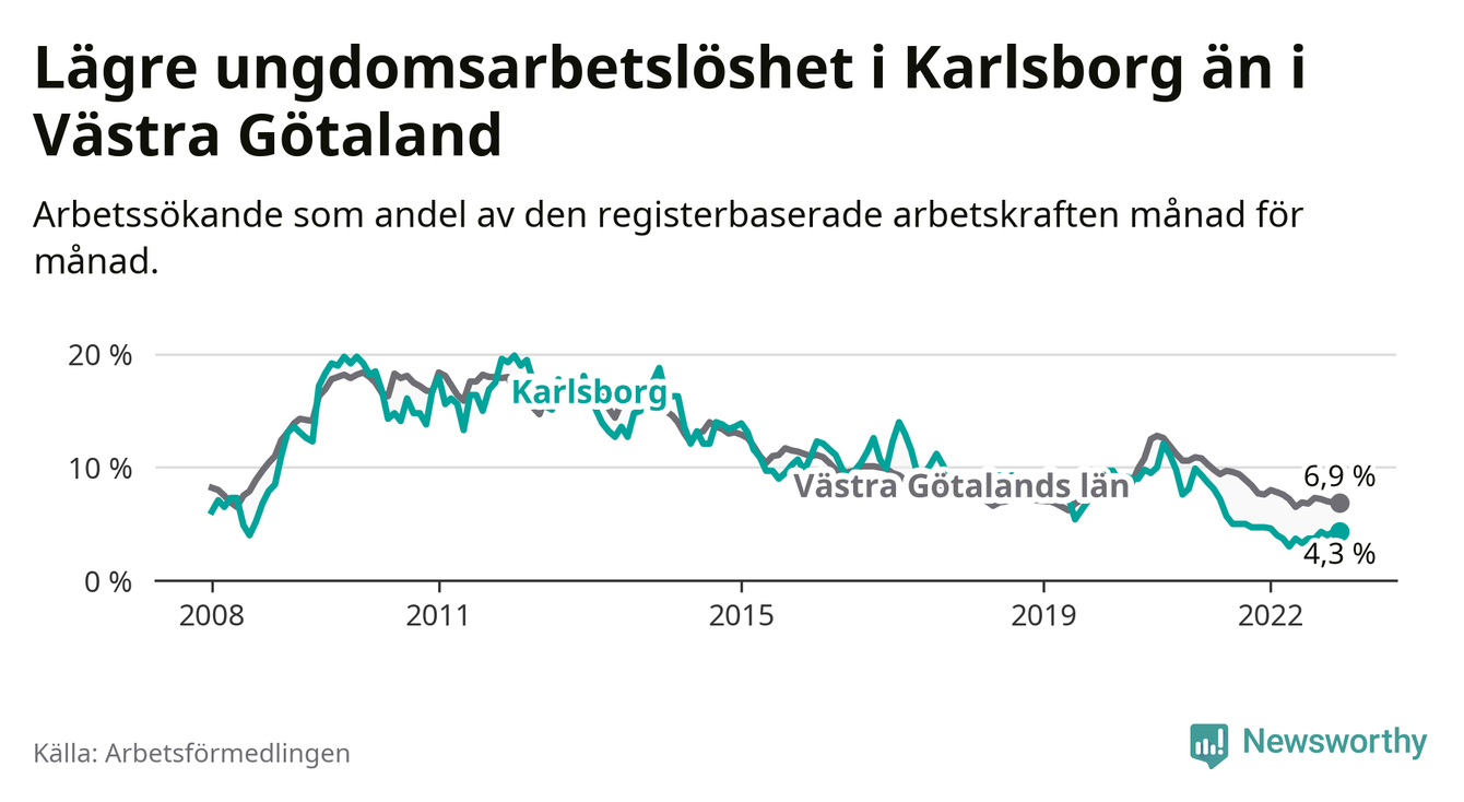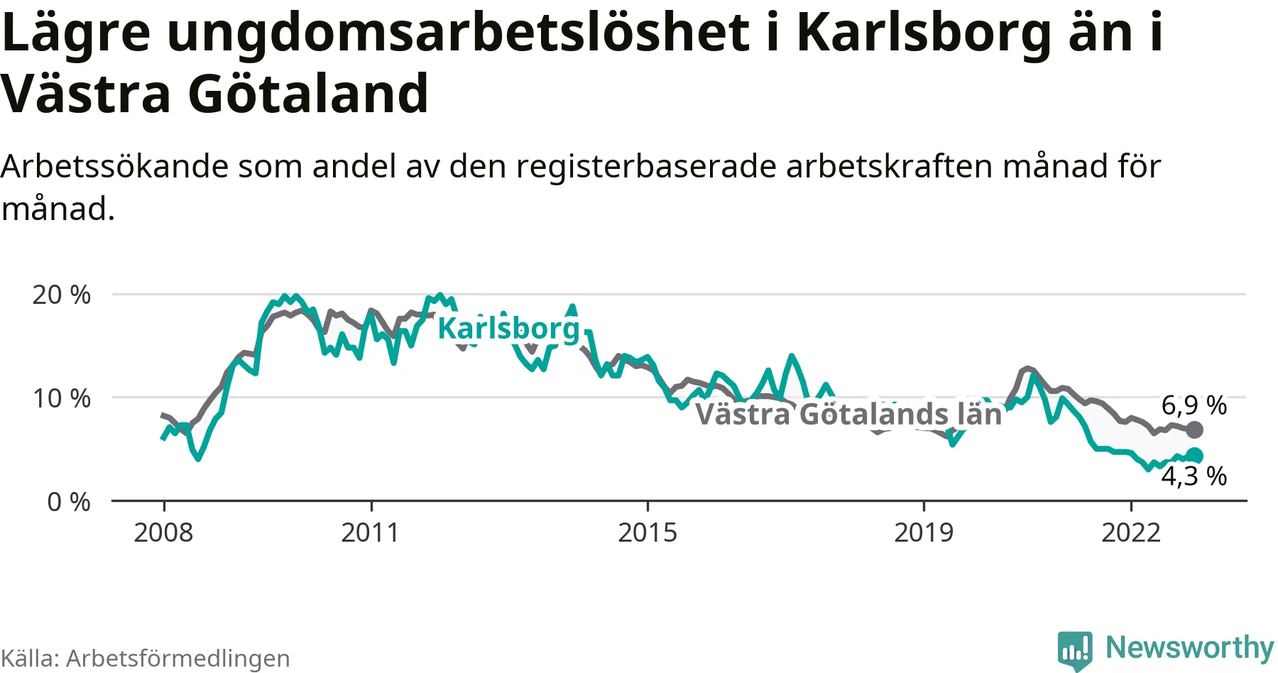 Precis som den totala arbetslösheten ligger ungdomsarbetslösheten i Karlsborg lägre än i Västra Götaland som helhet. Skillnaden mellan kommunen och länet är 2,6 procentenheter.