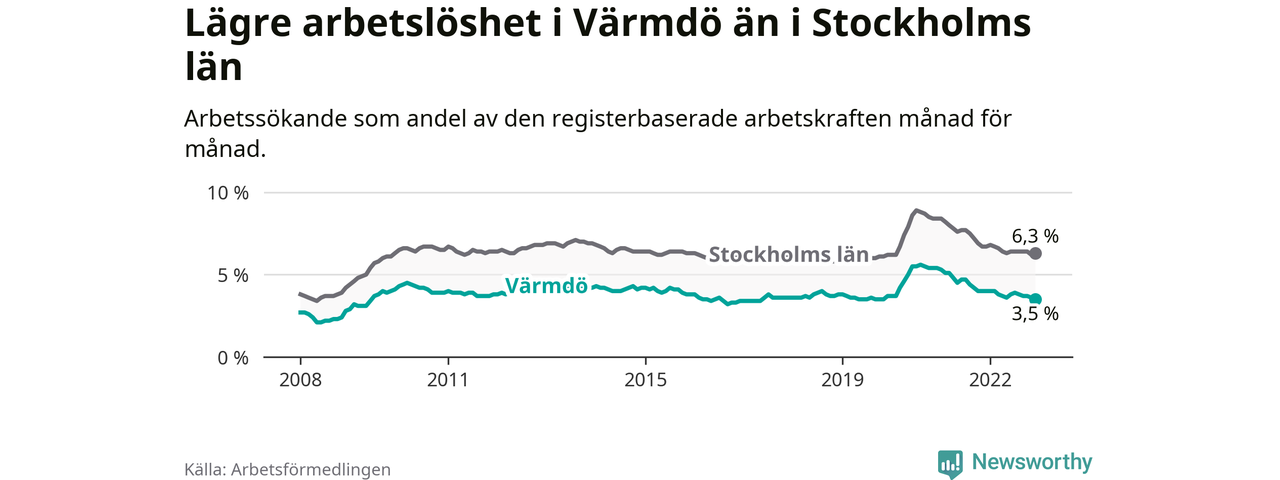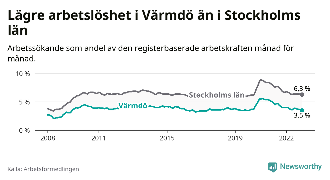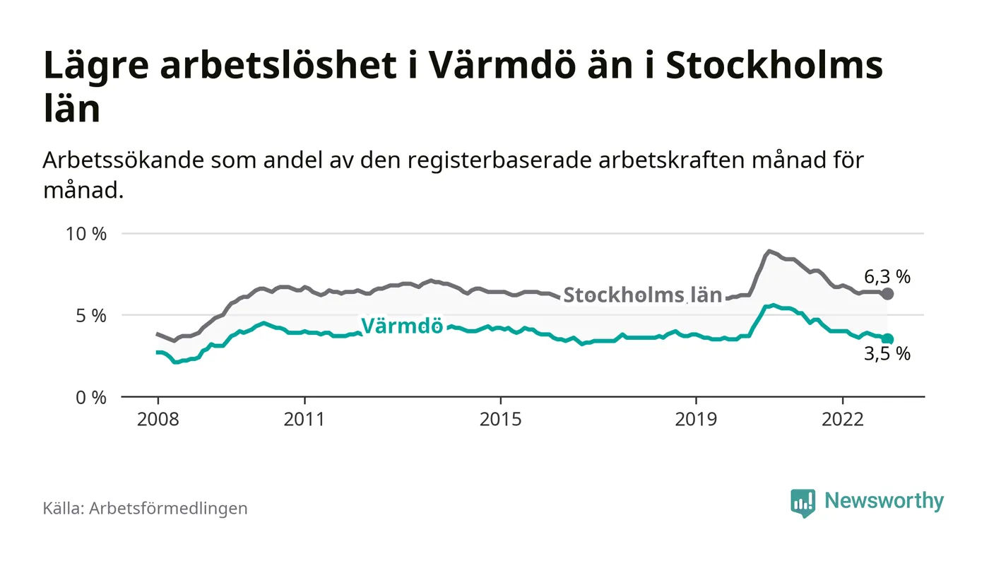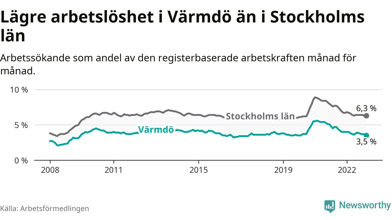 Värmdö hade redan tidigare lägre arbetslöshet än snittet i hela Stockholms län och nu växer klyftan (3,5 procent i kommunen, jämfört med 6,3 procent i hela länet). Ekerö och Vaxholm har den lägsta arbetslösheten i länet (3,2 procent), medan Botkyrka har den högsta (11,1 procent). För att Värmdö skulle komma ner i samma arbetslöshetsnivå som Ekerö och Vaxholm skulle 70 personer behöva sysselsättas.