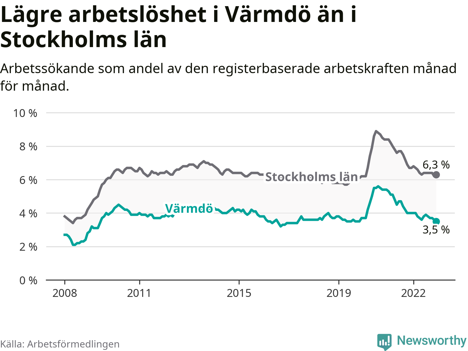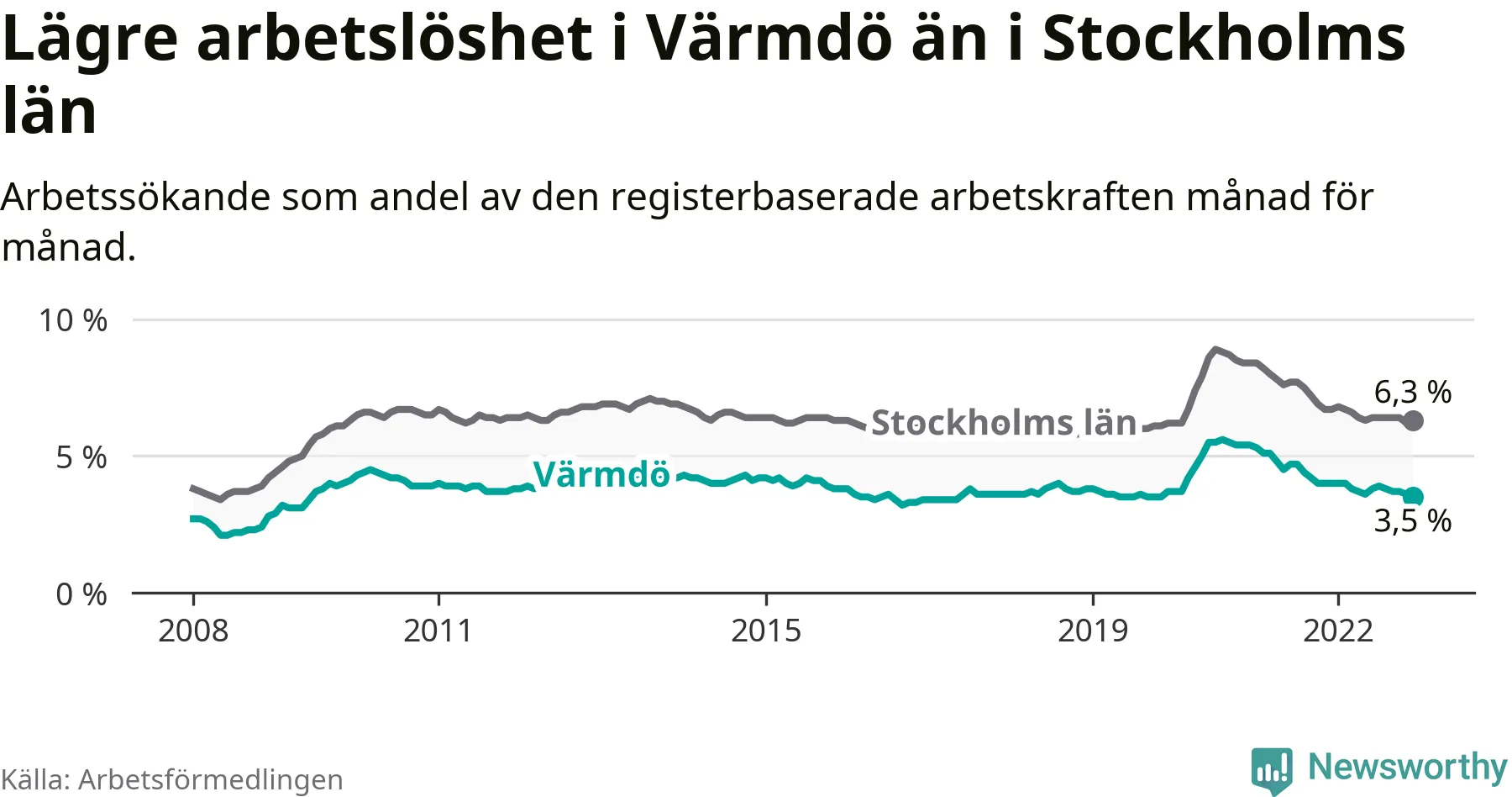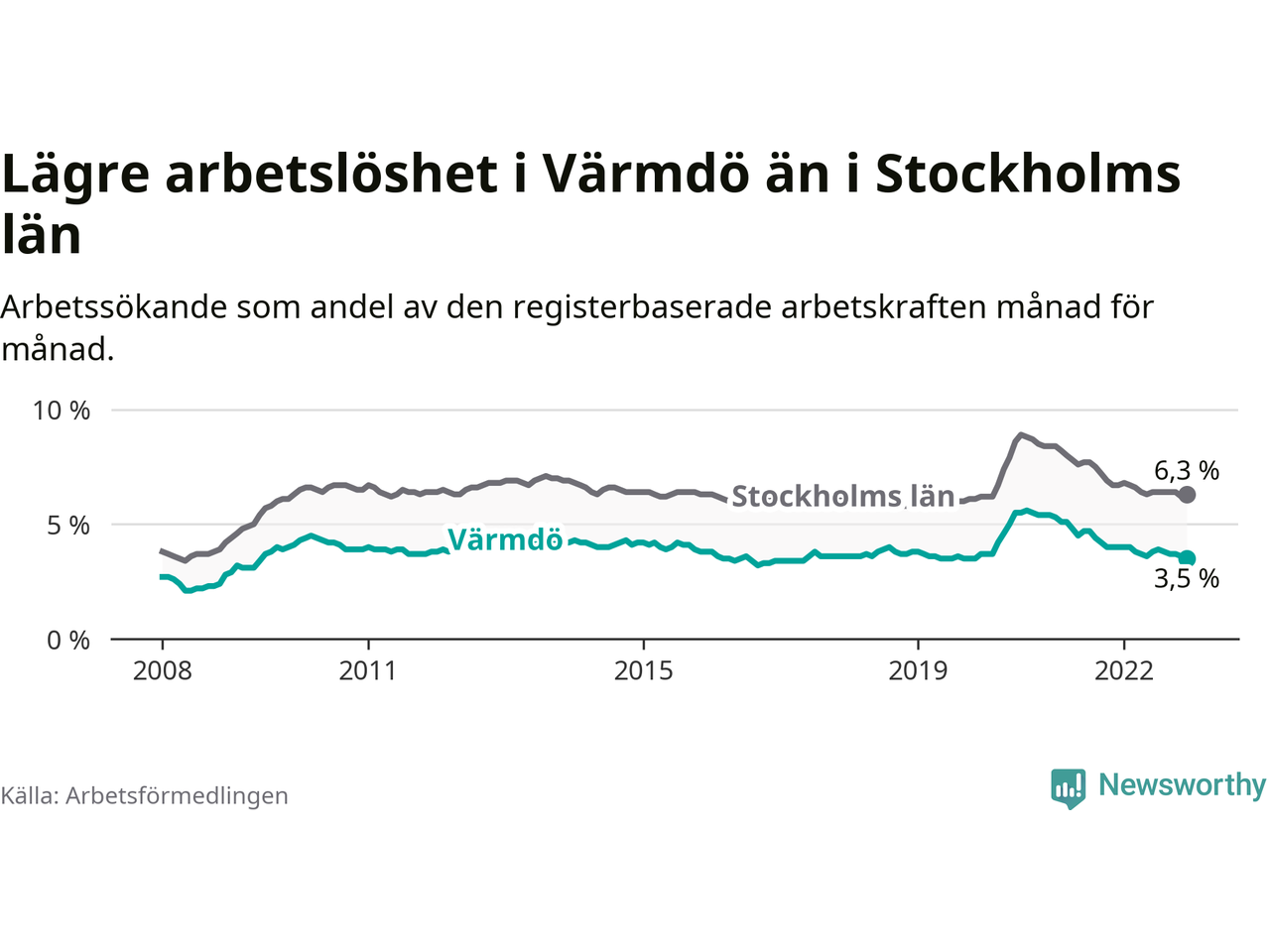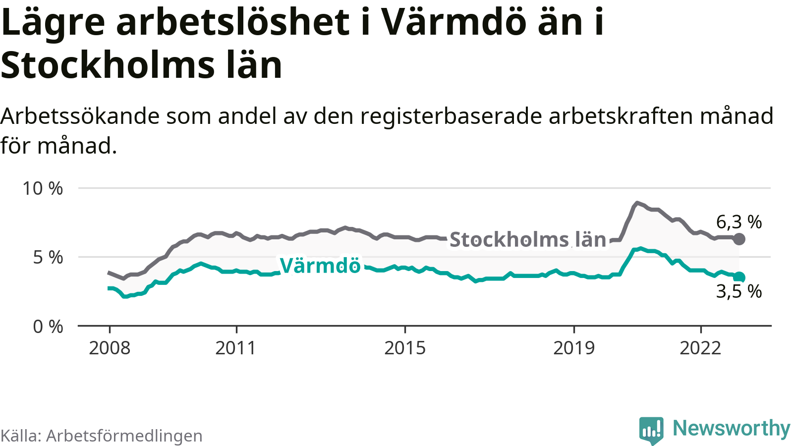 Värmdö hade redan tidigare lägre arbetslöshet än snittet i hela Stockholms län och nu växer klyftan (3,5 procent i kommunen, jämfört med 6,3 procent i hela länet). Ekerö och Vaxholm har den lägsta arbetslösheten i länet (3,2 procent), medan Botkyrka har den högsta (11,1 procent). För att Värmdö skulle komma ner i samma arbetslöshetsnivå som Ekerö och Vaxholm skulle 70 personer behöva sysselsättas.
