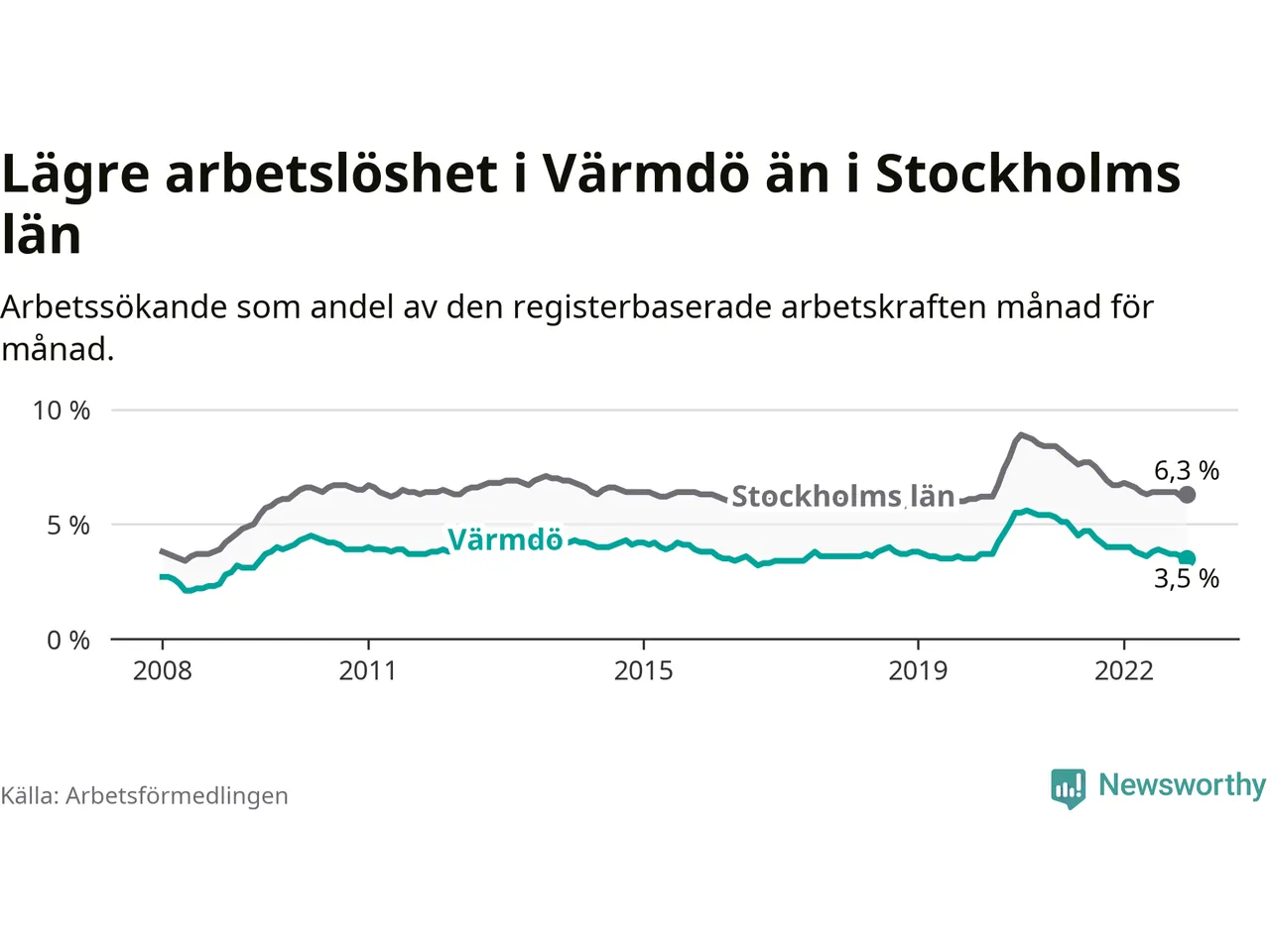 Det är 20:e månaden i följd som arbetslösheten i Värmdö är lägre än den var under samma tidpunkt året innan. Sedan april 2021 har arbetslösheten gått ner från 4,8 till 3,5 procent. Den nuvarande arbetslöshetsnivån är därmed den lägsta sedan november 2019.