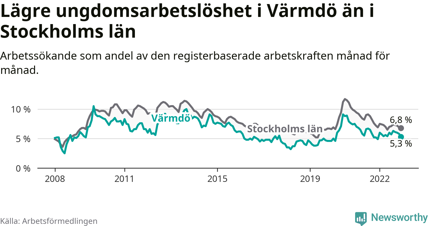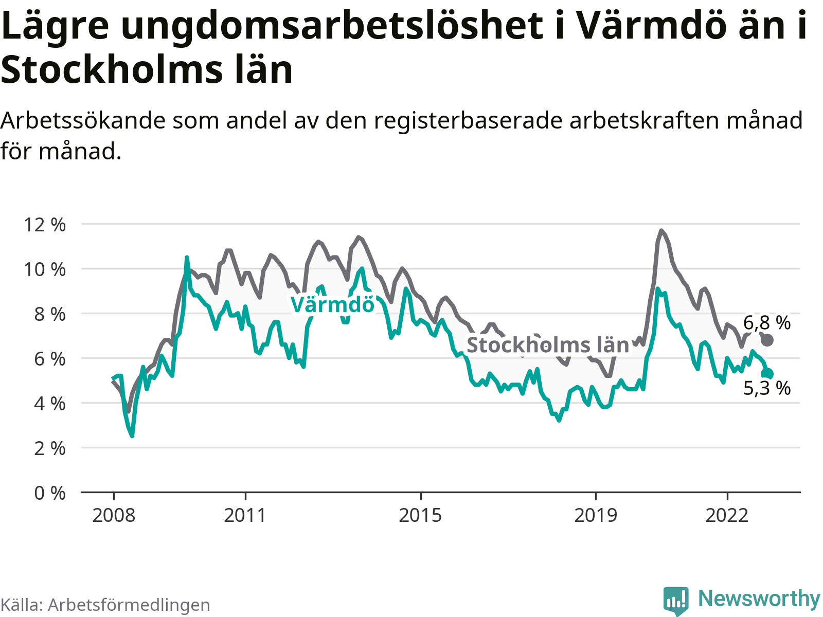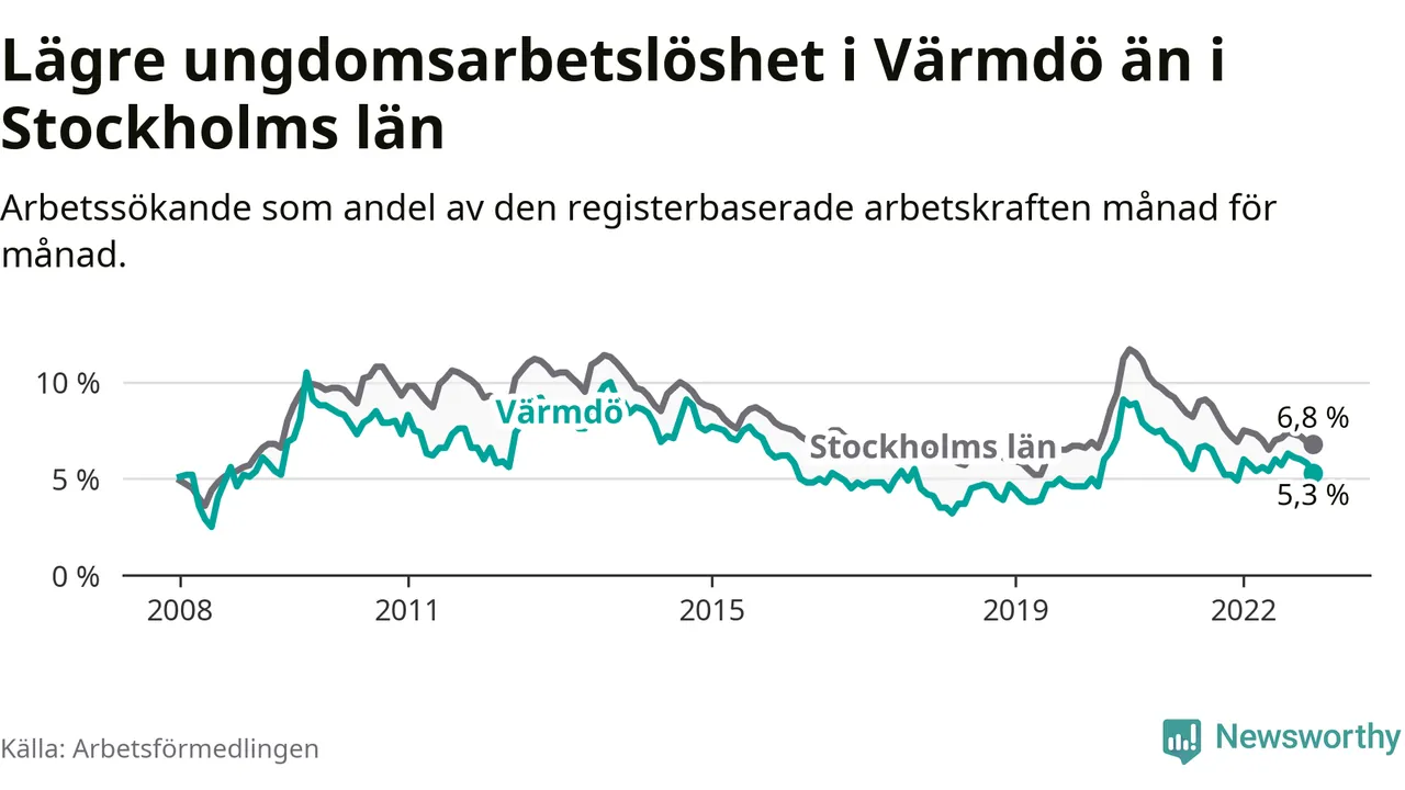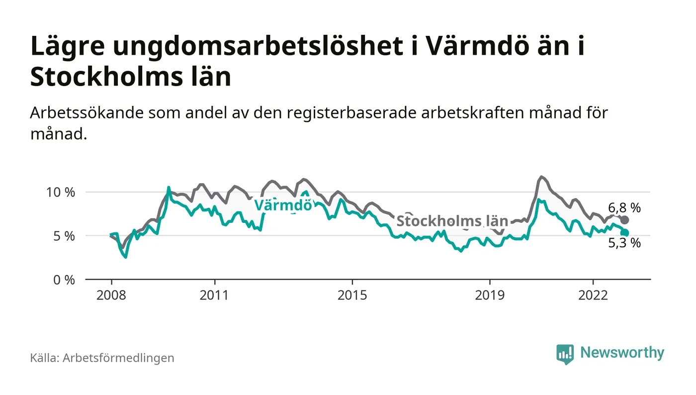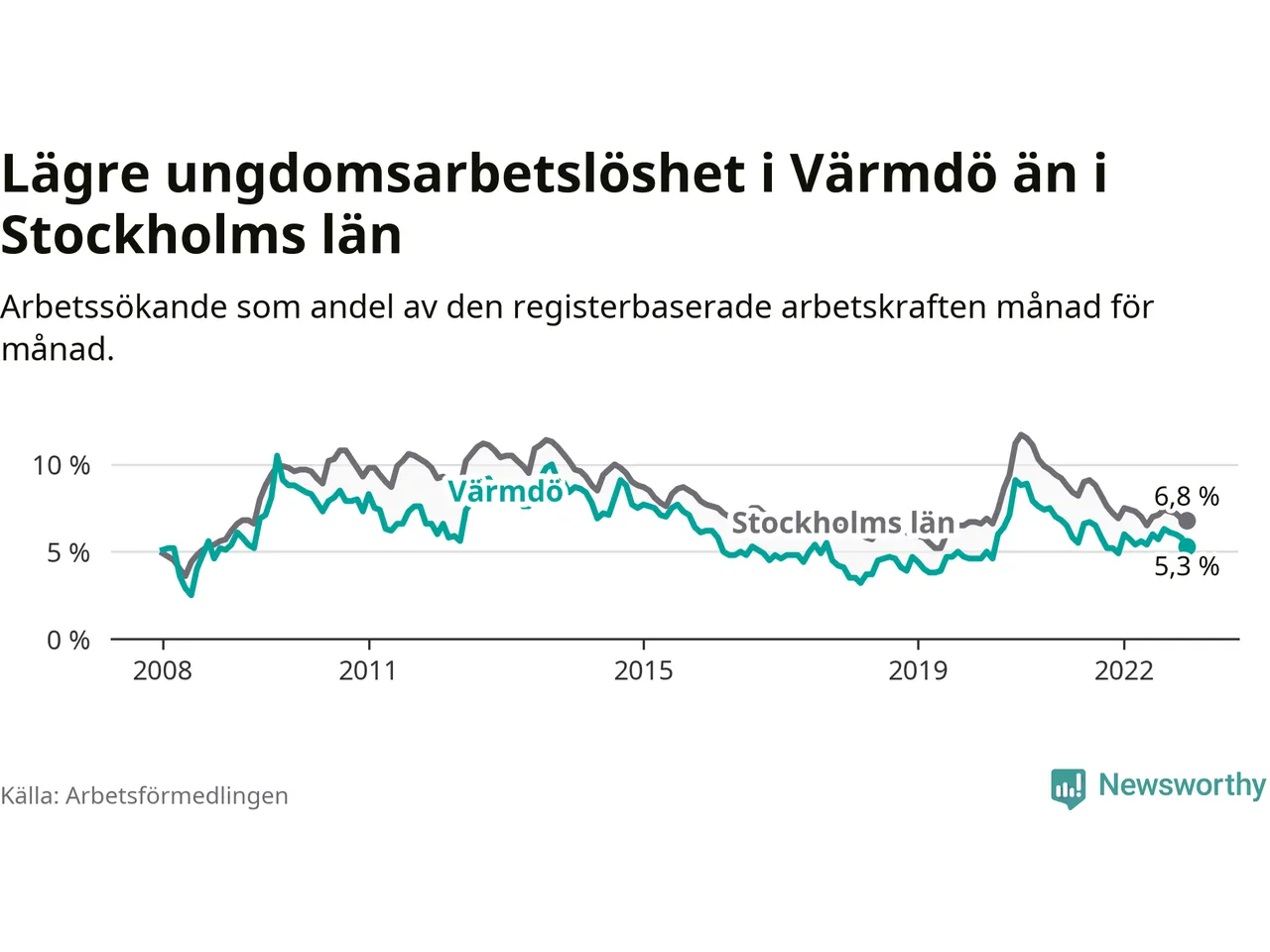Precis som den totala arbetslösheten ligger ungdomsarbetslösheten i Värmdö lägre än i Stockholms län som helhet. Skillnaden mellan kommunen och länet är 1,5 procentenheter.