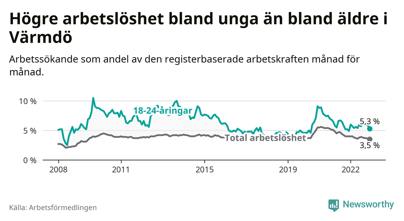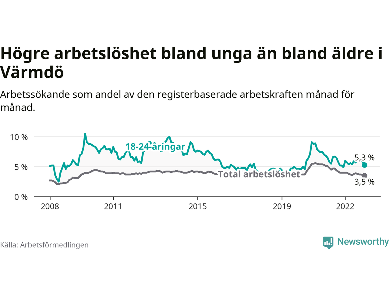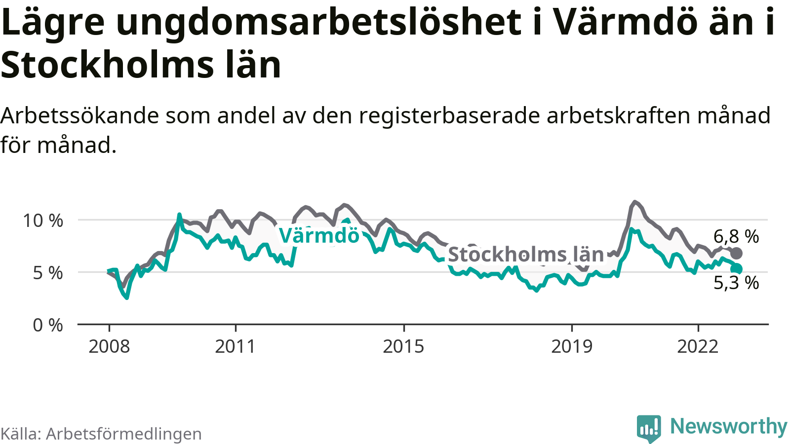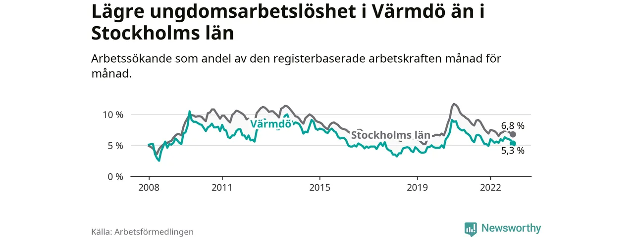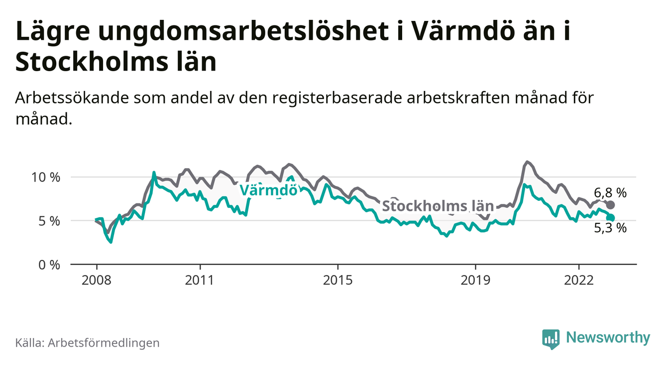Precis som den totala arbetslösheten ligger ungdomsarbetslösheten i Värmdö lägre än i Stockholms län som helhet. Skillnaden mellan kommunen och länet är 1,5 procentenheter.