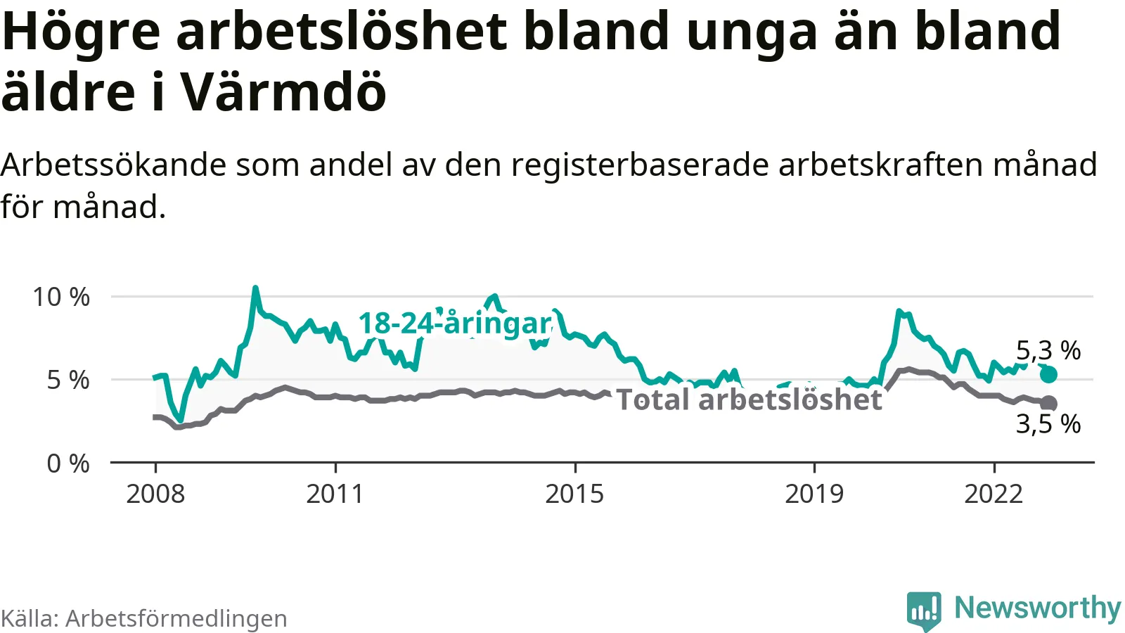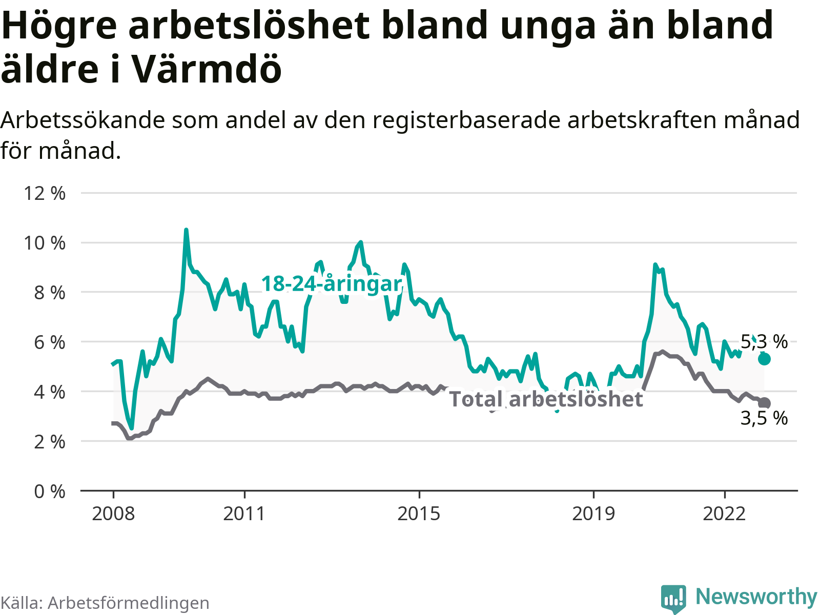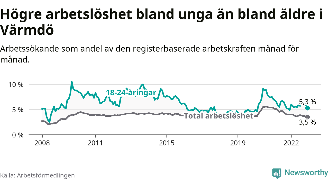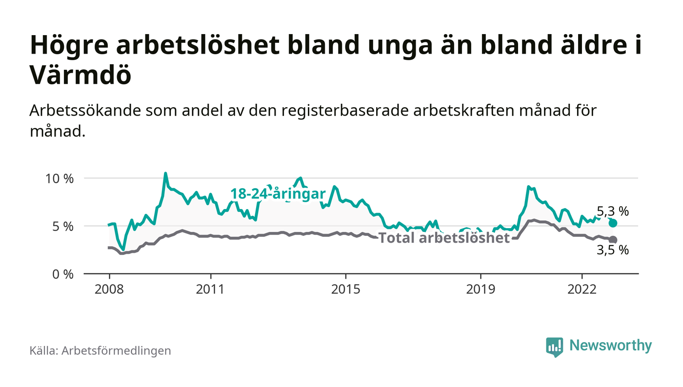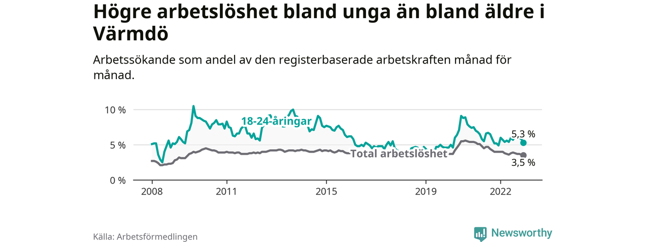 Precis som den totala arbetslösheten ligger ungdomsarbetslösheten i Värmdö lägre än i Stockholms län som helhet. Skillnaden mellan kommunen och länet är 1,5 procentenheter.