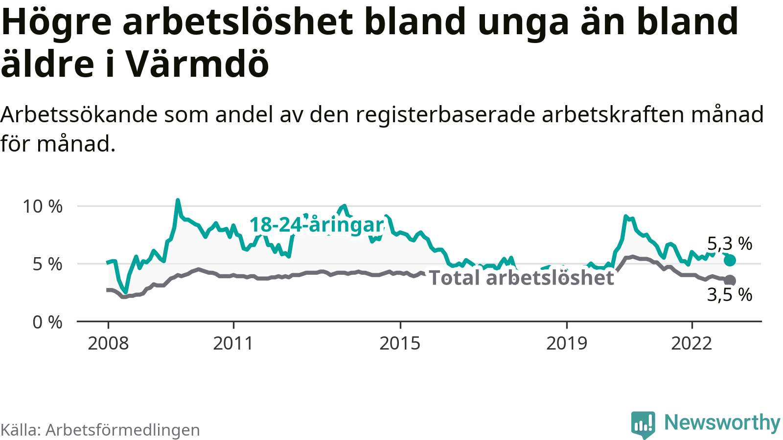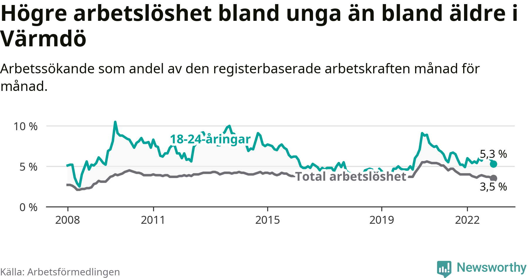 Till skillnad från den totala arbetslösheten stiger arbetslösheten bland unga (+0,4 procentenheter). I december var 5,3 procent av 18–24-åringarna inskrivna som arbetssökande (motsvarande 101 personer). Mäter vi antalet inskrivna har det däremot inte skett någon förändring.