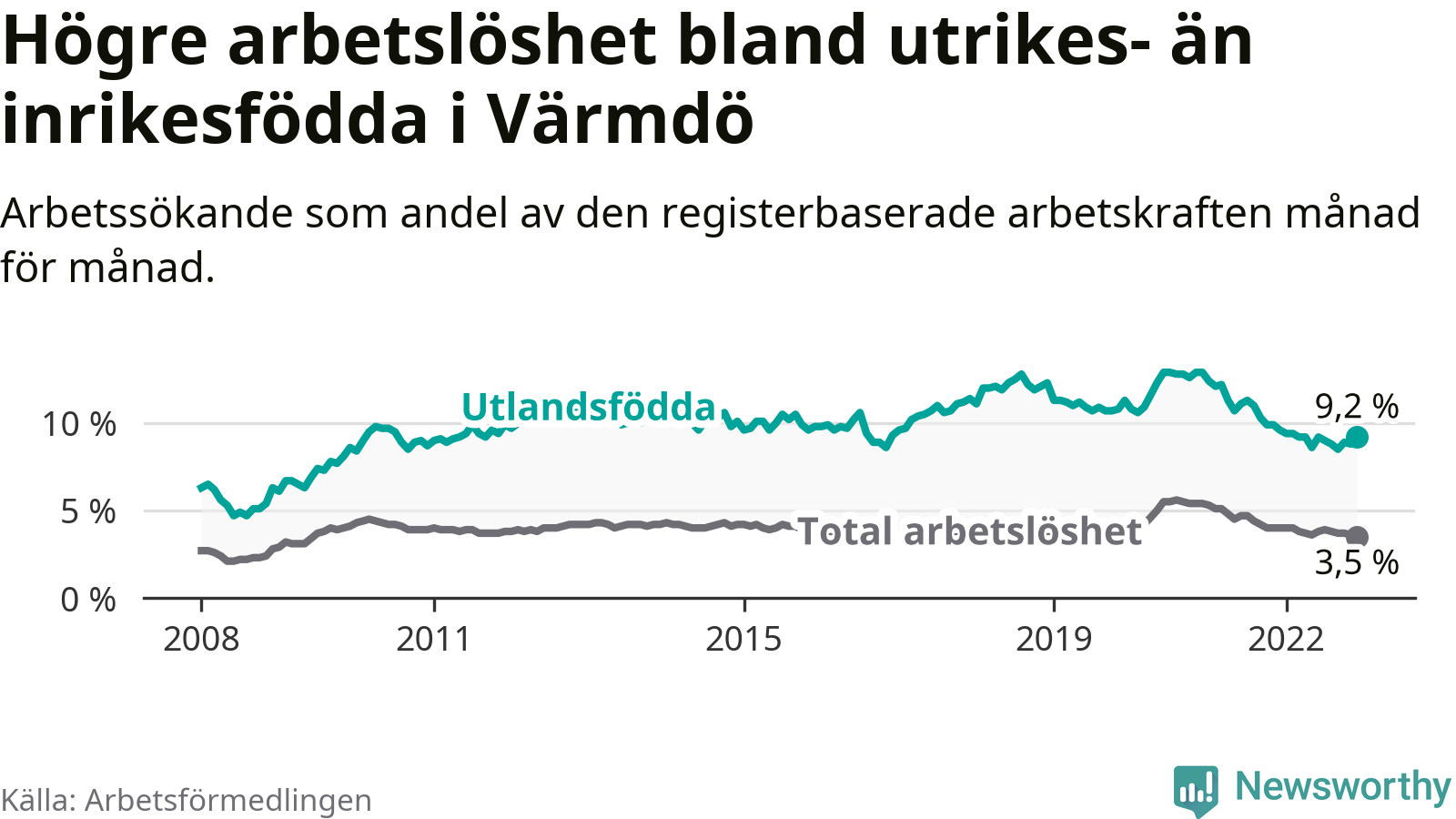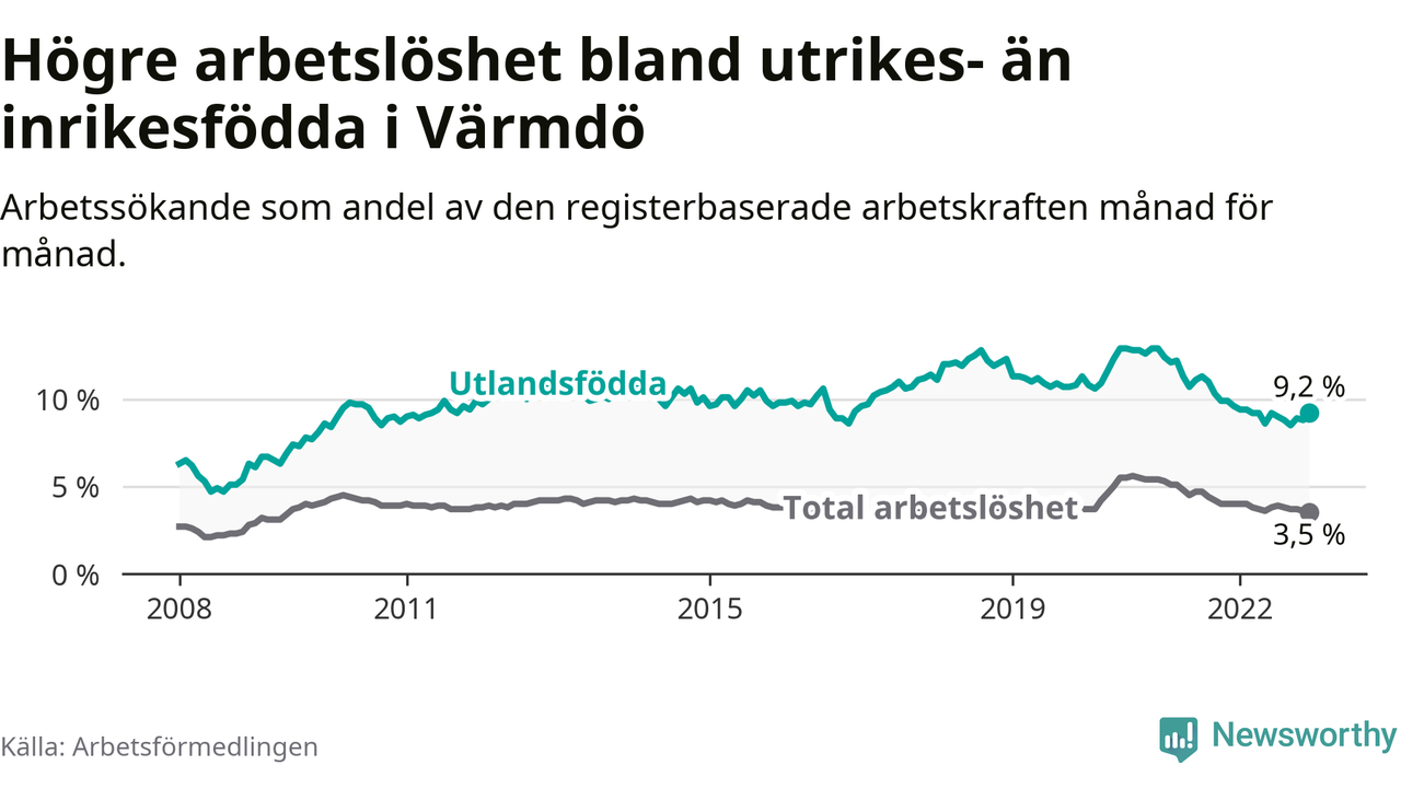 | Bland utlandsfödda | 9,2 % | −0,4 % ▼ | 12,9 % | −0,7 % ▼ | 16,6 % | −1,2 % ▼ |