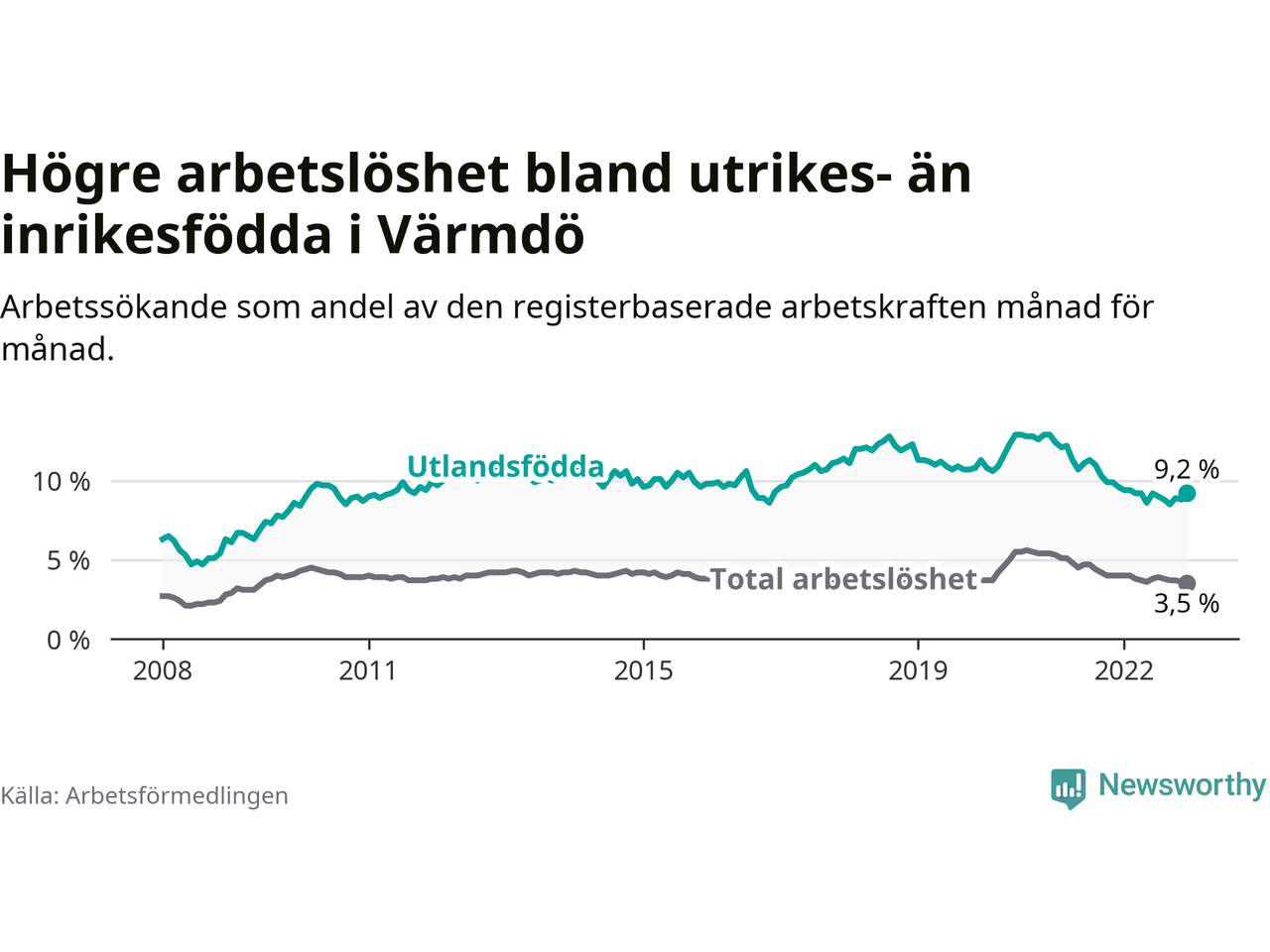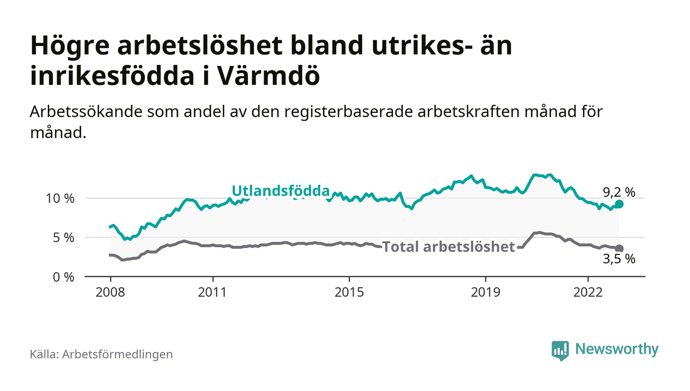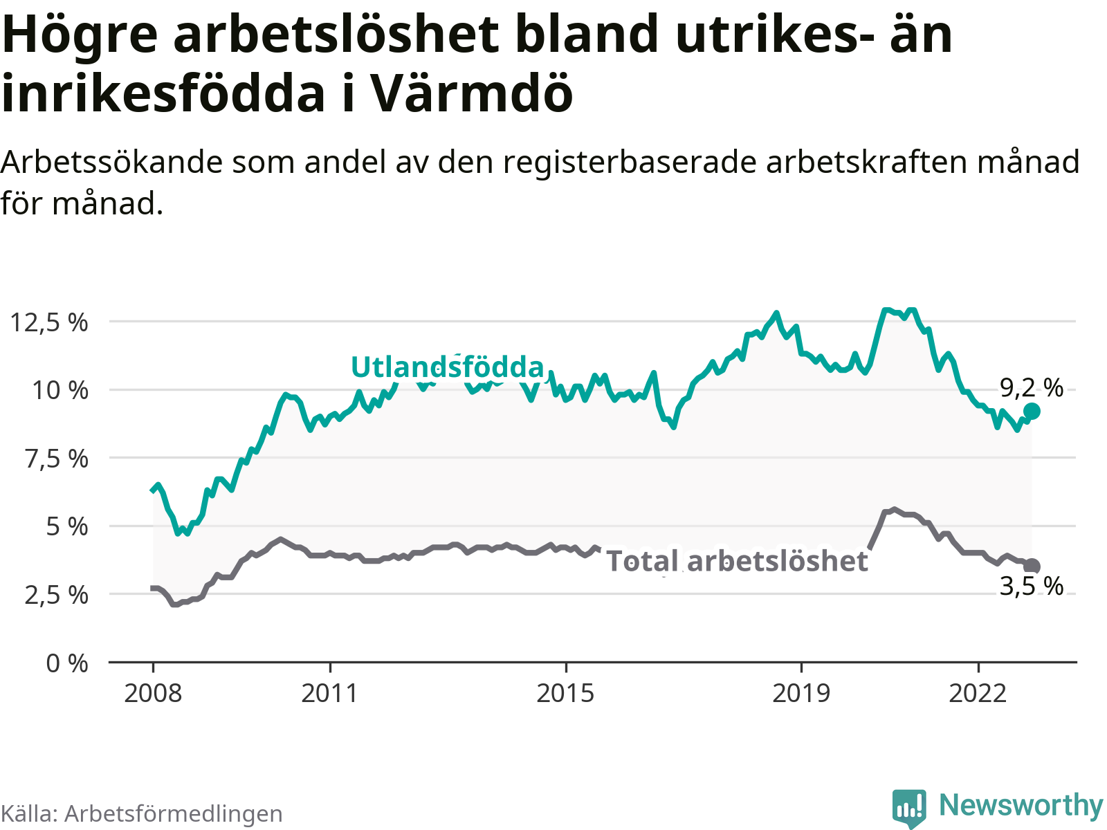 Arbetslösheten bland utlandsfödda var 9,2 procent i Värmdö under december månad, motsvarande 324 av 3 522 personer. Det är 0,4 procentenheter färre än vid samma tidpunkt i fjol (−8 om man räknar personer). Därmed är de utlandsföddas arbetslöshet lägre än vid samma tidpunkt i fjol för 21:a månaden i följd. Sedan mars 2021 har arbetslösheten bland utlandsfödda minskat från 12,2 till 9,2 procent.