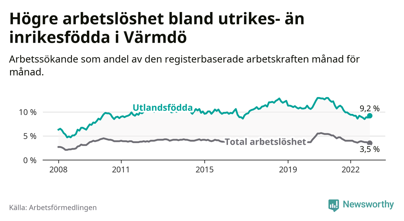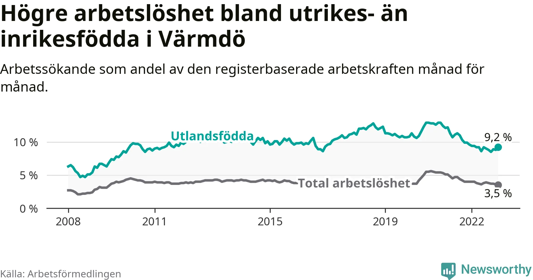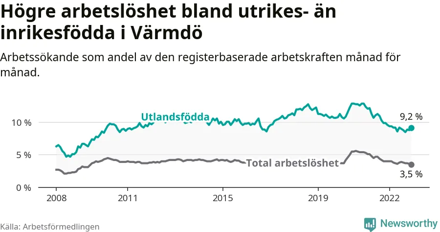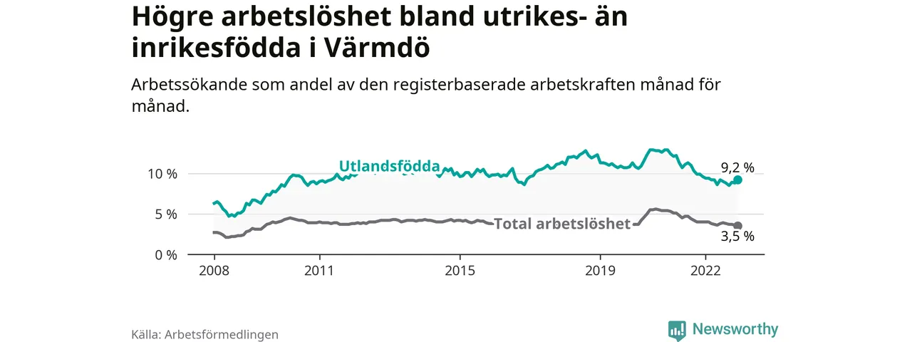 Arbetslösheten bland utlandsfödda var 9,2 procent i Värmdö under december månad, motsvarande 324 av 3 522 personer. Det är 0,4 procentenheter färre än vid samma tidpunkt i fjol (−8 om man räknar personer). Därmed är de utlandsföddas arbetslöshet lägre än vid samma tidpunkt i fjol för 21:a månaden i följd. Sedan mars 2021 har arbetslösheten bland utlandsfödda minskat från 12,2 till 9,2 procent.