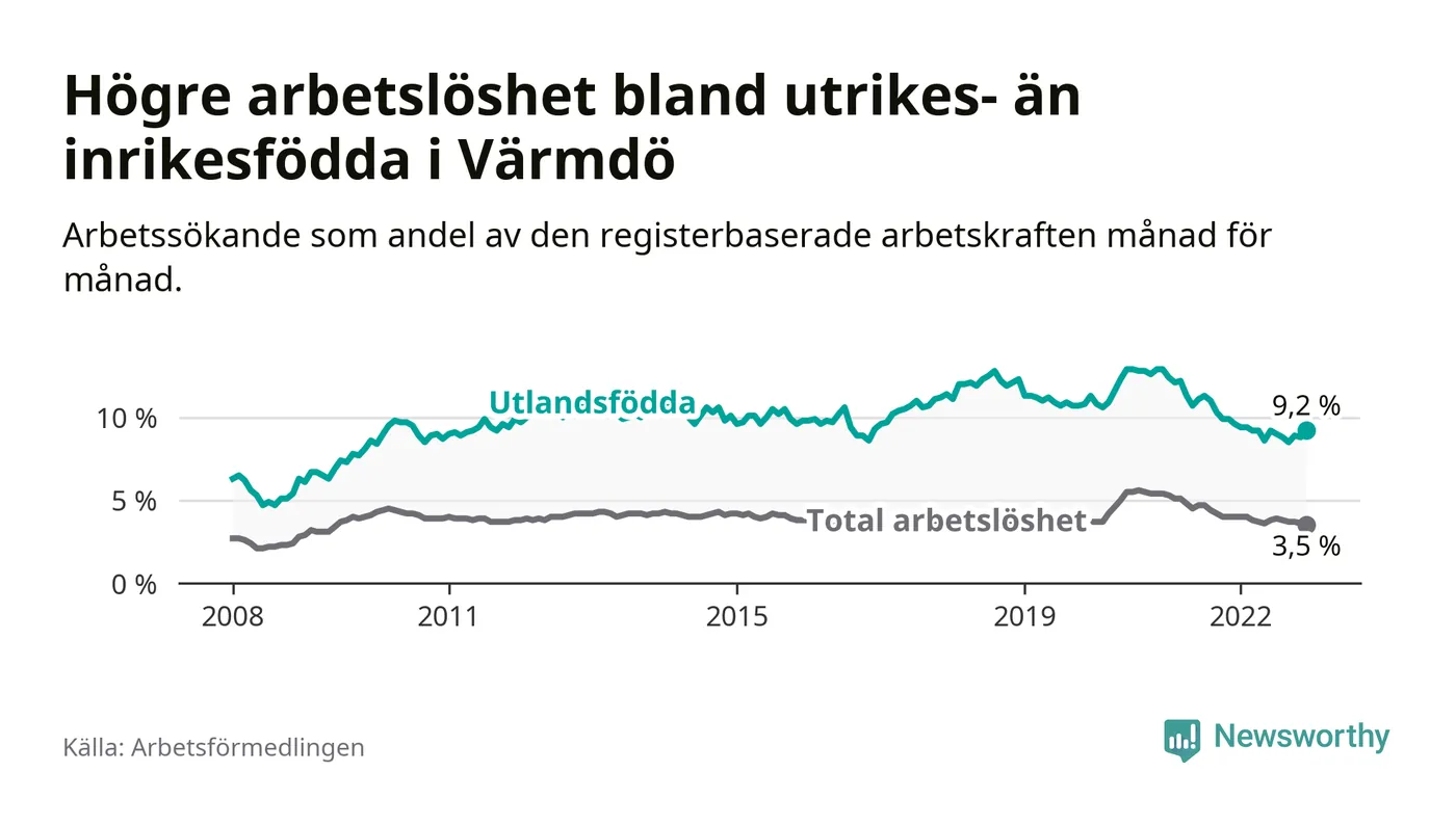 Den här skillnaden i arbetslöshet mellan inrikes- och utrikesfödda är förhållandevis stor i Värmdö om man jämför med andra kommuner i Stockholms län. Botkyrka har, relativt sett, den minsta skillnaden i arbetslöshet mellan inrikes- och utrikes födda i länet. Nykvarn har den största.