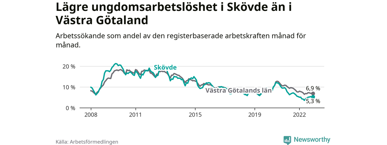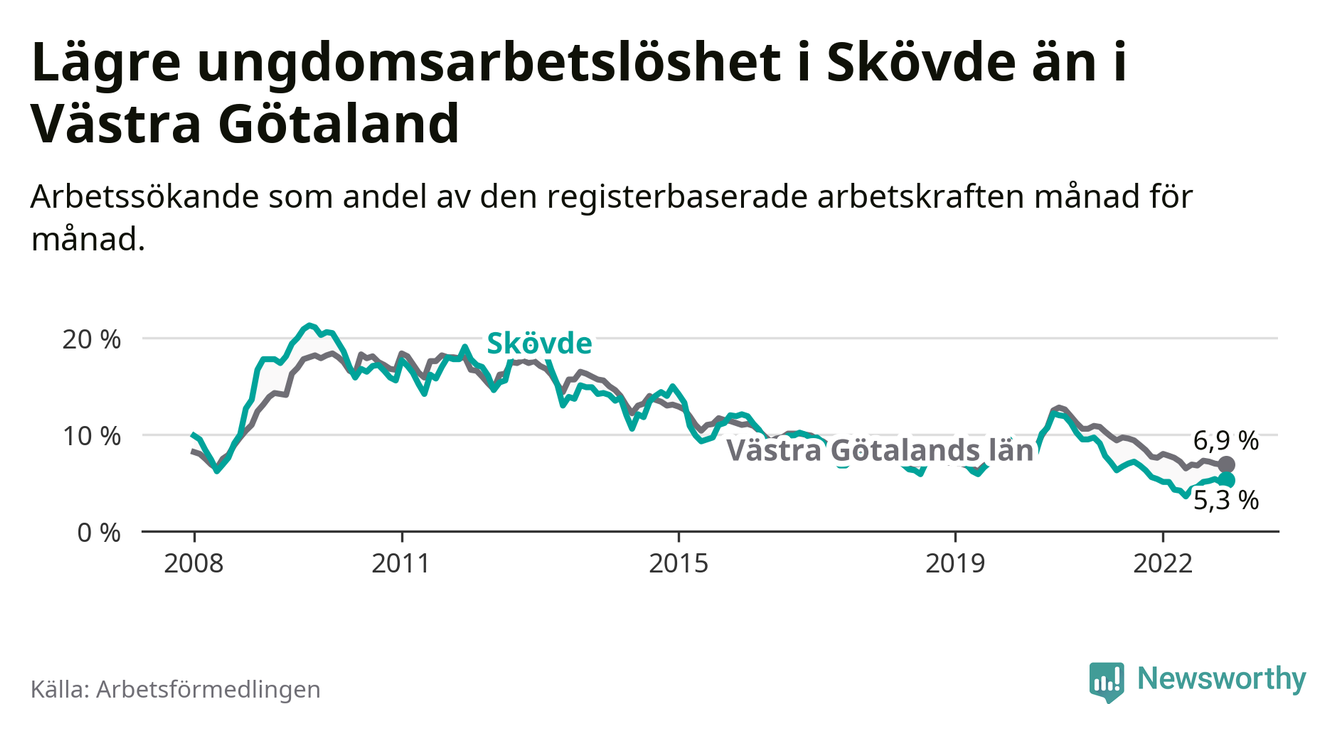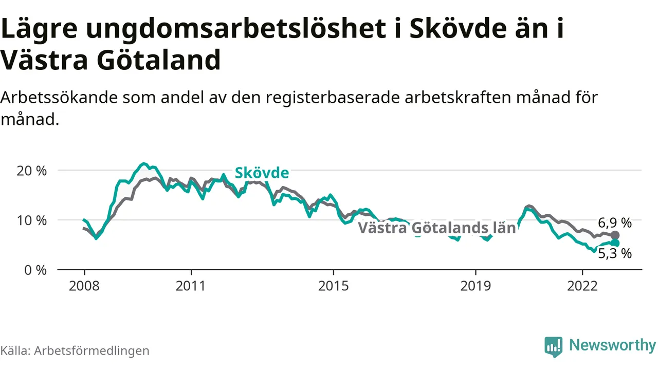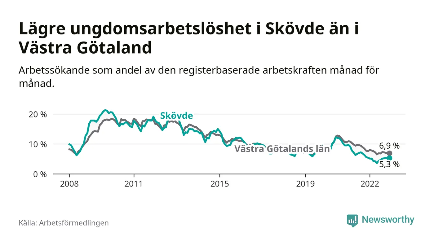 Precis som den totala arbetslösheten ligger ungdomsarbetslösheten i Skövde lägre än i Västra Götaland som helhet. Skillnaden mellan kommunen och länet är 1,6 procentenheter.