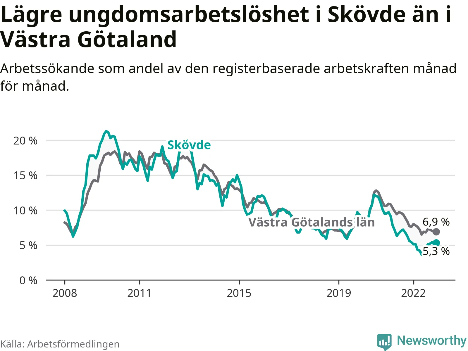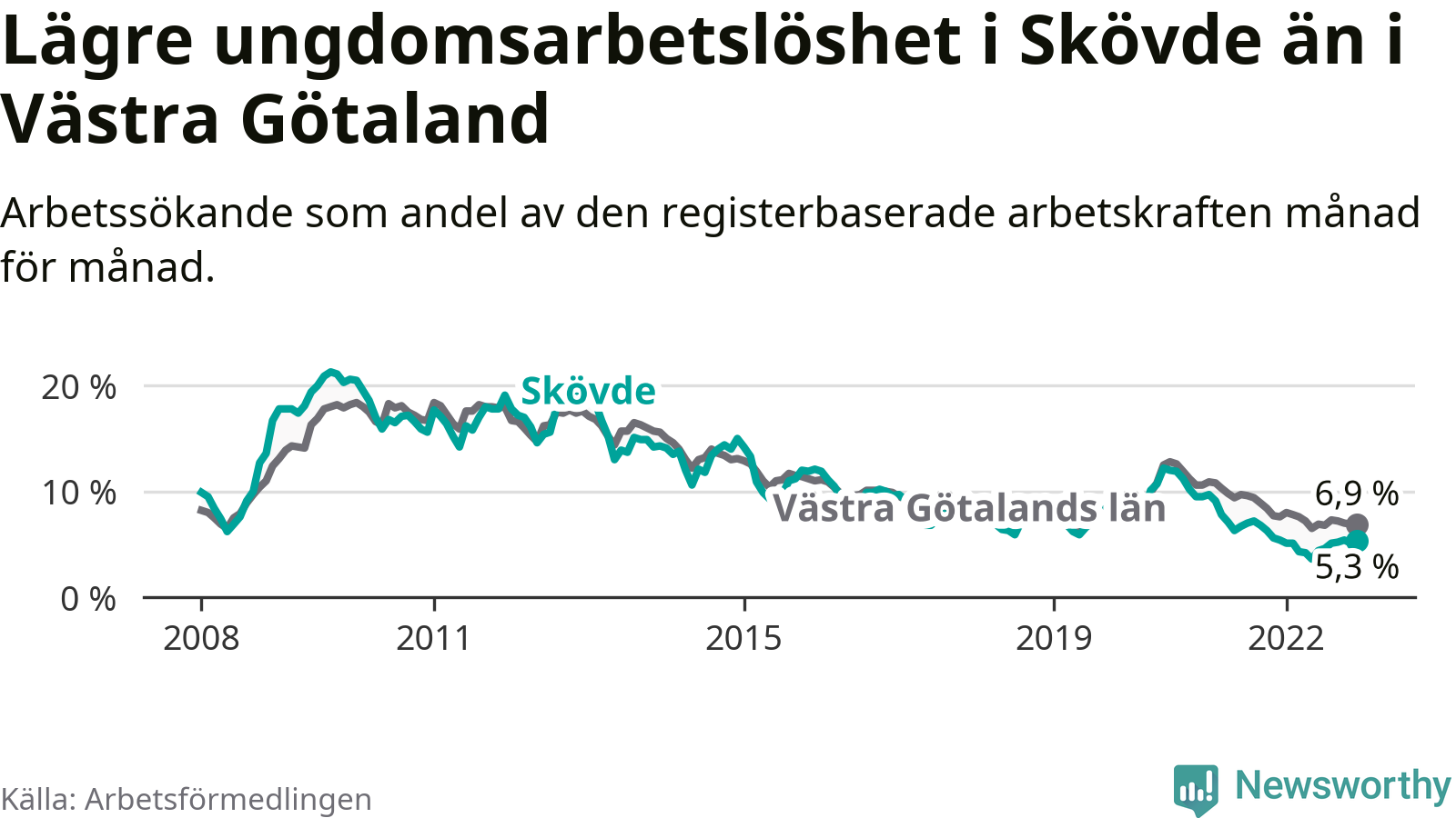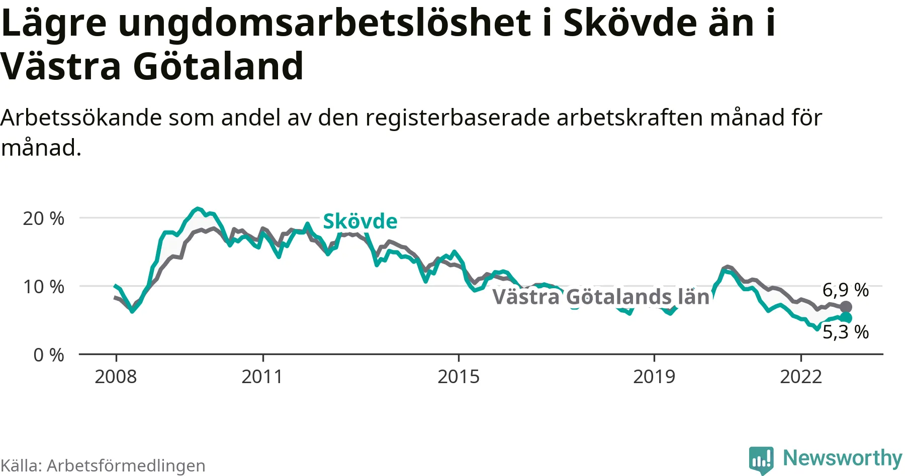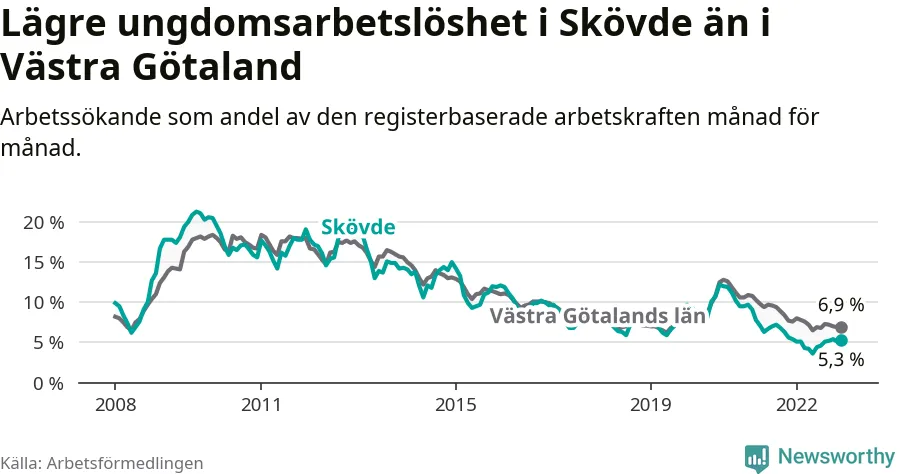 Precis som den totala arbetslösheten ligger ungdomsarbetslösheten i Skövde lägre än i Västra Götaland som helhet. Skillnaden mellan kommunen och länet är 1,6 procentenheter.