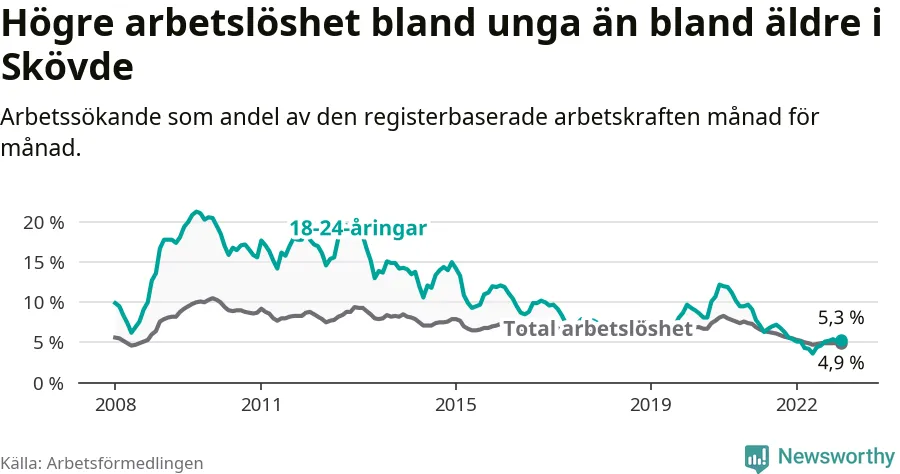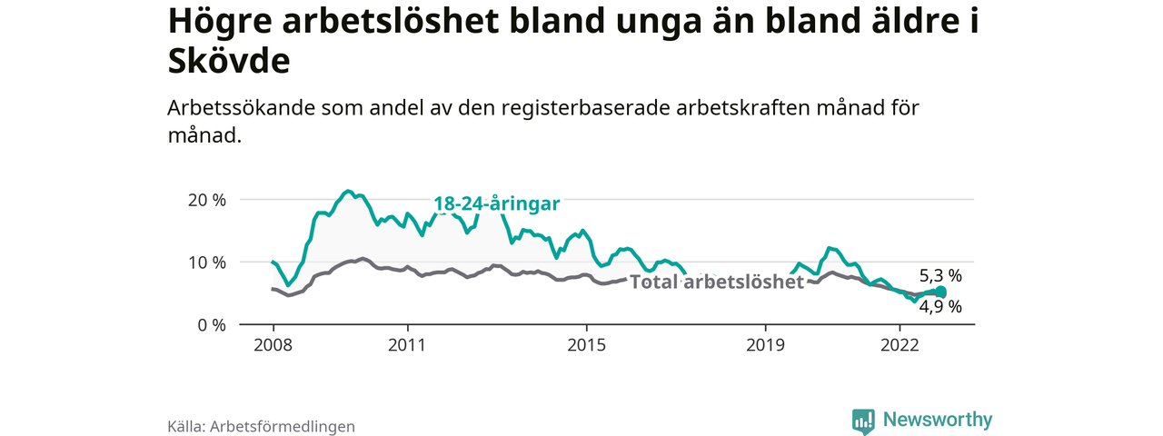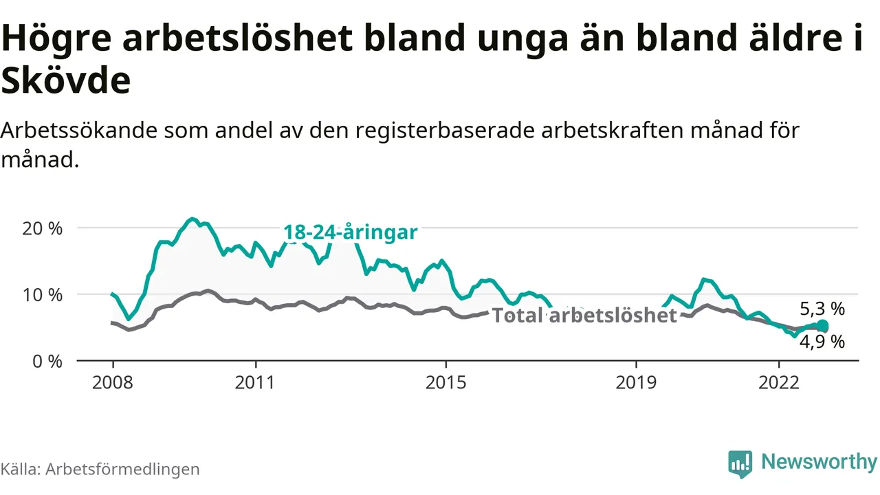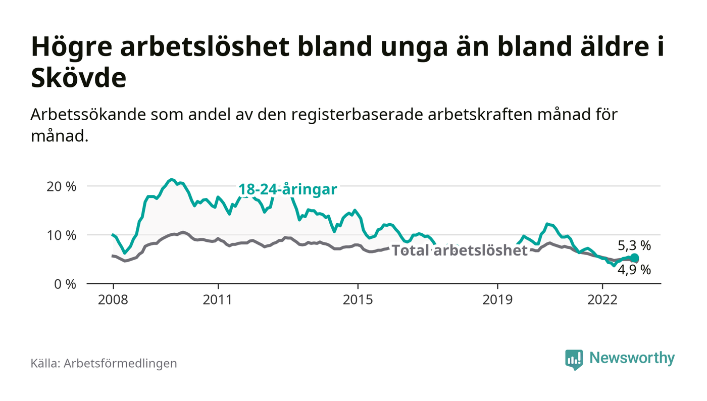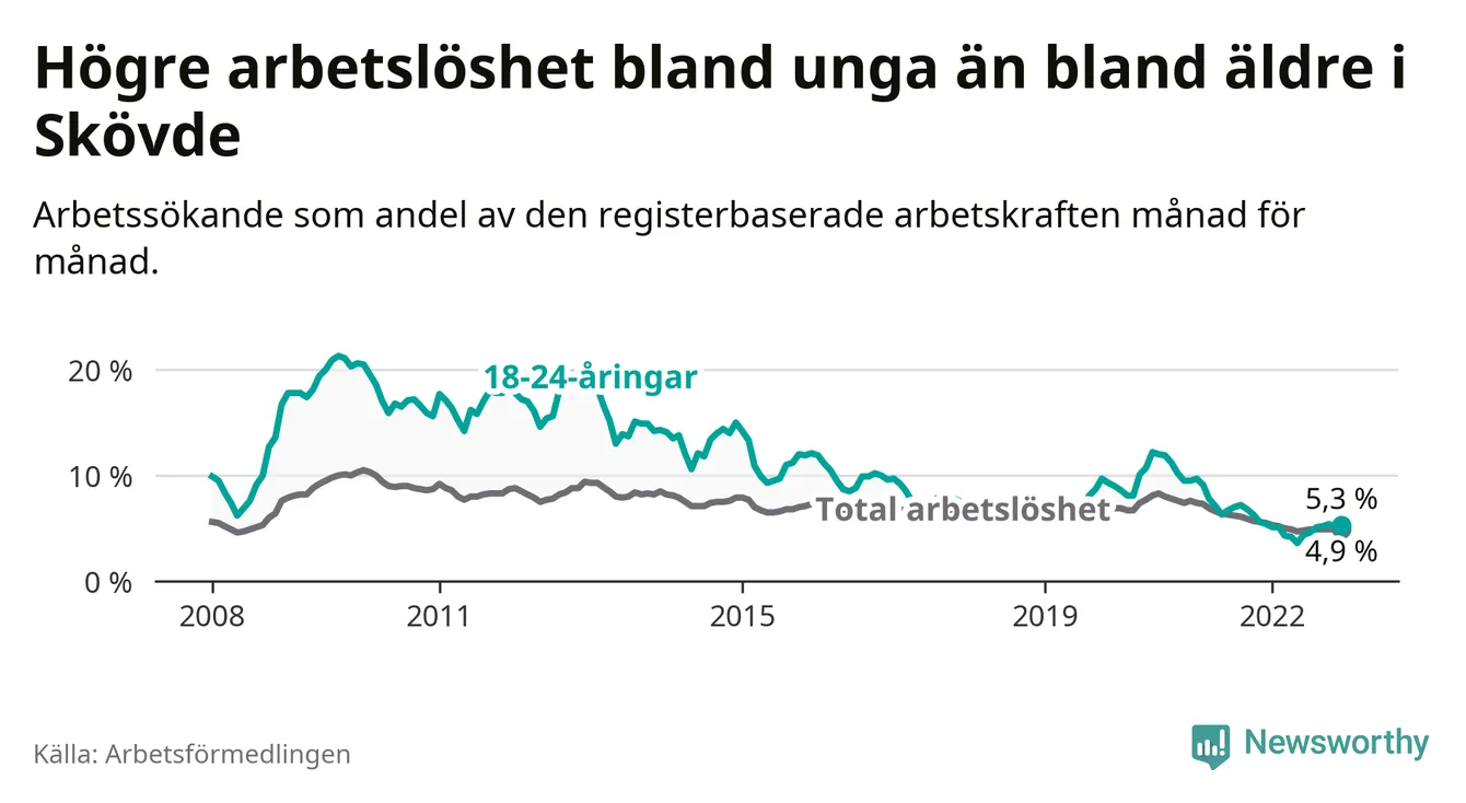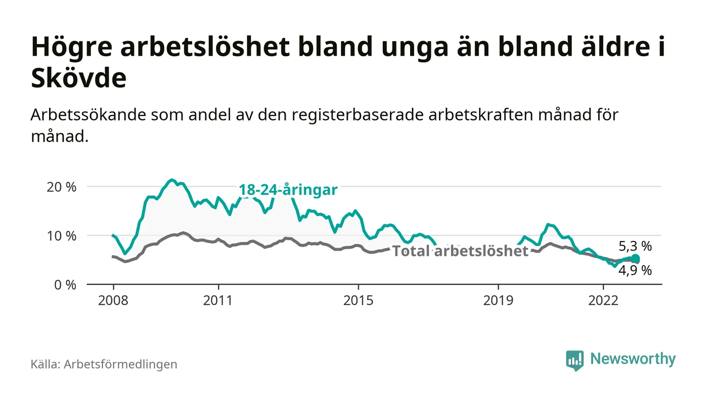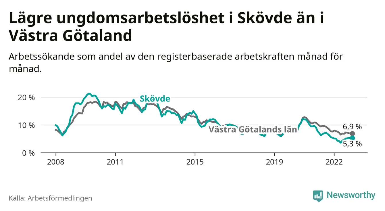 I och med den senaste månadens nedgång har de ungas arbetslöshet i Skövde sjunkit 22 månader i följd (ner från 9,1 procent i februari 2021 till 5,3 procent nu).