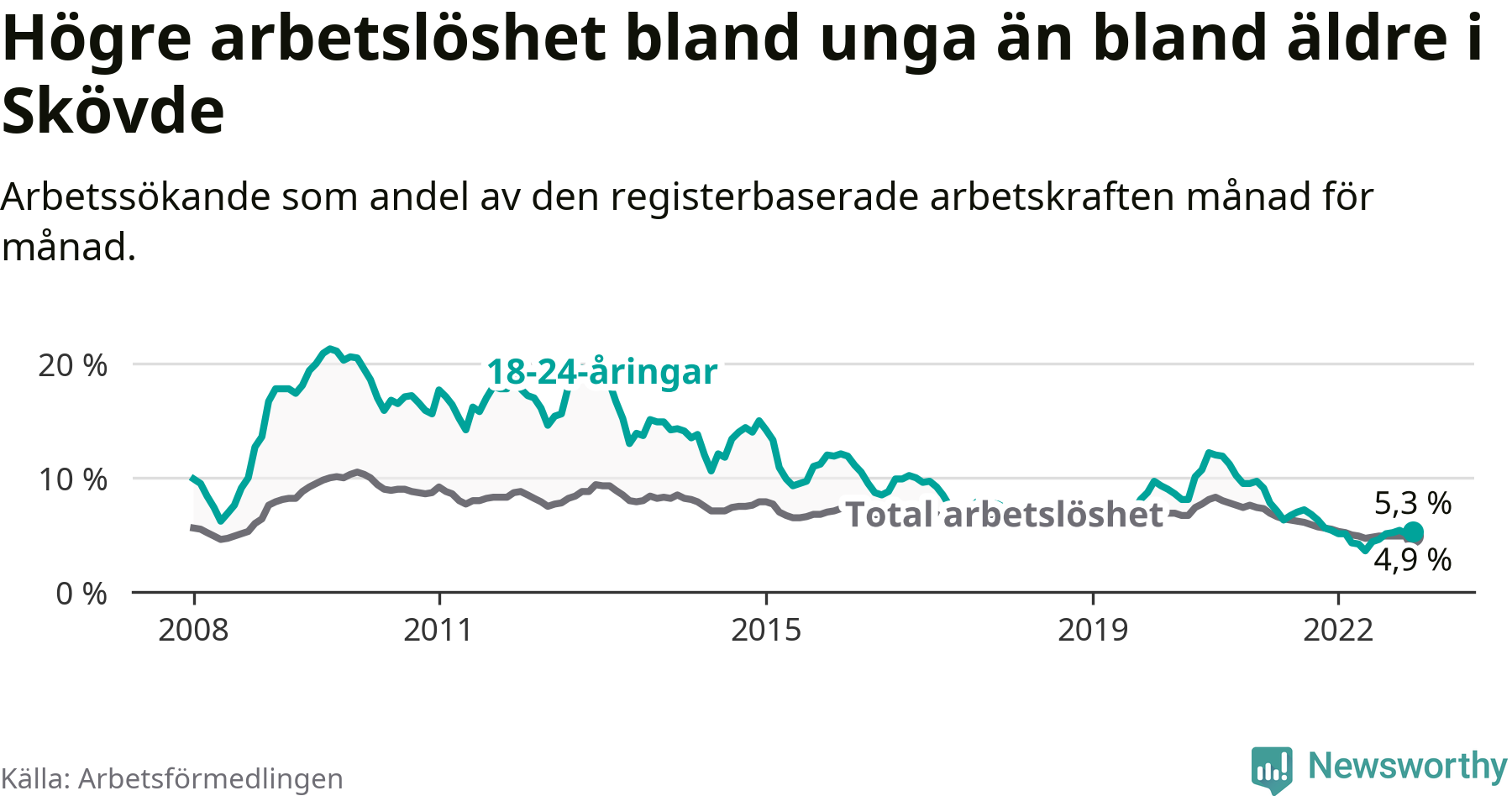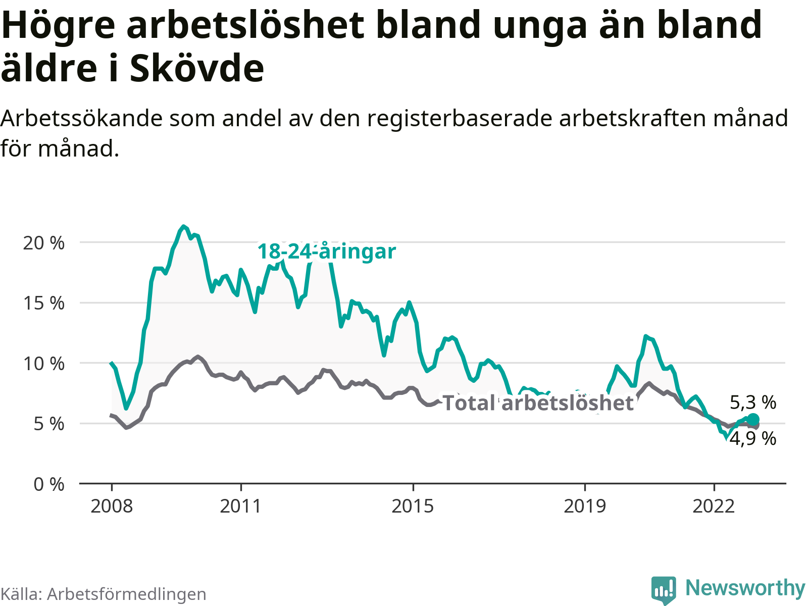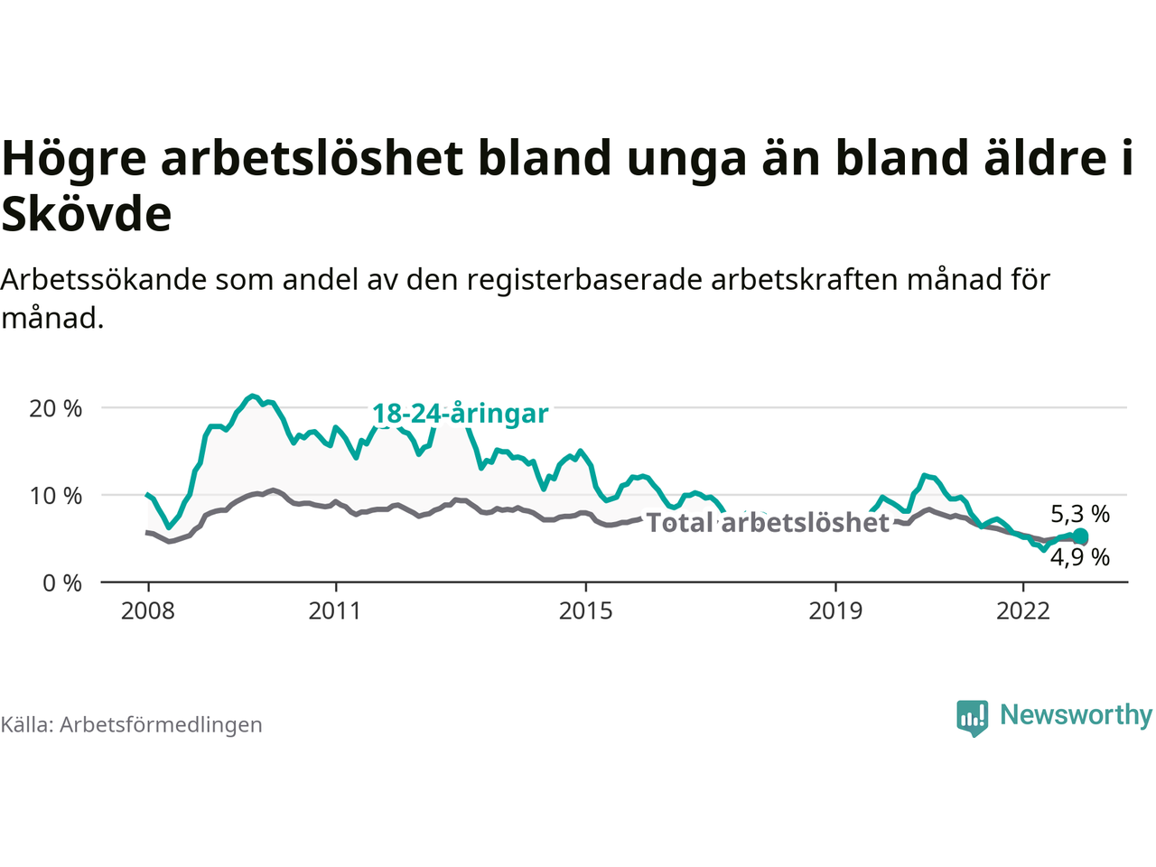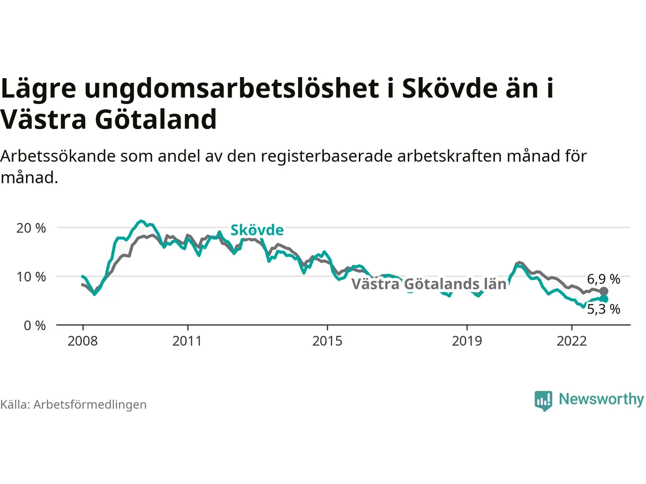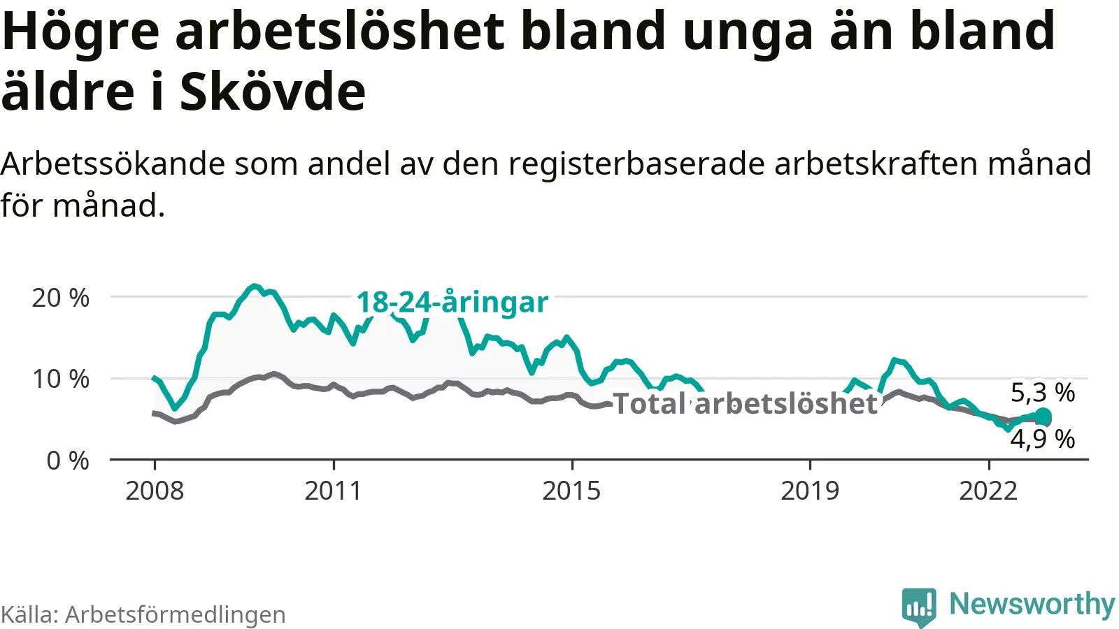 I och med den senaste månadens nedgång har de ungas arbetslöshet i Skövde sjunkit 22 månader i följd (ner från 9,1 procent i februari 2021 till 5,3 procent nu).