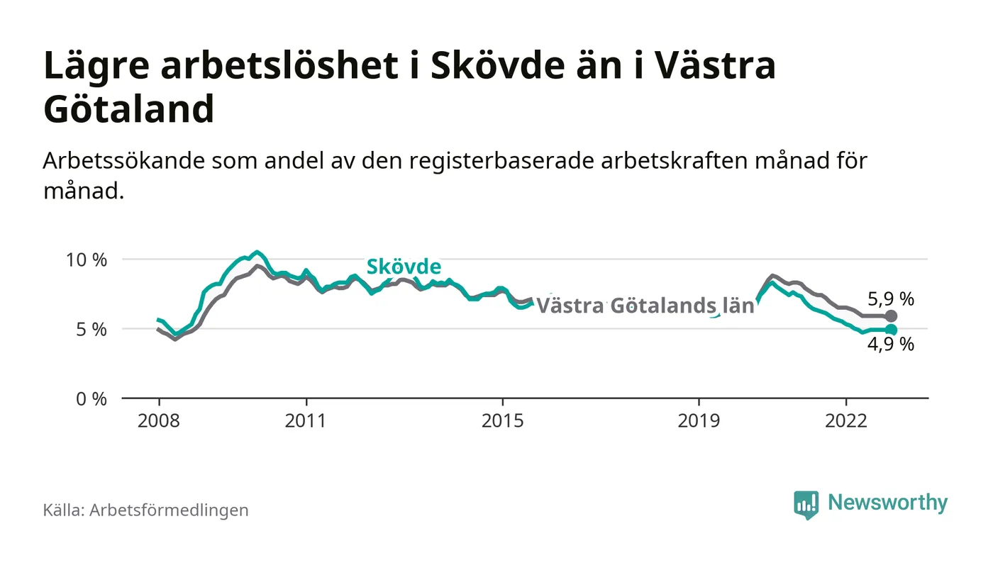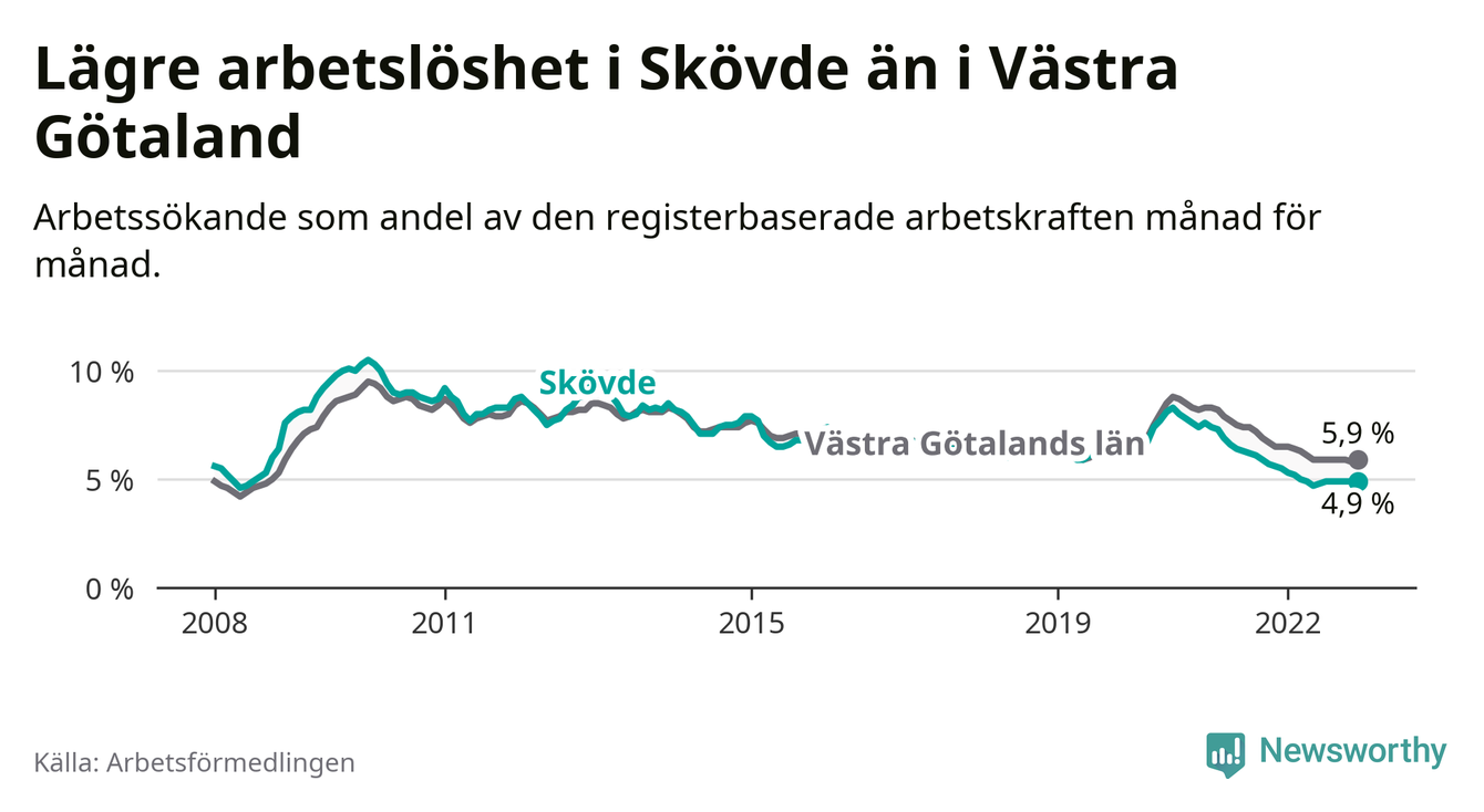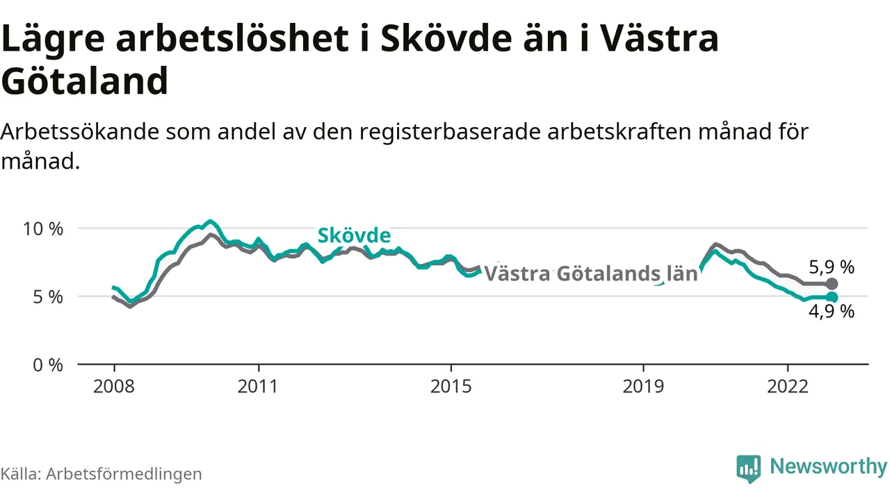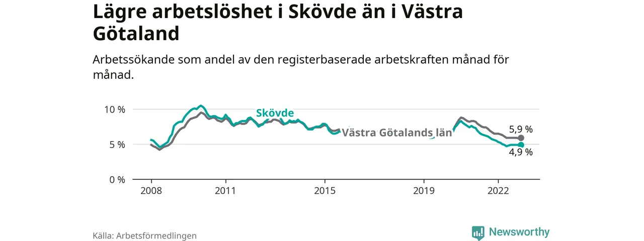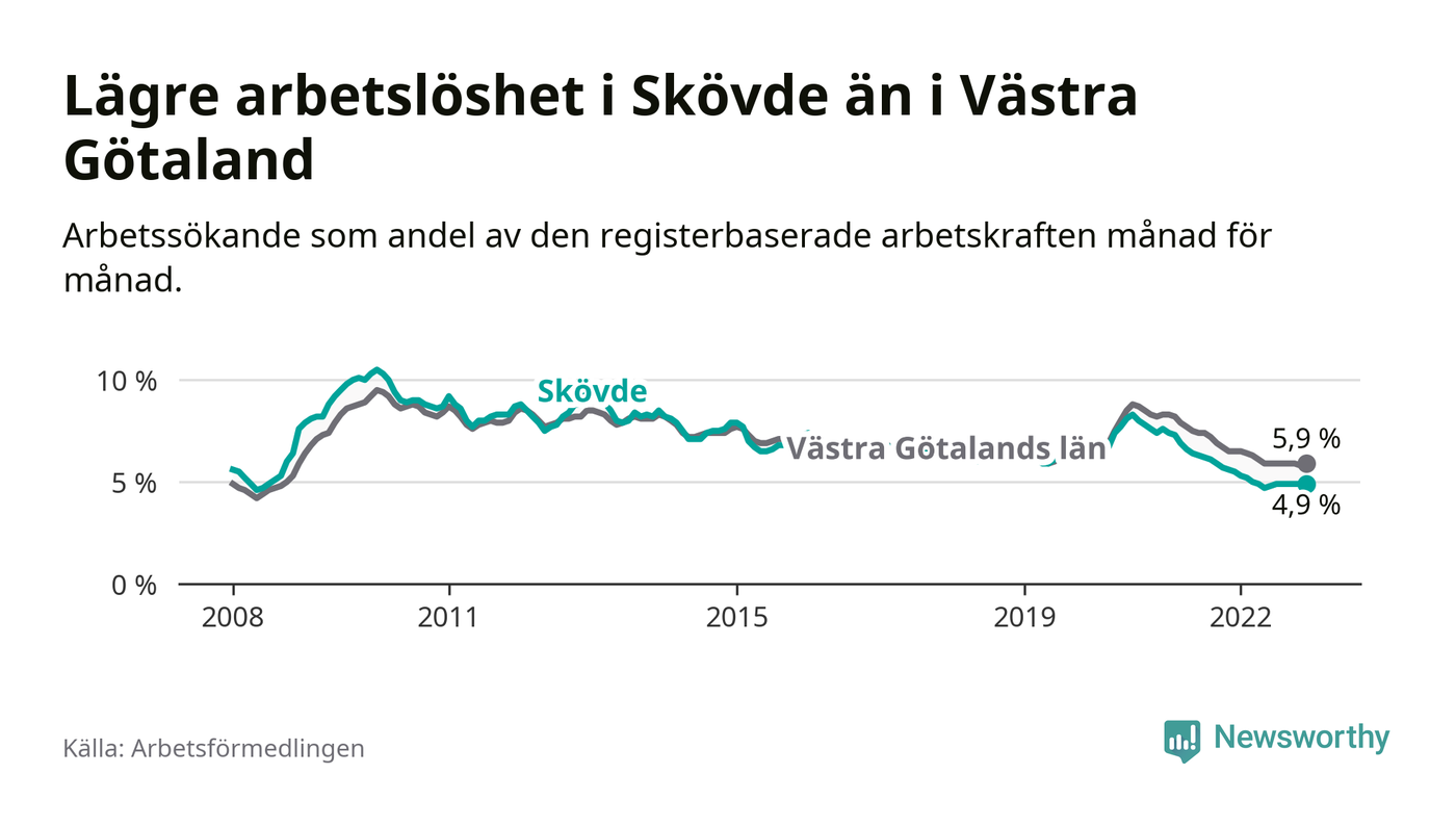 Skövde hade redan tidigare lägre arbetslöshet än snittet i hela Västra Götalands län och nu växer klyftan (4,9 procent i kommunen, jämfört med 5,9 procent i hela länet). Tjörn och Öckerö har den lägsta arbetslösheten i länet (2,6 procent), medan Trollhättan har den högsta (9,1 procent). För att Skövde skulle komma ner i samma arbetslöshetsnivå som Tjörn och Öckerö skulle 655 personer behöva sysselsättas.