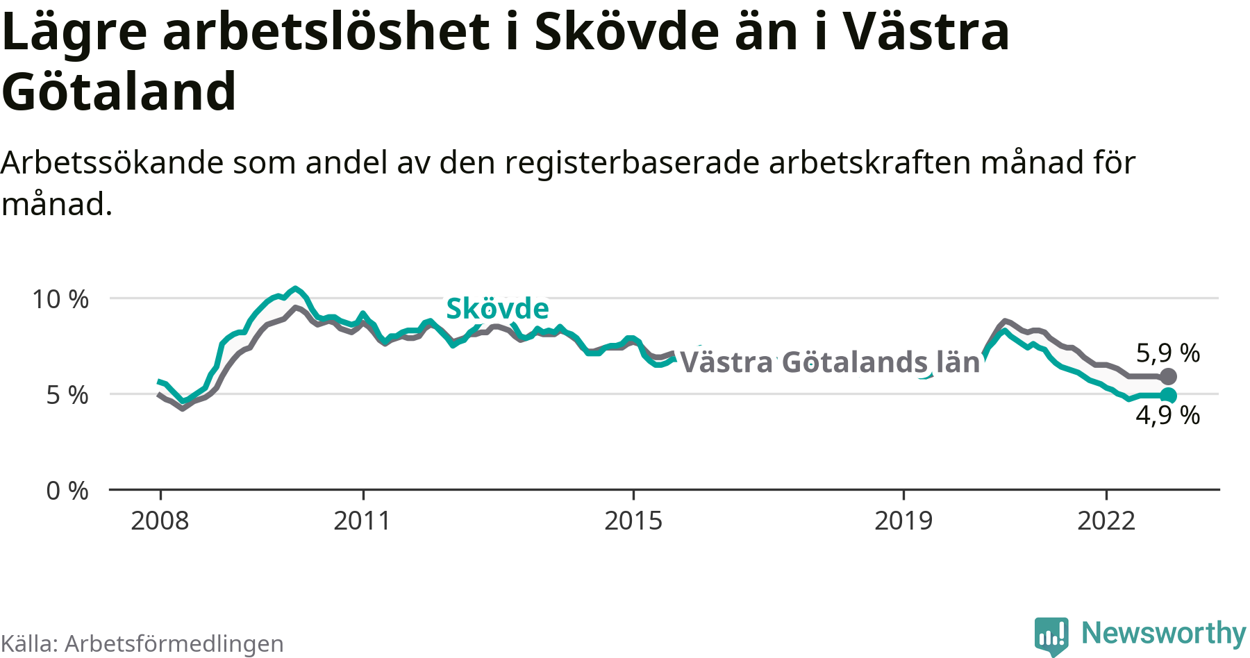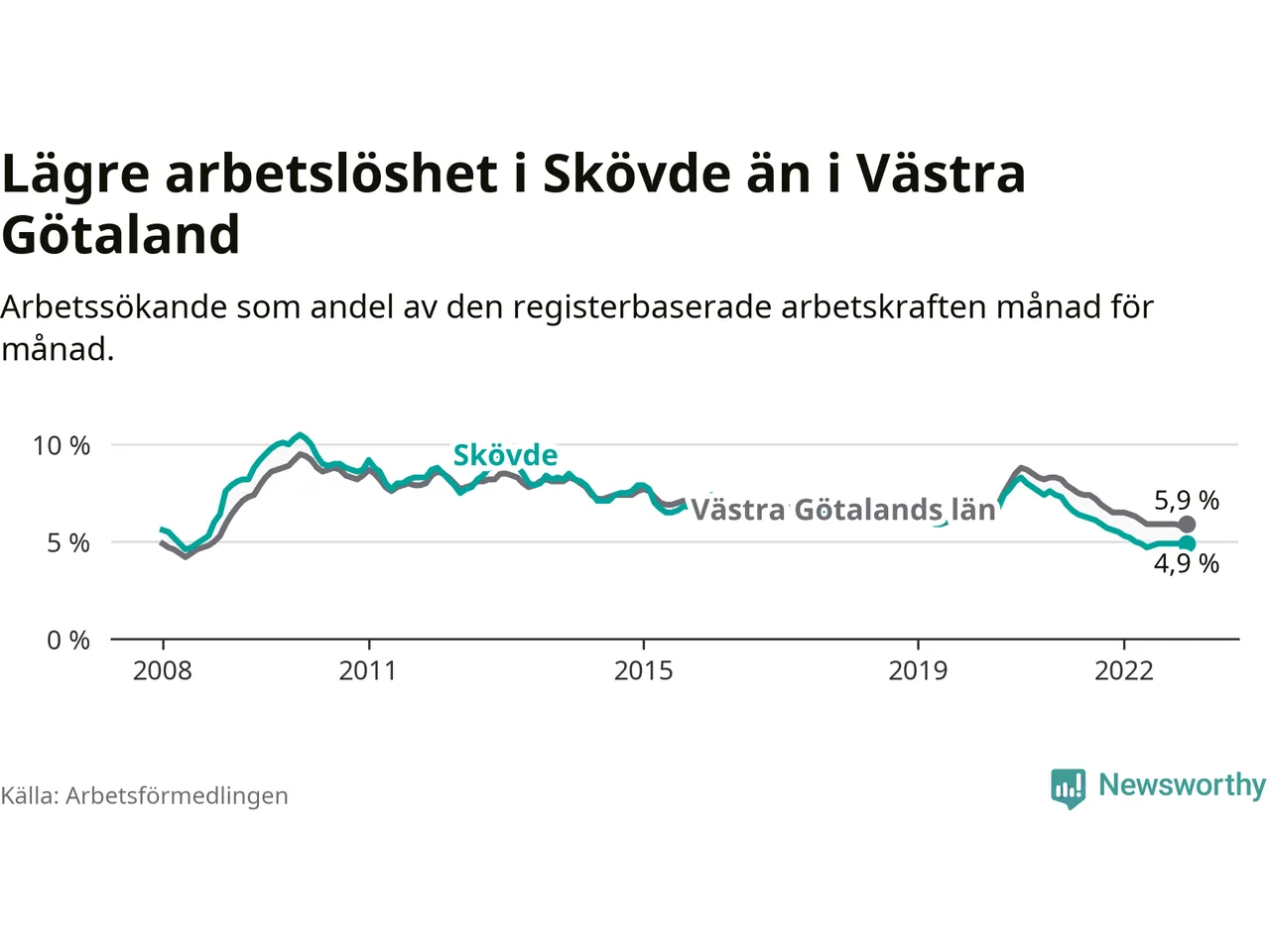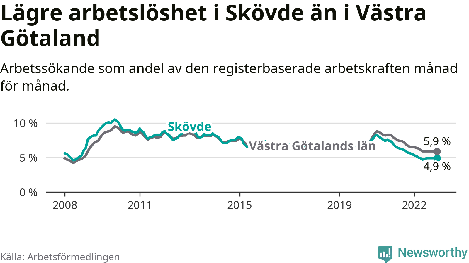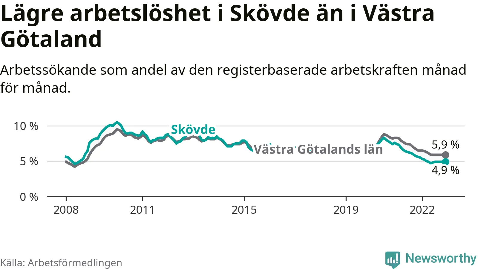 Skövde hade redan tidigare lägre arbetslöshet än snittet i hela Västra Götalands län och nu växer klyftan (4,9 procent i kommunen, jämfört med 5,9 procent i hela länet). Tjörn och Öckerö har den lägsta arbetslösheten i länet (2,6 procent), medan Trollhättan har den högsta (9,1 procent). För att Skövde skulle komma ner i samma arbetslöshetsnivå som Tjörn och Öckerö skulle 655 personer behöva sysselsättas.