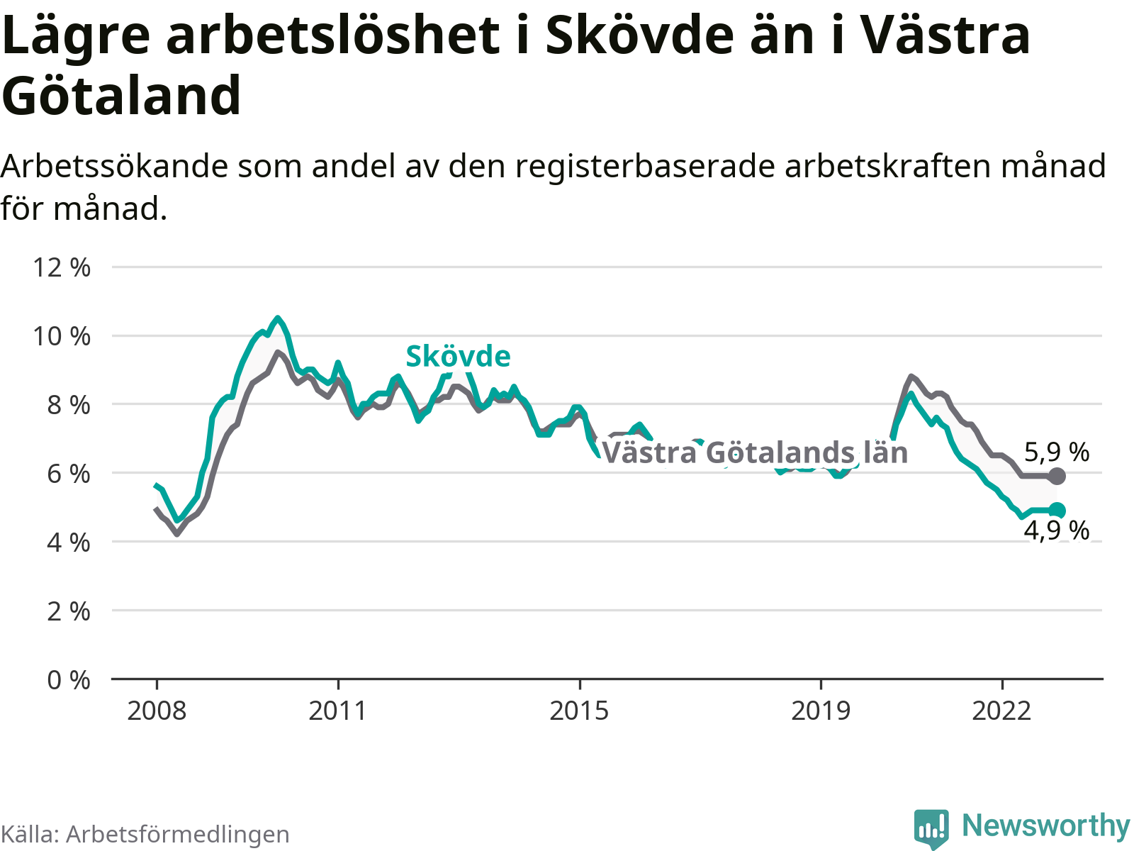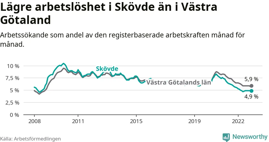Under december månad rapporterade Skövde kommun en total arbetslöshet på 4,9 procent. Det är en minskning jämfört med samma tidpunkt i fjol (−0,6 procentenheter). Även i Västra Götalands län sjunker arbetslösheten .