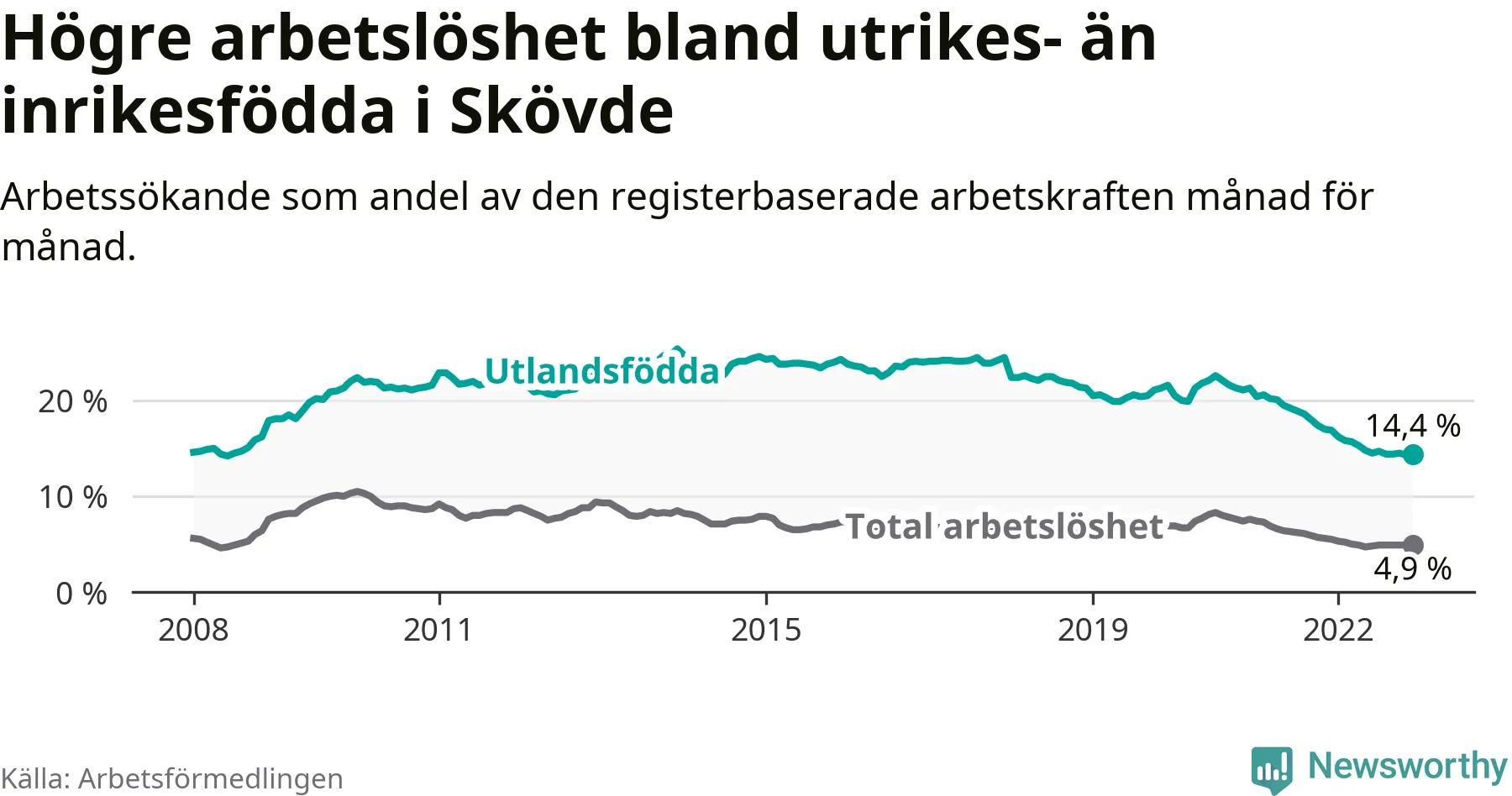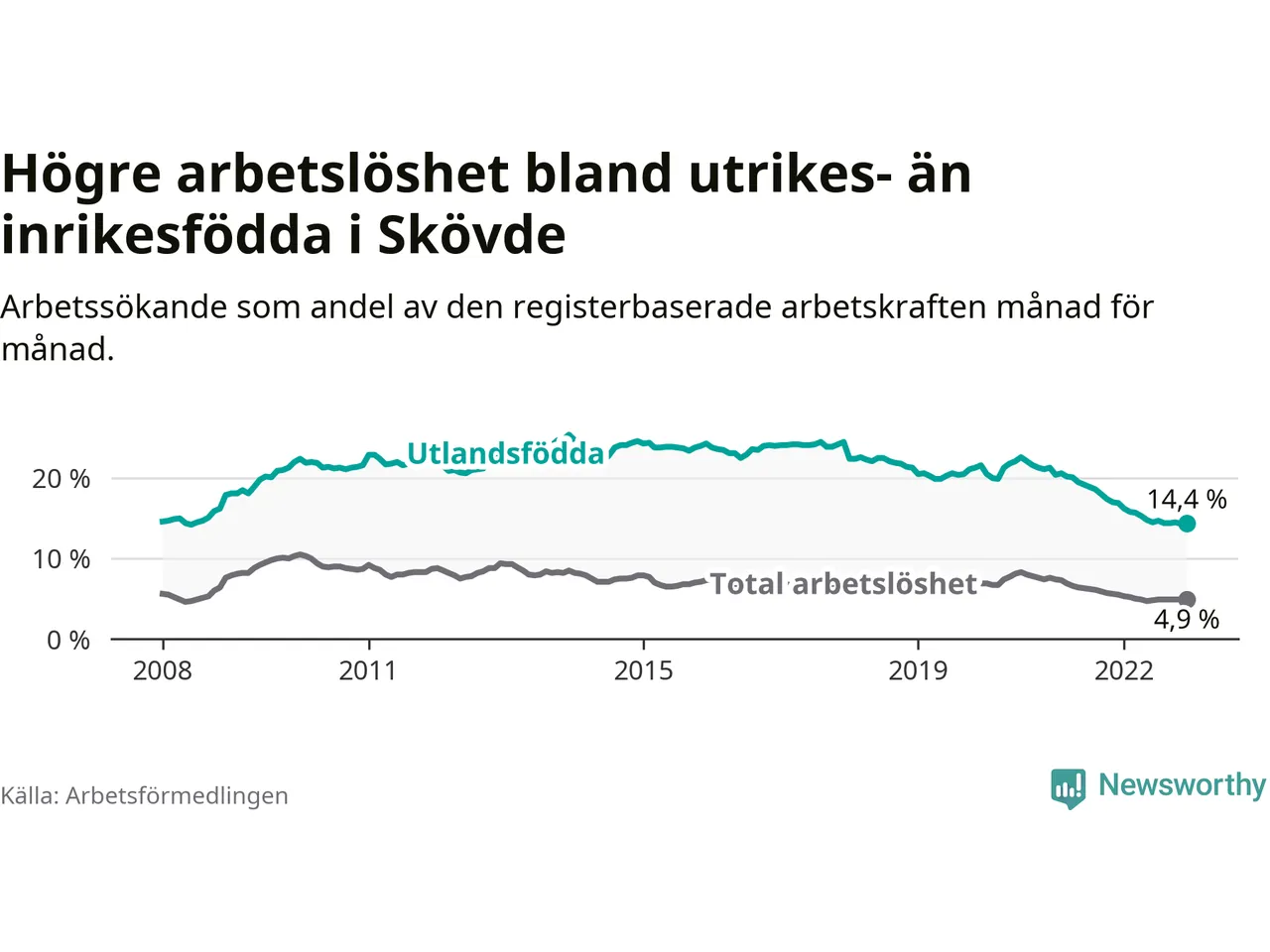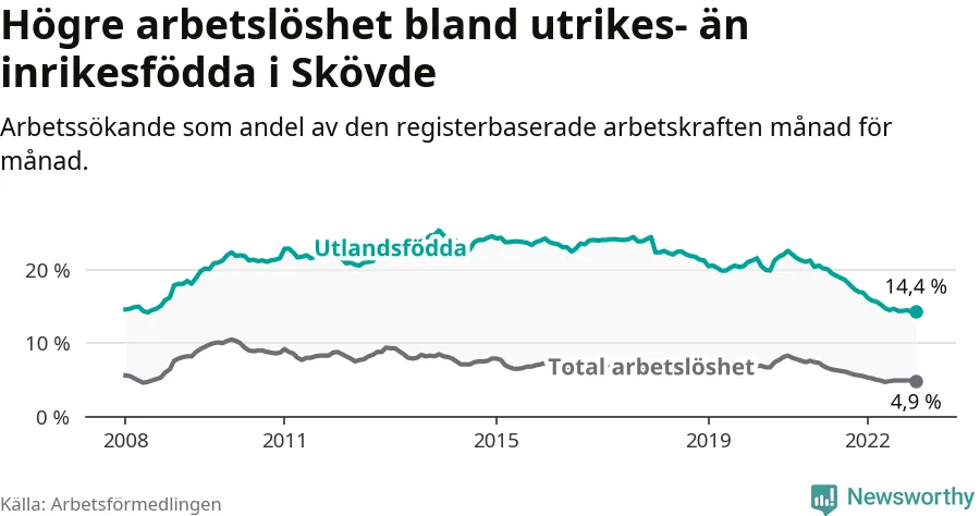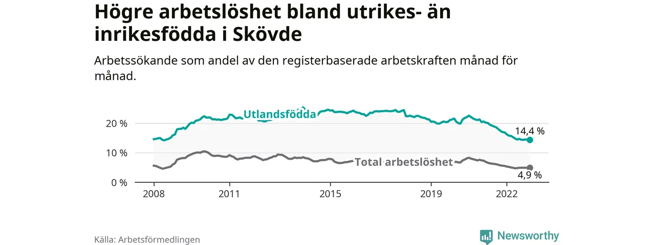 Skillnaden i arbetslöshet mellan utrikesfödda och hela befolkningen är 9,5 procentenheter i Skövde. Det är en betydligt mindre skillnad än för ett år sedan (−1,9 procentenheter).