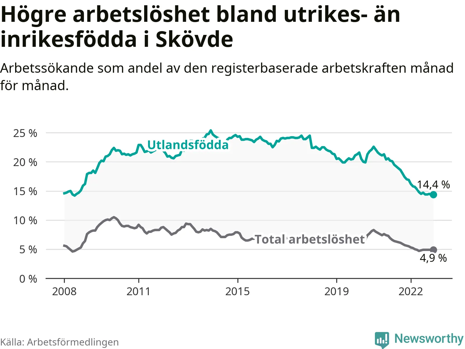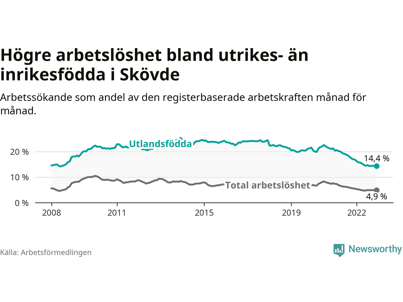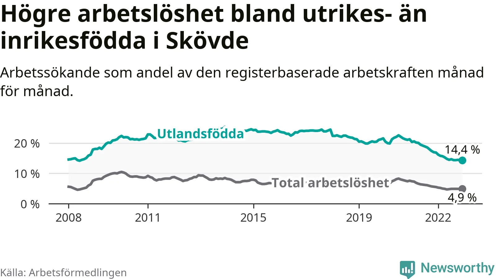 Skillnaden i arbetslöshet mellan utrikesfödda och hela befolkningen är 9,5 procentenheter i Skövde. Det är en betydligt mindre skillnad än för ett år sedan (−1,9 procentenheter).