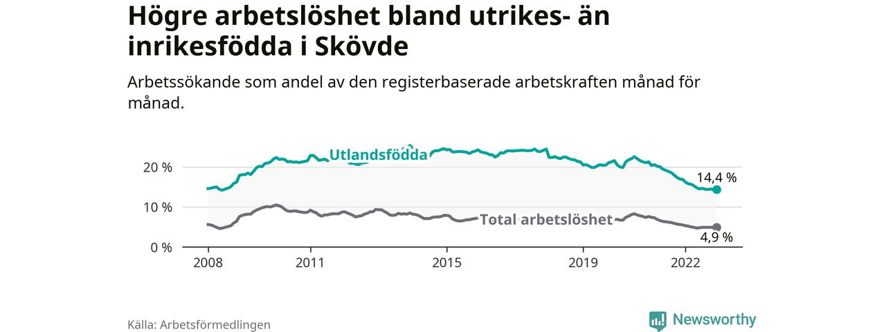 Arbetslösheten bland utlandsfödda var 14,4 procent i Skövde under december månad, motsvarande 721 av 5 007 personer. Det är 2,5 procentenheter färre än vid samma tidpunkt i fjol (−132 om man räknar personer). Därmed är de utlandsföddas arbetslöshet lägre än vid samma tidpunkt i fjol för 21:a månaden i följd. Sedan mars 2021 har arbetslösheten bland utlandsfödda minskat från 20,2 till 14,4 procent.