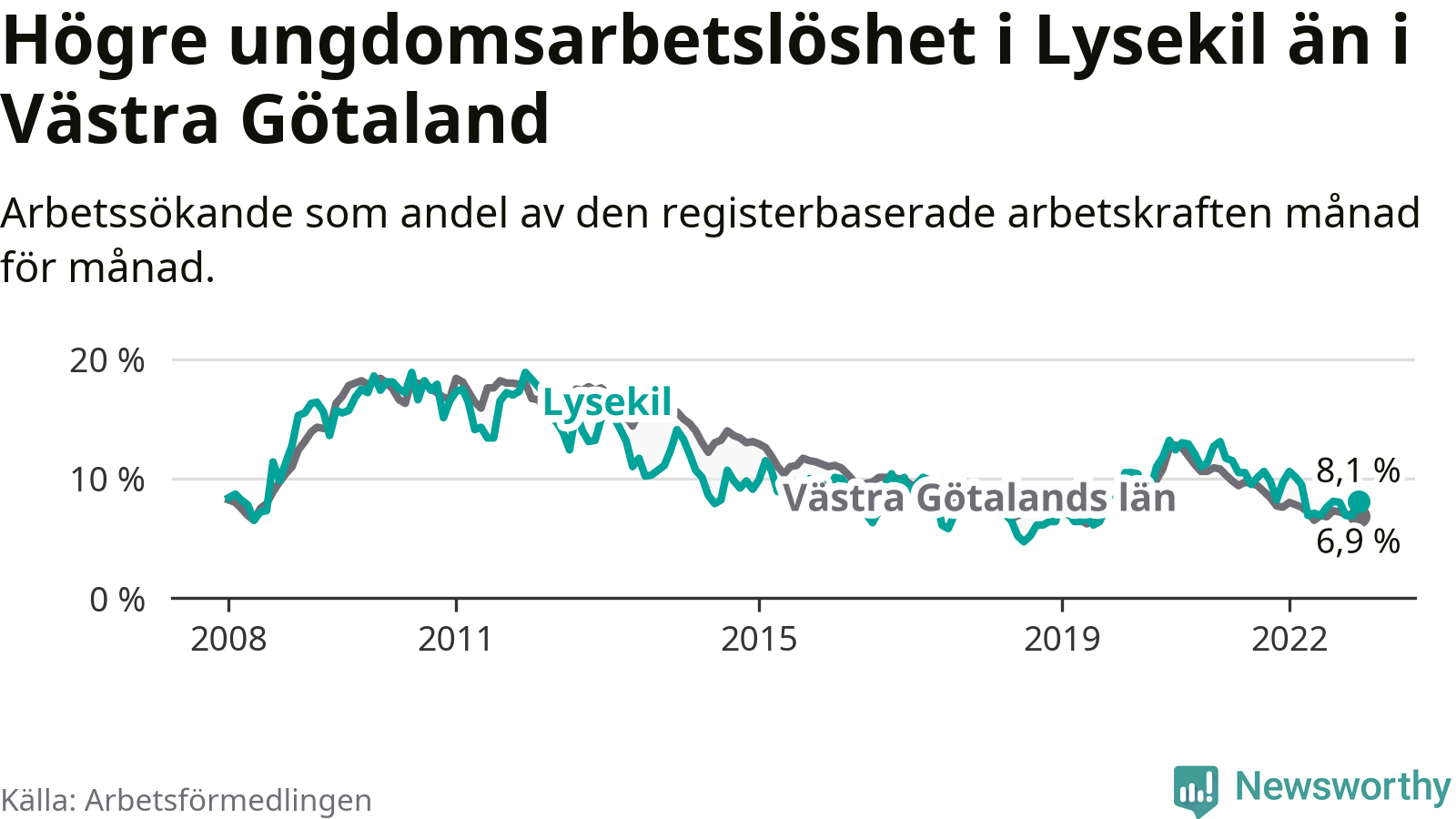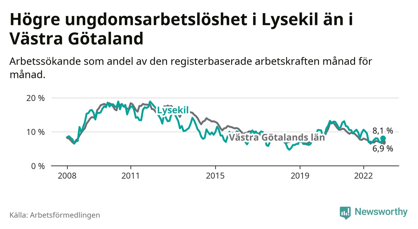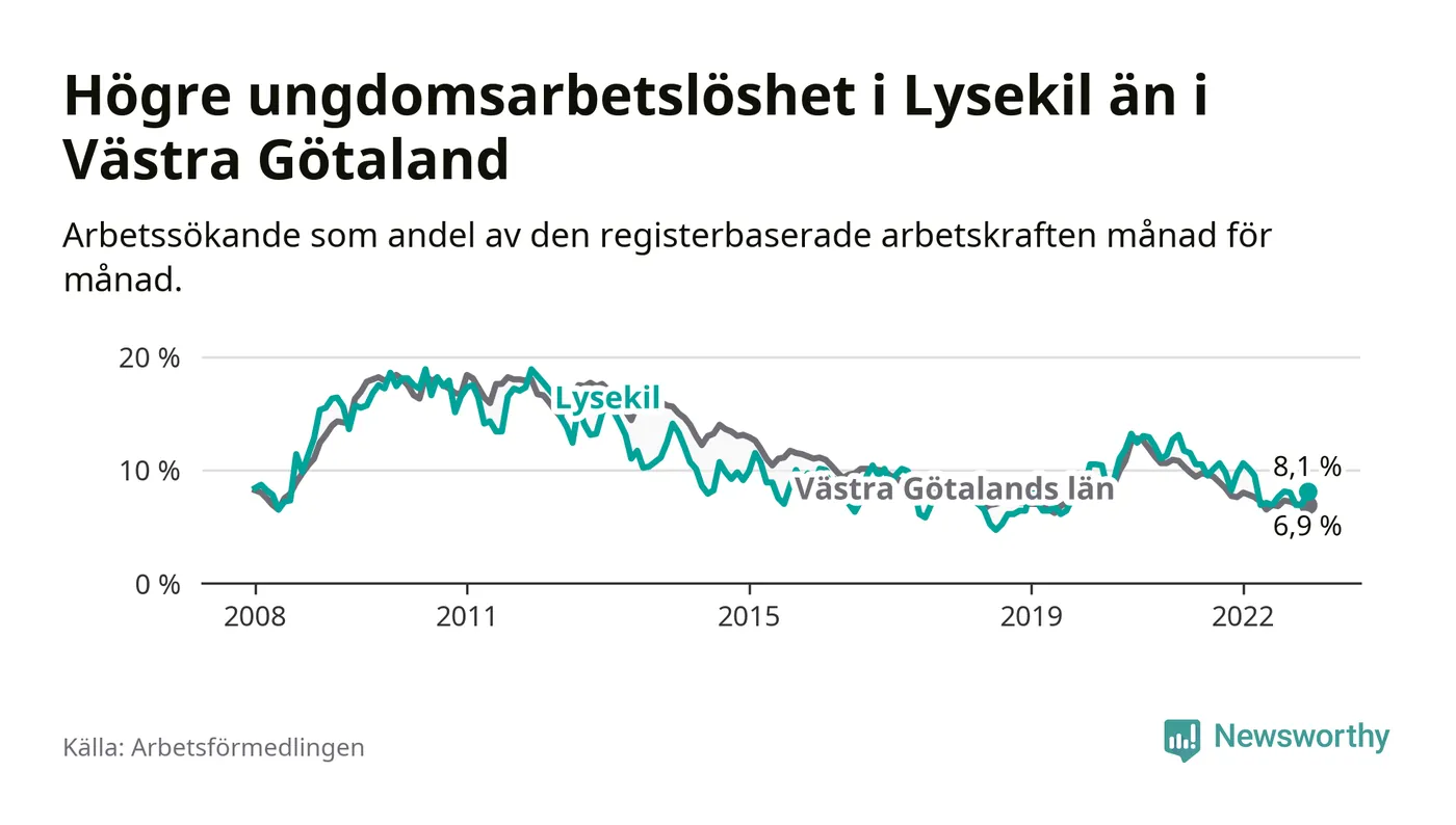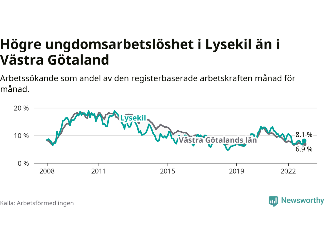 Precis som den totala arbetslösheten ligger ungdomsarbetslösheten i Lysekil högre än i Västra Götaland som helhet. Skillnaden mellan kommunen och länet är 1,2 procentenheter.