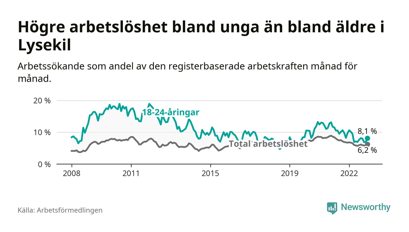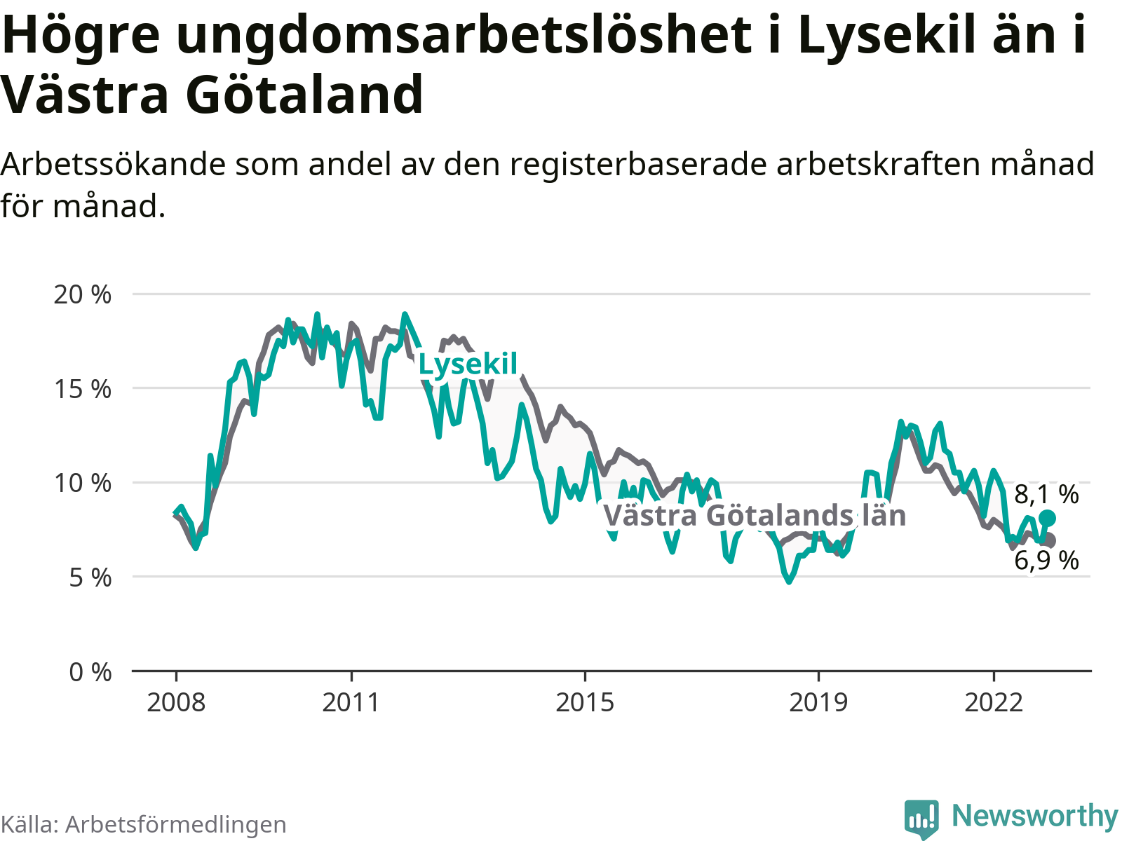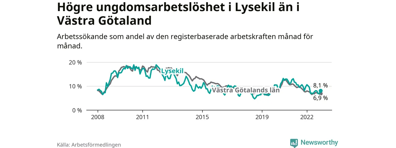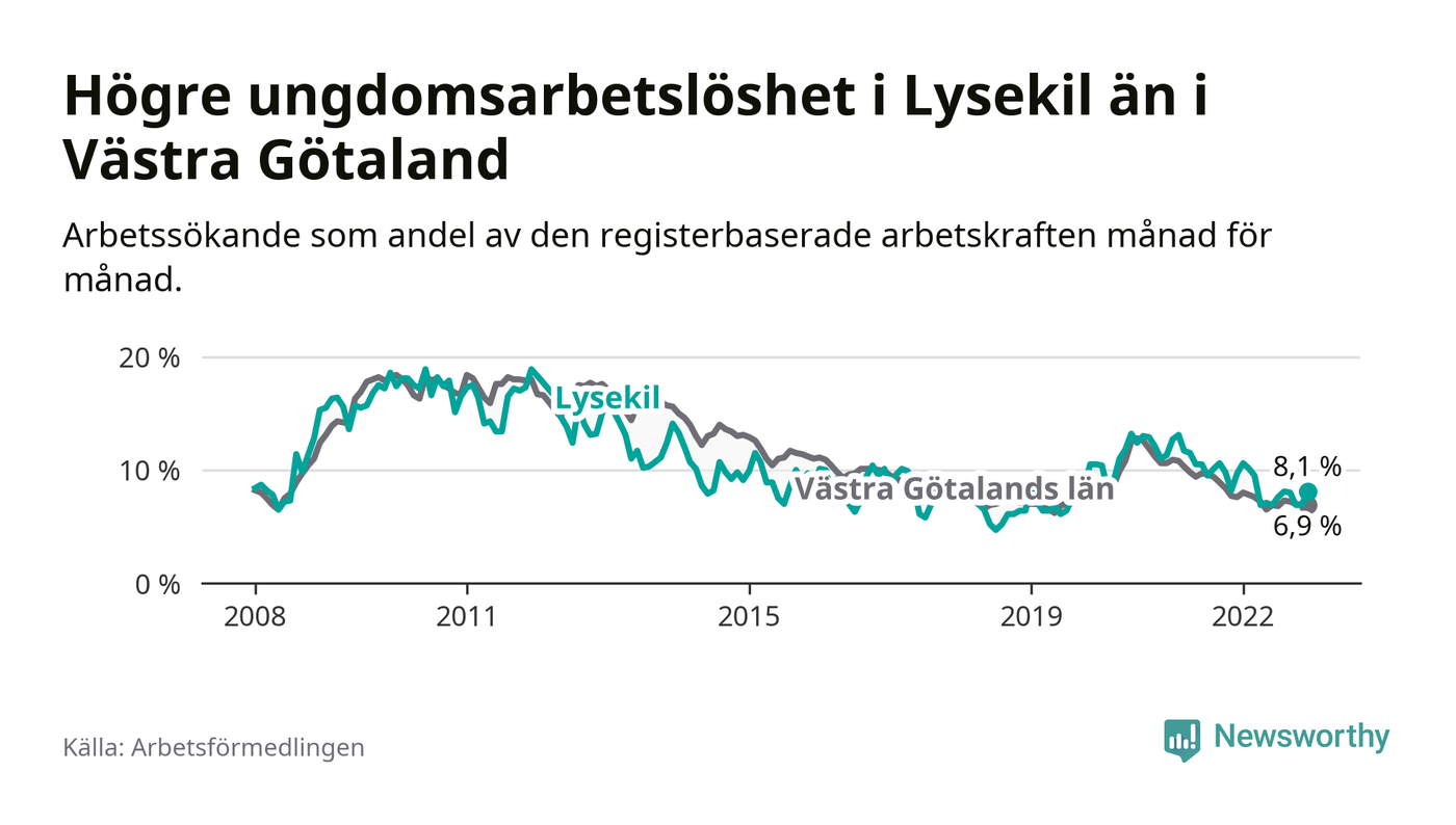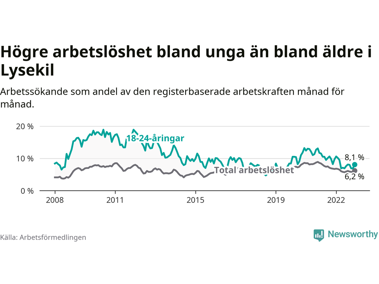 Precis som den totala arbetslösheten ligger ungdomsarbetslösheten i Lysekil högre än i Västra Götaland som helhet. Skillnaden mellan kommunen och länet är 1,2 procentenheter.