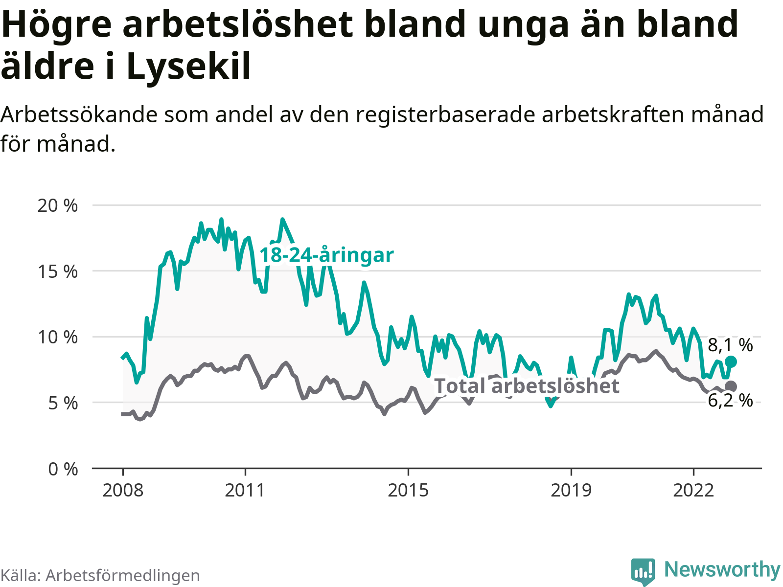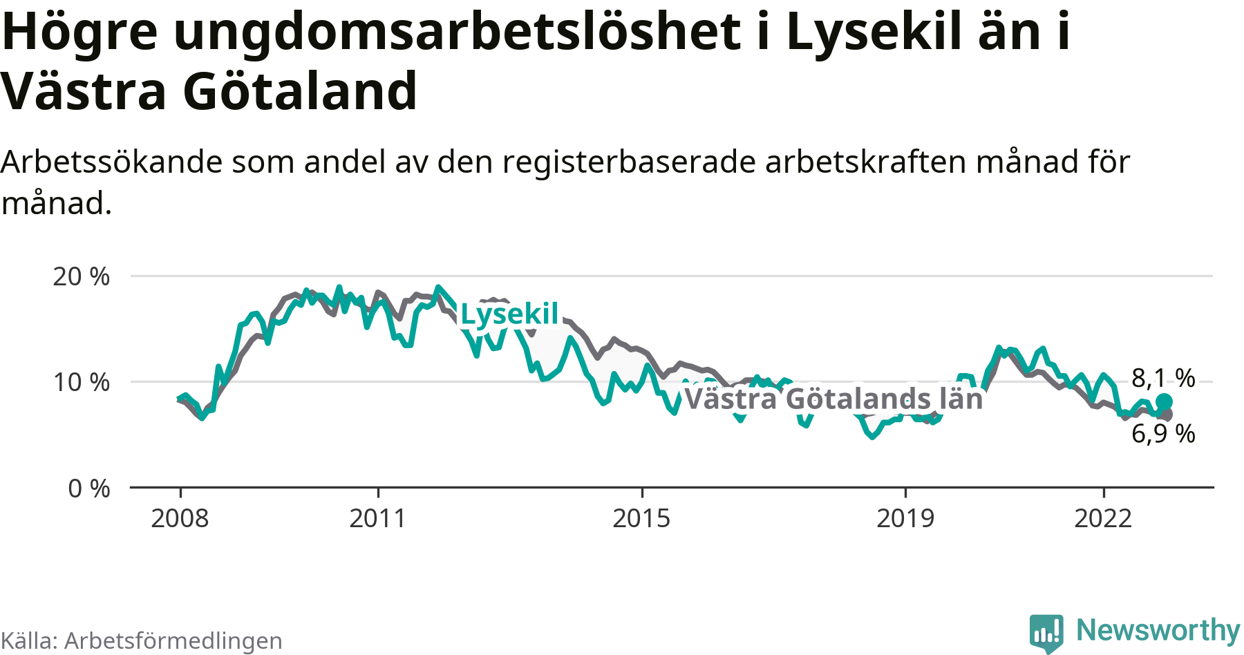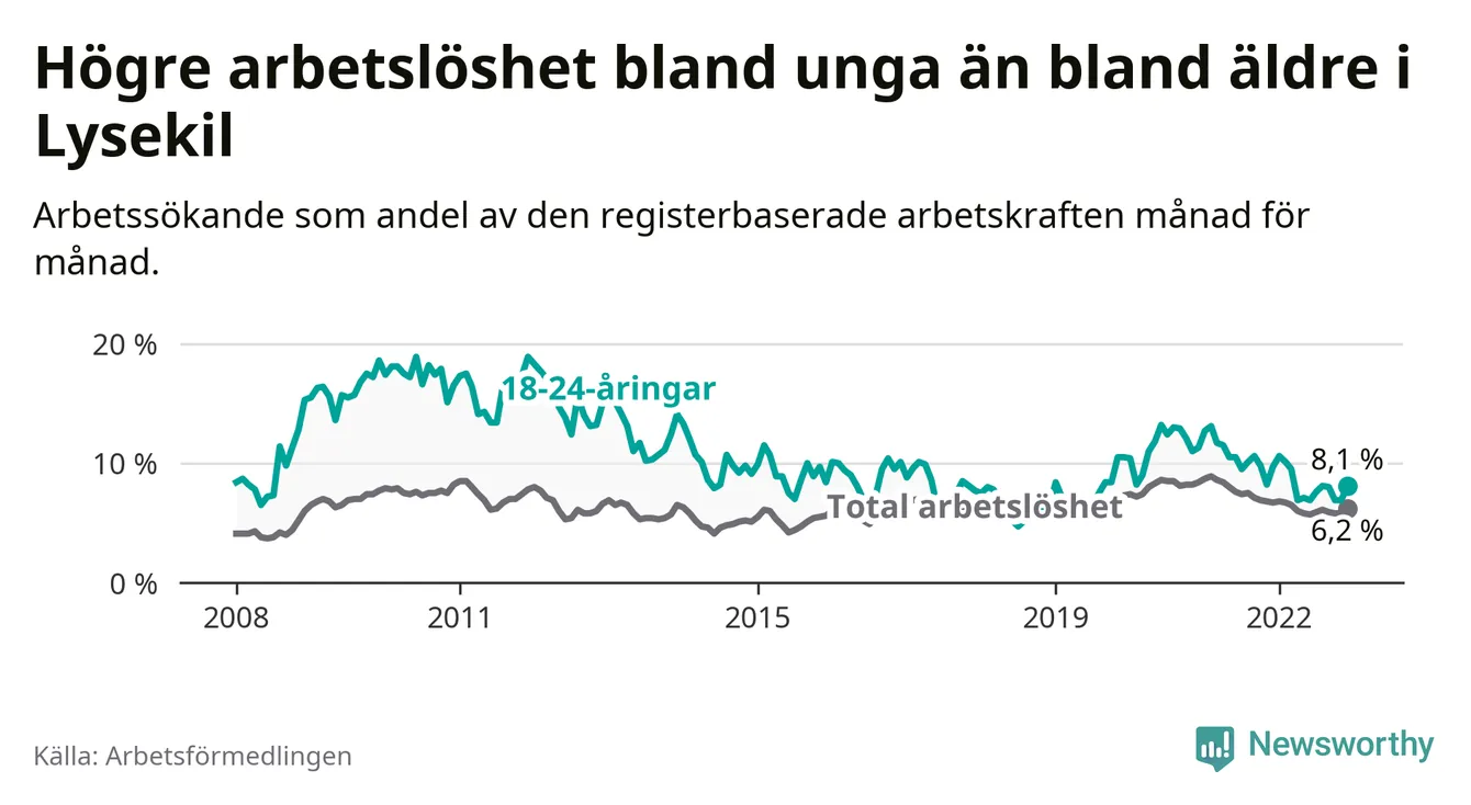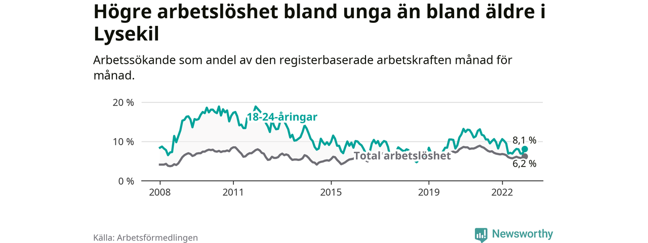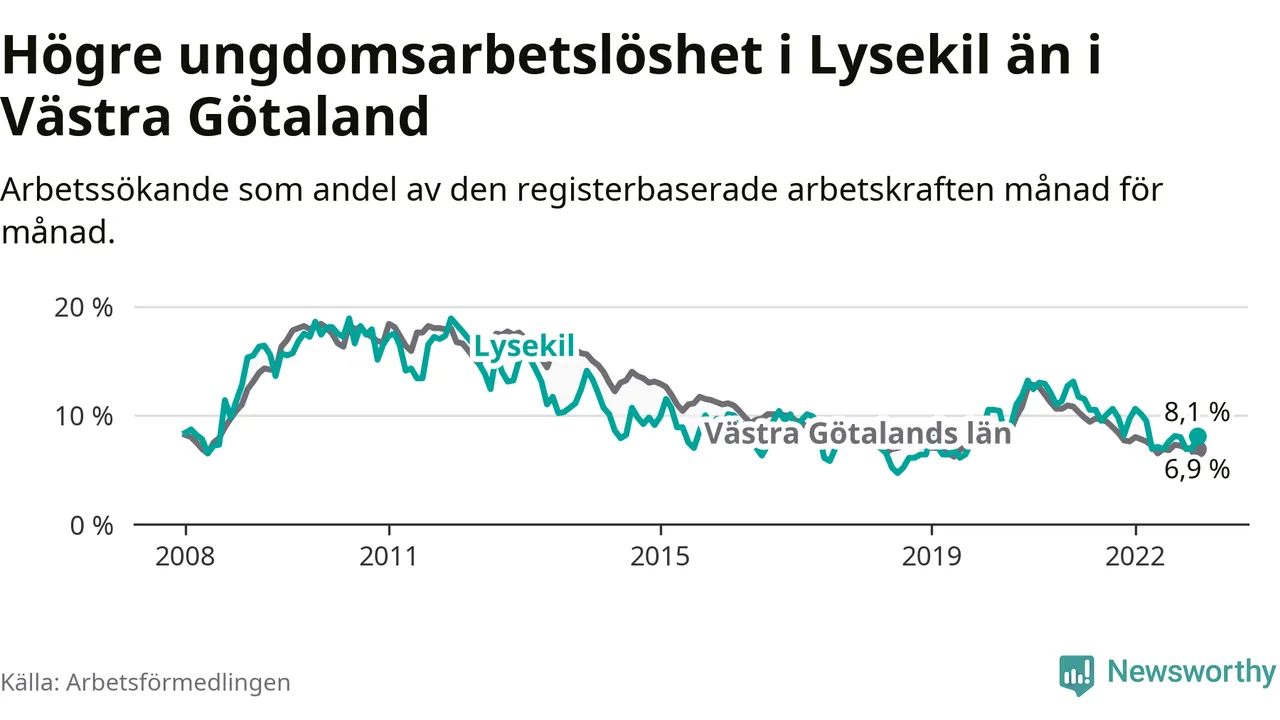 Precis som den totala arbetslösheten ligger ungdomsarbetslösheten i Lysekil högre än i Västra Götaland som helhet. Skillnaden mellan kommunen och länet är 1,2 procentenheter.