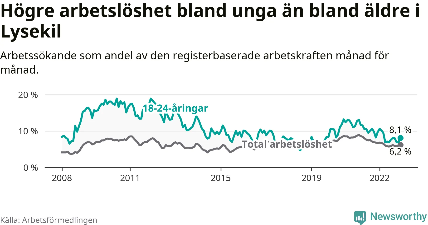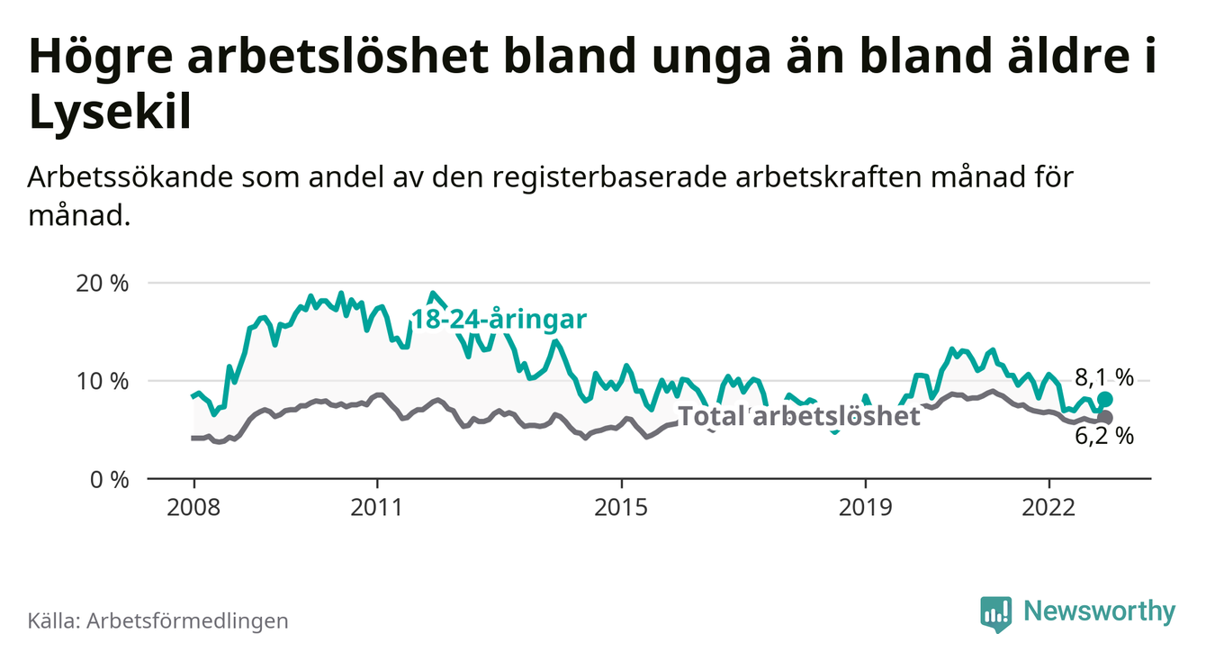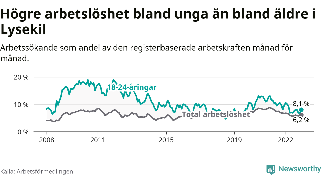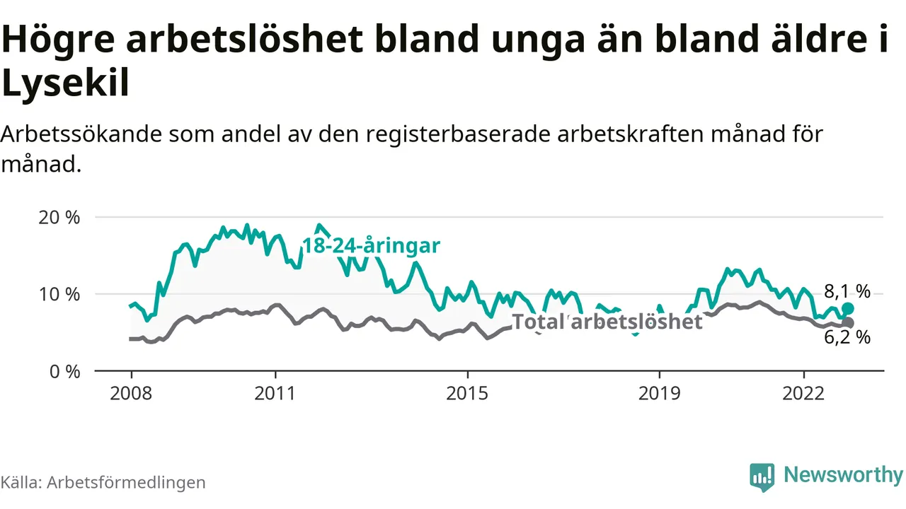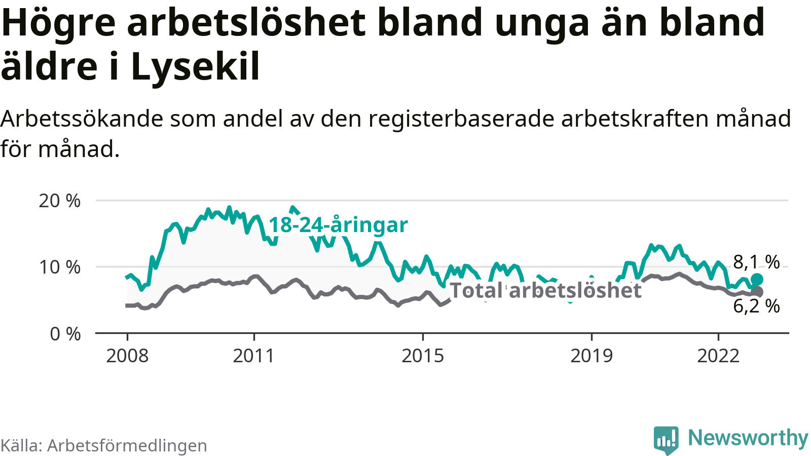 Precis som den totala arbetslösheten ligger ungdomsarbetslösheten i Lysekil högre än i Västra Götaland som helhet. Skillnaden mellan kommunen och länet är 1,2 procentenheter.