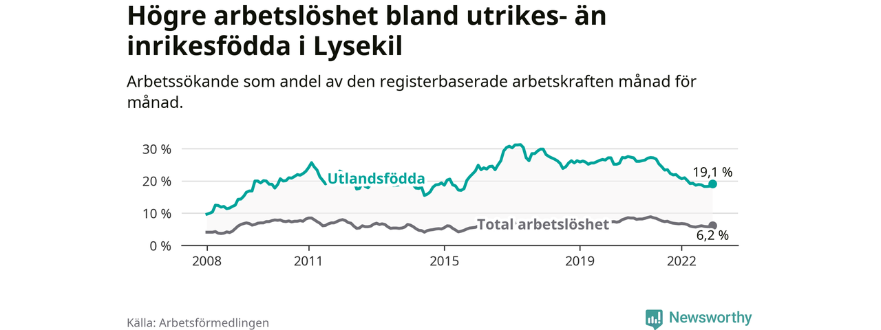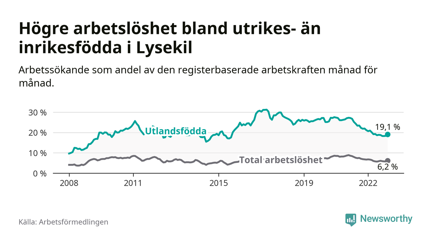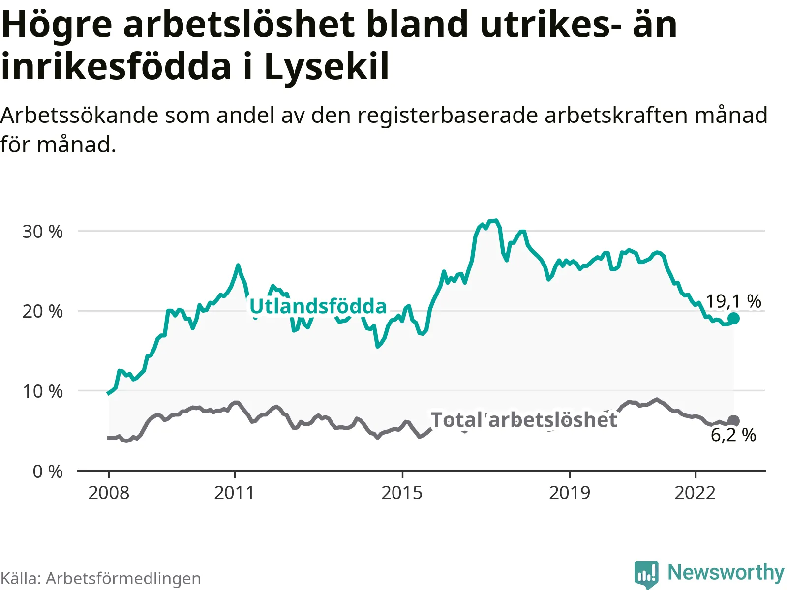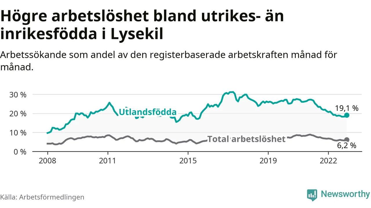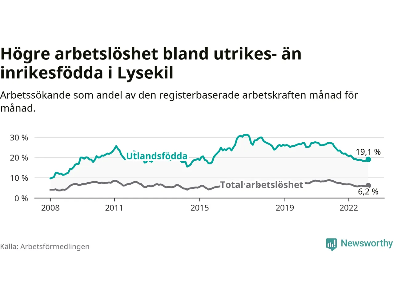 Skillnaden i arbetslöshet mellan utrikesfödda och hela befolkningen är 12,9 procentenheter i Lysekil. Det är en betydligt mindre skillnad än för ett år sedan (−1,6 procentenheter).