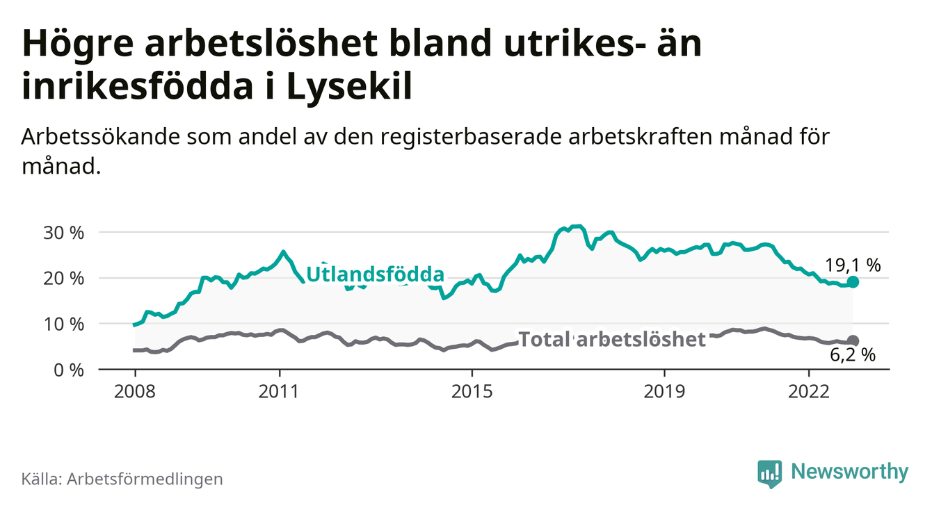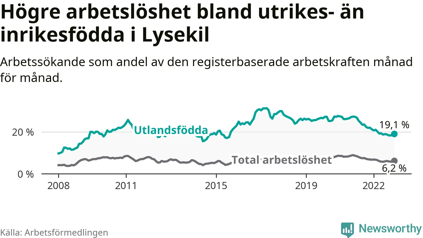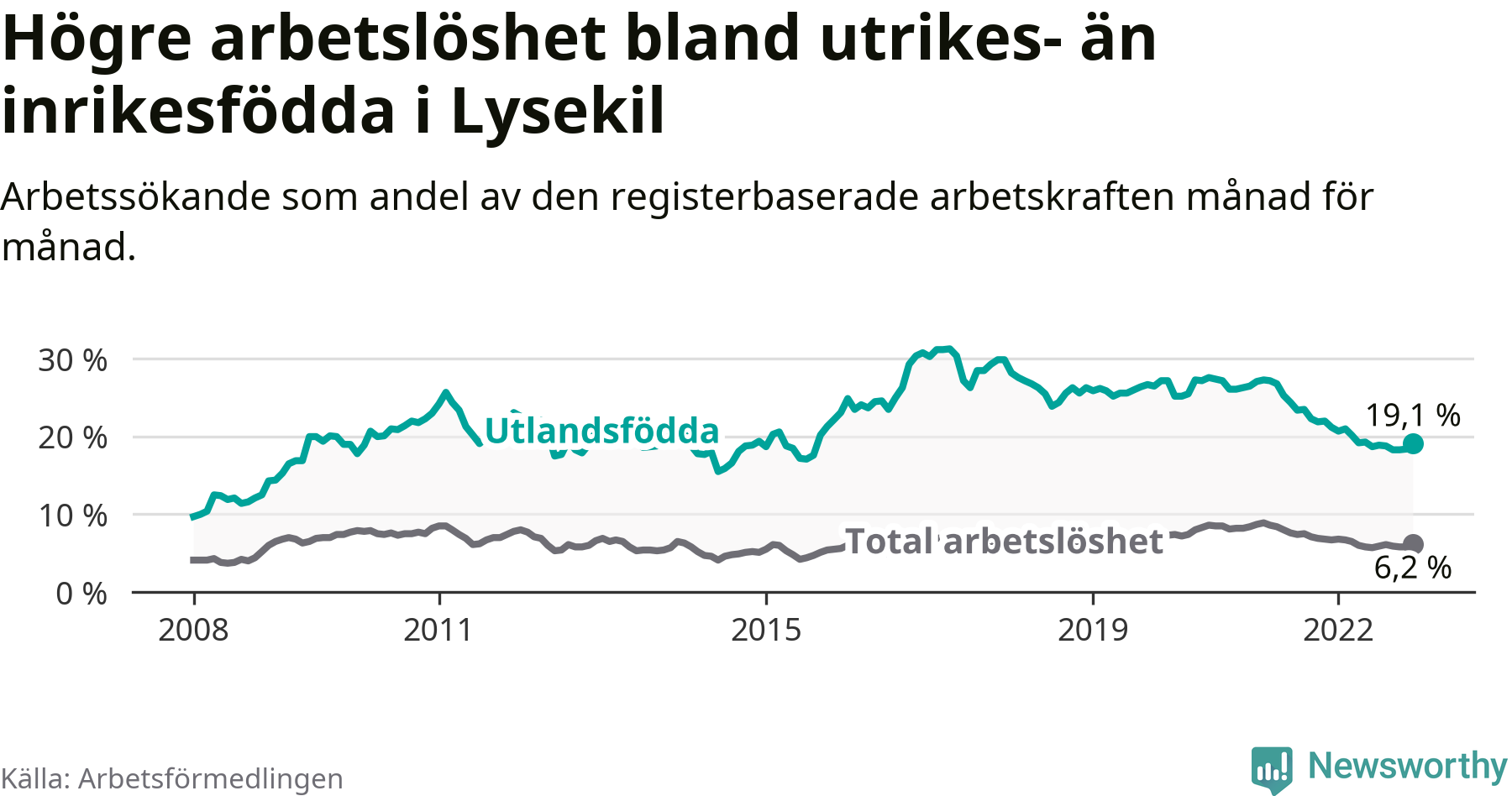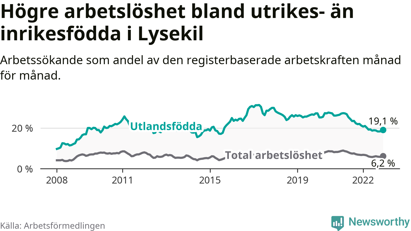 Skillnaden i arbetslöshet mellan utrikesfödda och hela befolkningen är 12,9 procentenheter i Lysekil. Det är en betydligt mindre skillnad än för ett år sedan (−1,6 procentenheter).