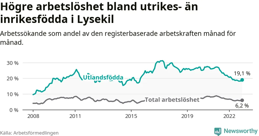 Arbetslösheten bland utlandsfödda var 19,1 procent i Lysekil under december månad, motsvarande 191 av 1 000 personer. Det är 2,1 procentenheter färre än vid samma tidpunkt i fjol (−29 om man räknar personer). Därmed är de utlandsföddas arbetslöshet lägre än vid samma tidpunkt i fjol för 21:a månaden i följd. Sedan mars 2021 har arbetslösheten bland utlandsfödda minskat från 27,2 till 19,1 procent.
