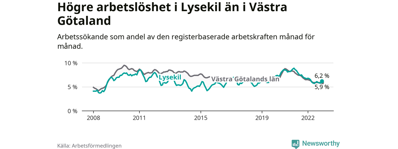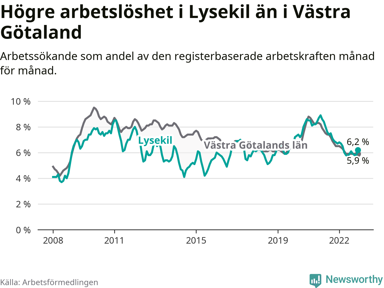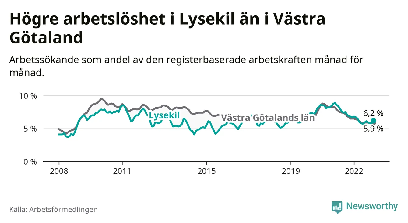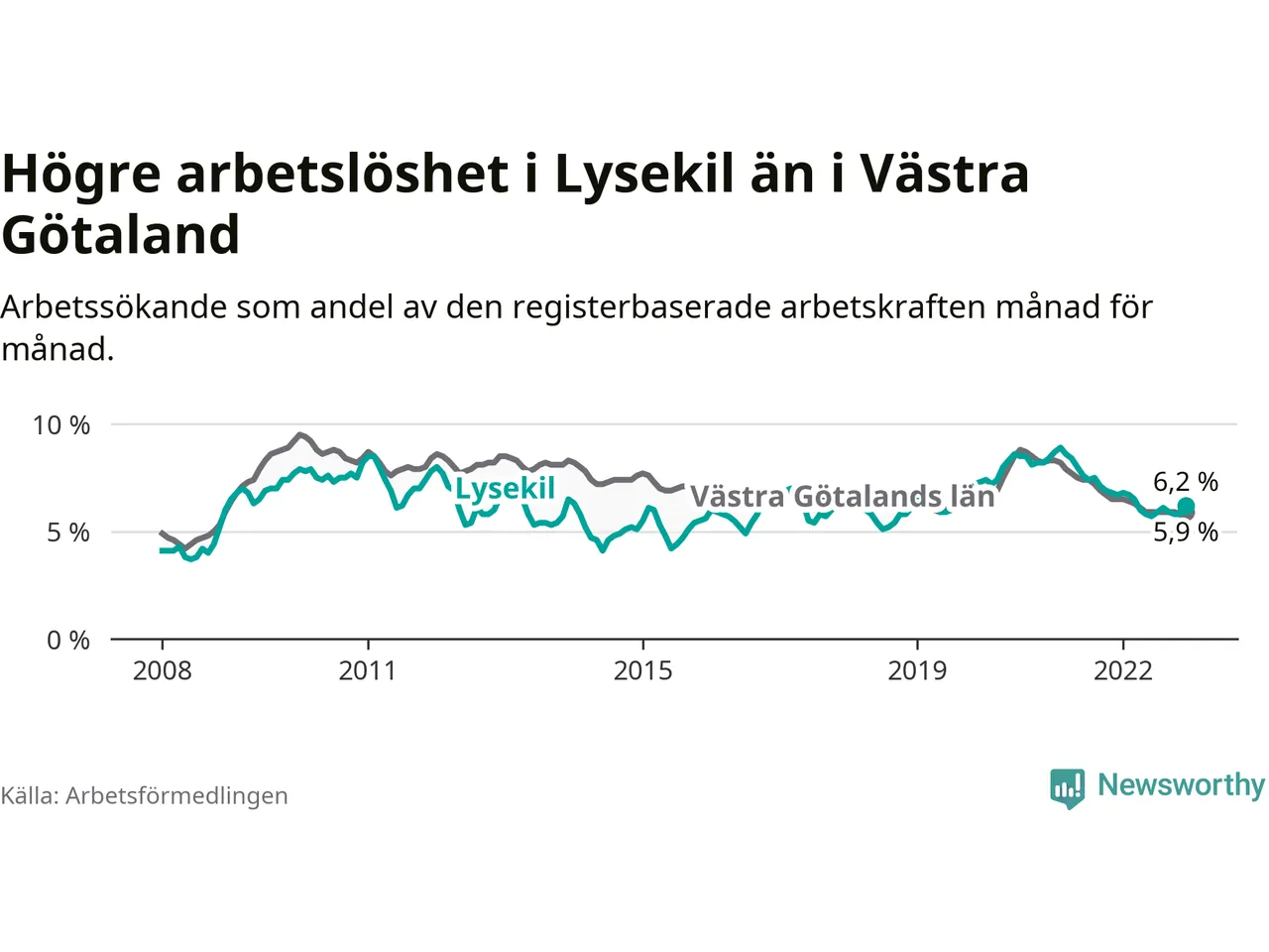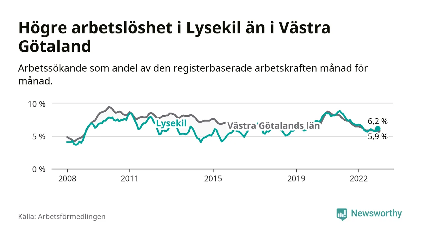 Även om arbetslösheten i Lysekil alltså minskar, så ligger den fortfarande över snittet i hela Västra Götalands län (6,2 procent i kommunen, jämfört med 5,9 procent i hela länet). Tjörn och Öckerö har den lägsta arbetslösheten i länet (2,6 procent), medan Trollhättan har den högsta (9,1 procent). För att Lysekil skulle komma ner i samma arbetslöshetsnivå som Tjörn och Öckerö skulle 219 personer behöva sysselsättas.