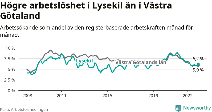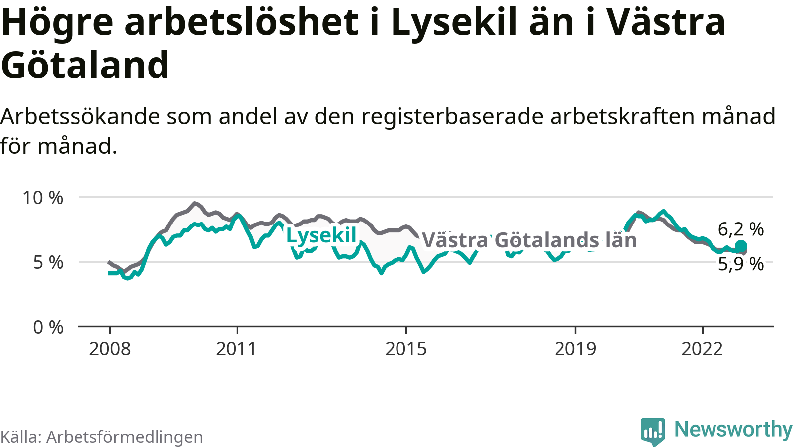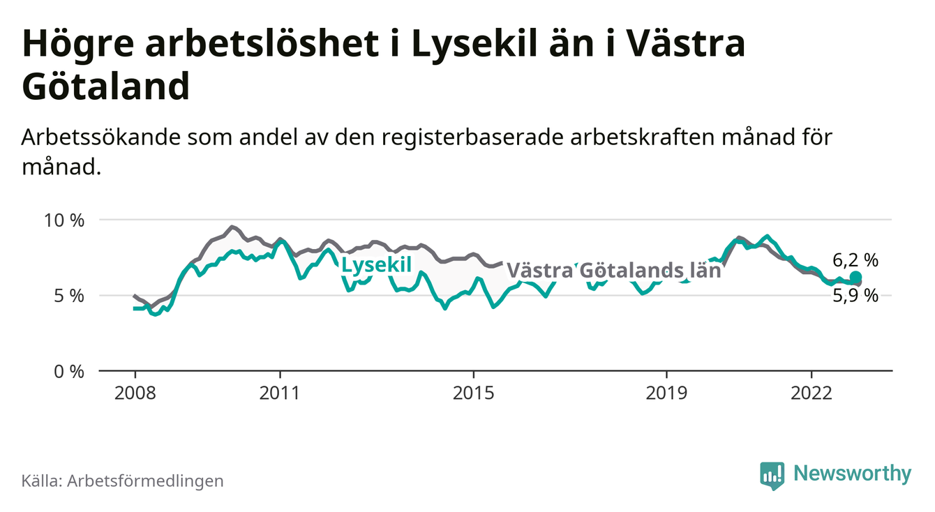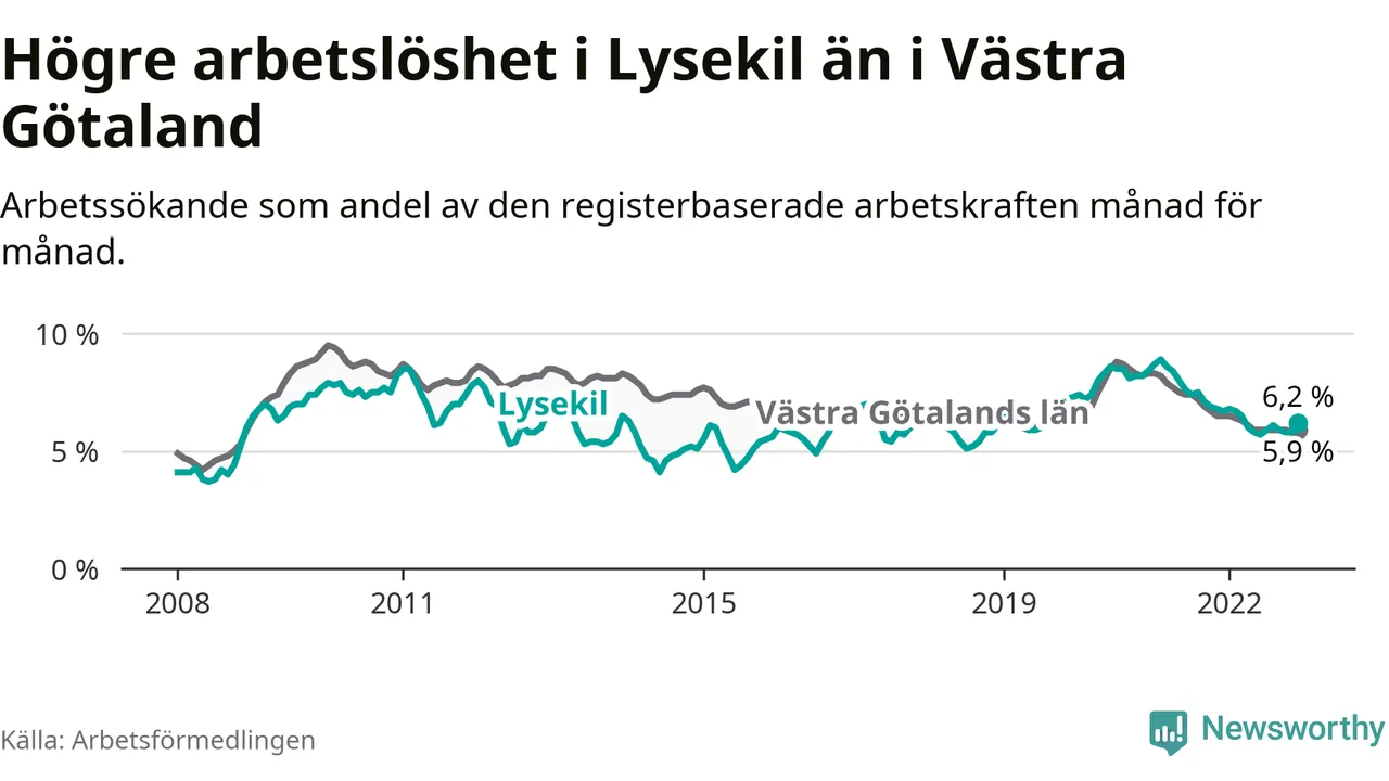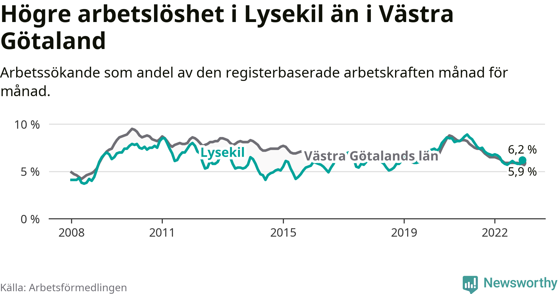 Även om arbetslösheten i Lysekil alltså minskar, så ligger den fortfarande över snittet i hela Västra Götalands län (6,2 procent i kommunen, jämfört med 5,9 procent i hela länet). Tjörn och Öckerö har den lägsta arbetslösheten i länet (2,6 procent), medan Trollhättan har den högsta (9,1 procent). För att Lysekil skulle komma ner i samma arbetslöshetsnivå som Tjörn och Öckerö skulle 219 personer behöva sysselsättas.